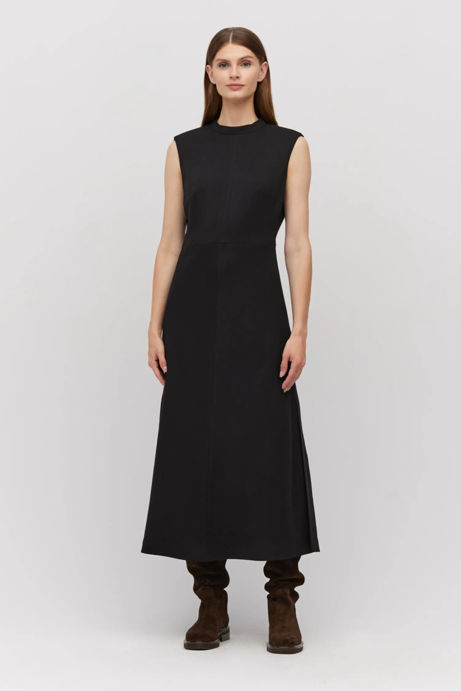 Sukienka z wełny jagnięcej na podszewce, z trapezowym dołem skrojonym ze skosu i rozcięciami po bokach. Ramiona subtelnie wzmocnione cienką poduszką ukrytą między tkaniną a podszewką. Kolor czarny. Długość midi.