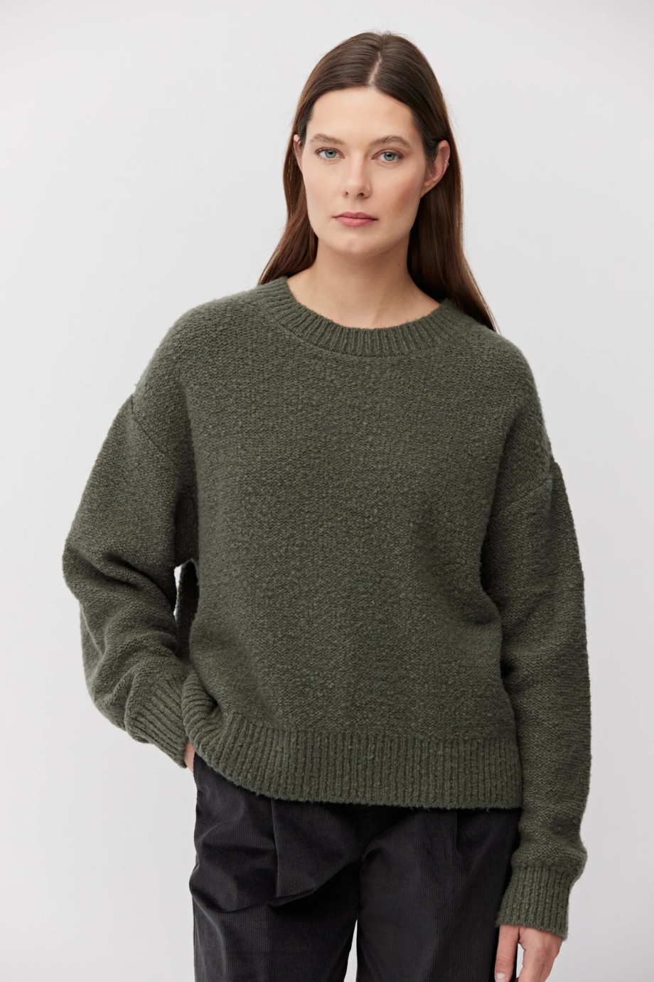 Sweter z wełny merynosowej. Okrągły dekolt, długi rękaw. Miękka dzianina o luźnym splocie single jersey, wykonana na maszynie o uigleniu 7 GG. Fason luźny. Kolor zielony.