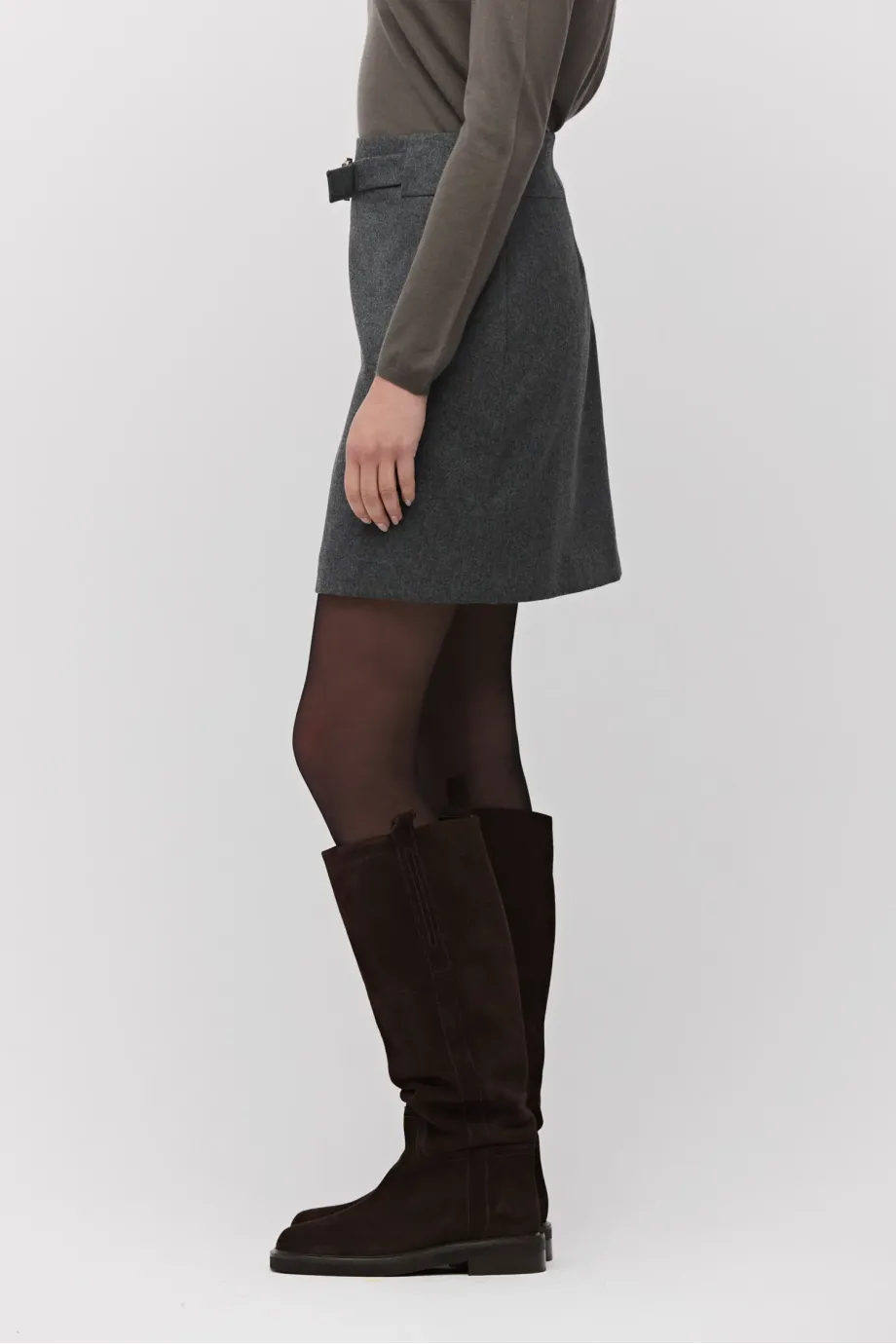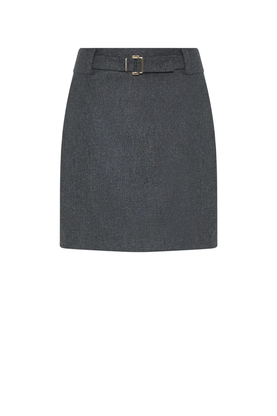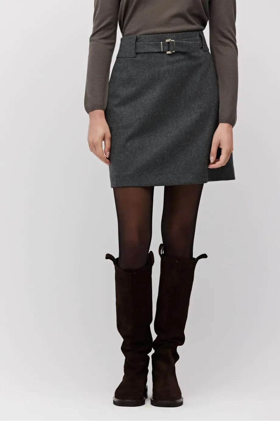 Ciemnoszara spódnica mini na podszewce. Tkanina z domieszką kaszmiru. W tali pasek. Zapinana na zamek z tyłu.