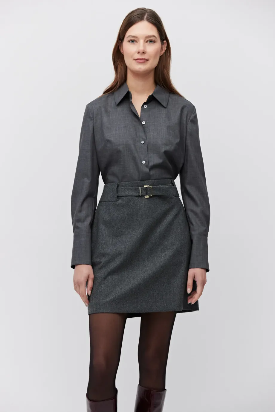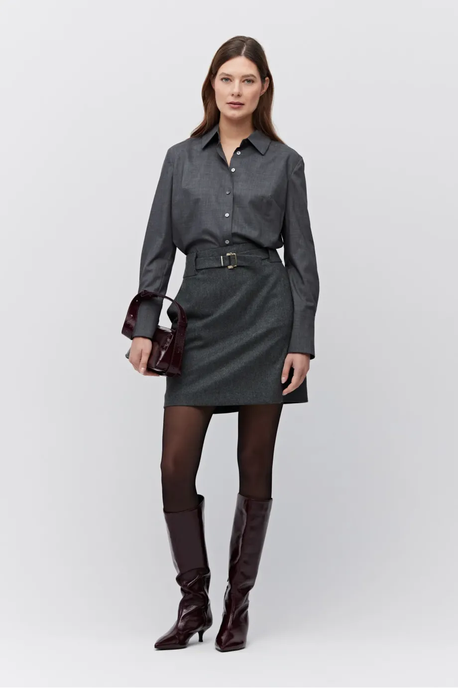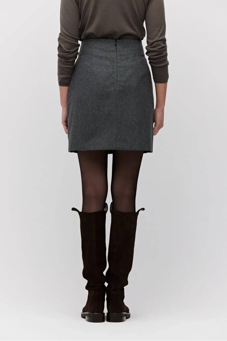 Ciemnoszara spódnica mini na podszewce. Tkanina z domieszką kaszmiru. W tali pasek. Zapinana na zamek z tyłu.