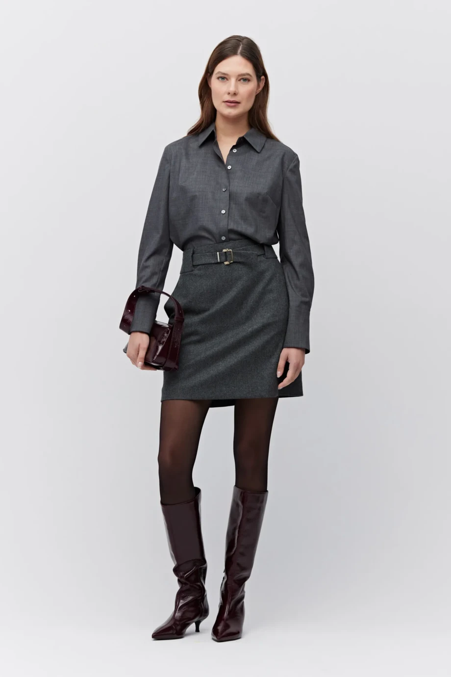 Szara spódnica mini, skrojona z mięsistego materiału z domieszką kaszmiru, jest propozycją, która zachwyca proporcjami. Gładka linia tyłu, bez rozcięć, podkreśla dopracowany krój, a pasek z tej samej tkaniny, zapinany na złotą klamrę, akcentuje talię bez ostentacji. Ten drobny, biżuteryjny detal dodaje projektowi elegancji. Forma i barwa modelu pozwalają na pełną dowolność stylizacyjną, od looku z kozakami po outfit ze sportowymi butami typu sneakers.