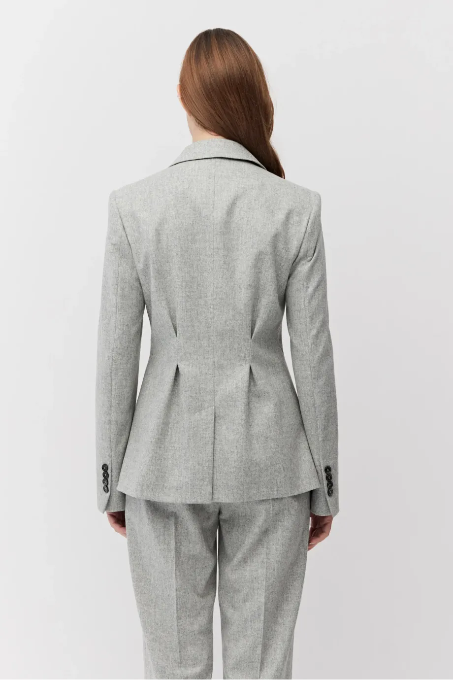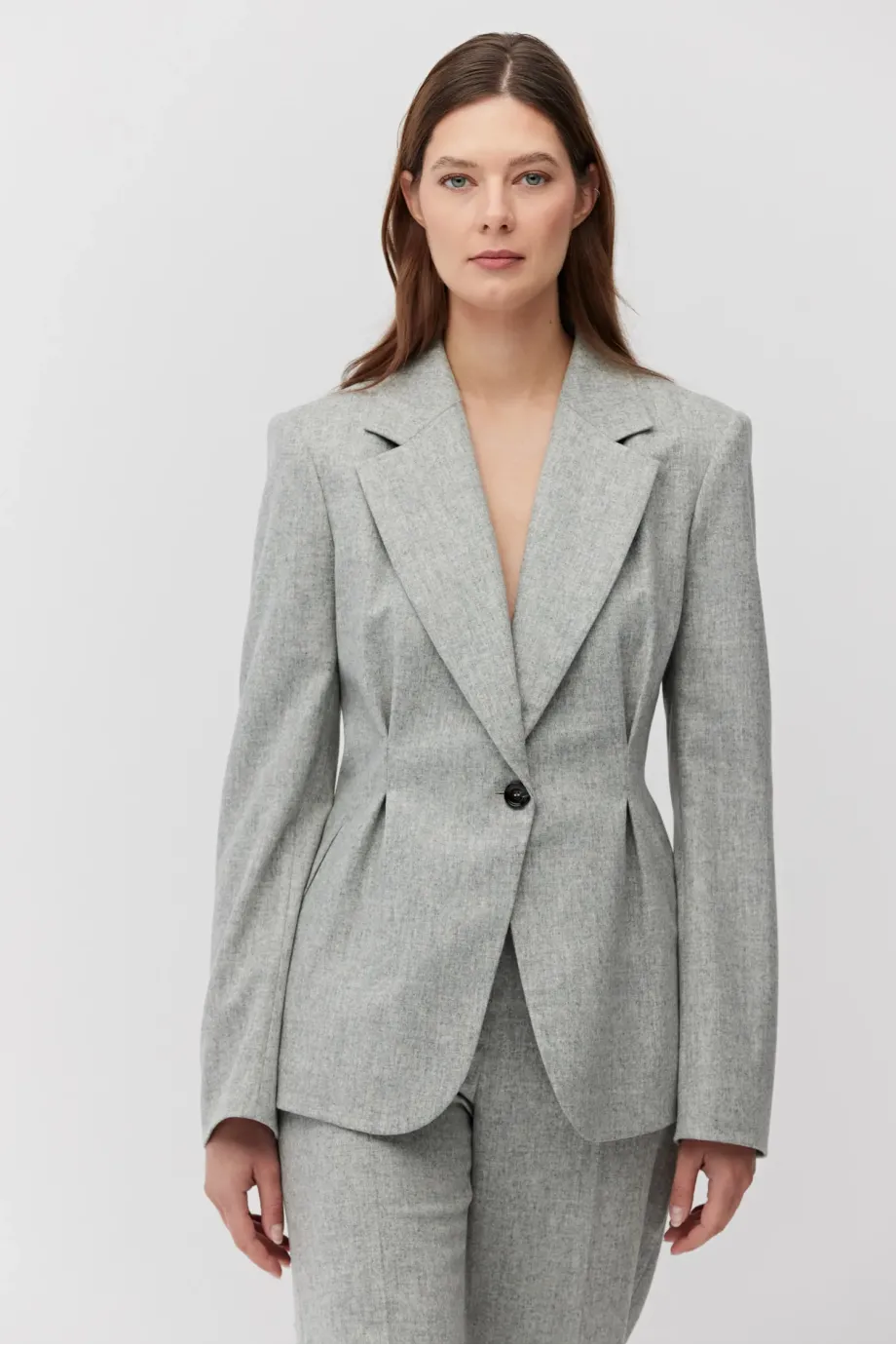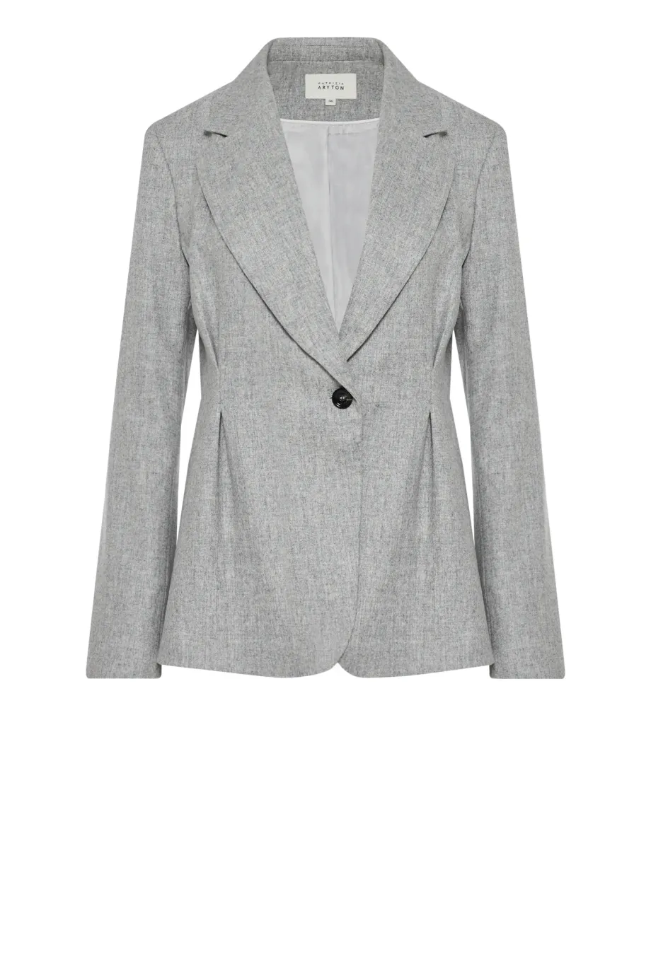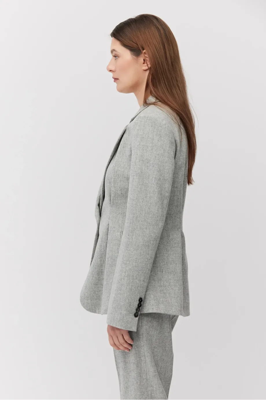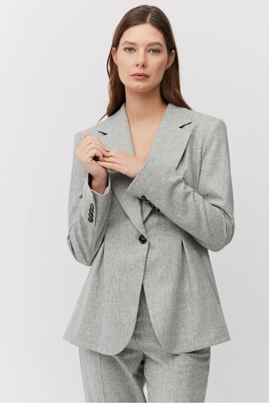 Żakiet do garnituru z kaszmirem. Jednorzędowy, taliowany, z zaznaczoną linią ramion. Długi rękaw. Model na podszewce, z ozdobnym pipingem. Kolor szary. Do zestawu spodnie z tej samej tkaniny.