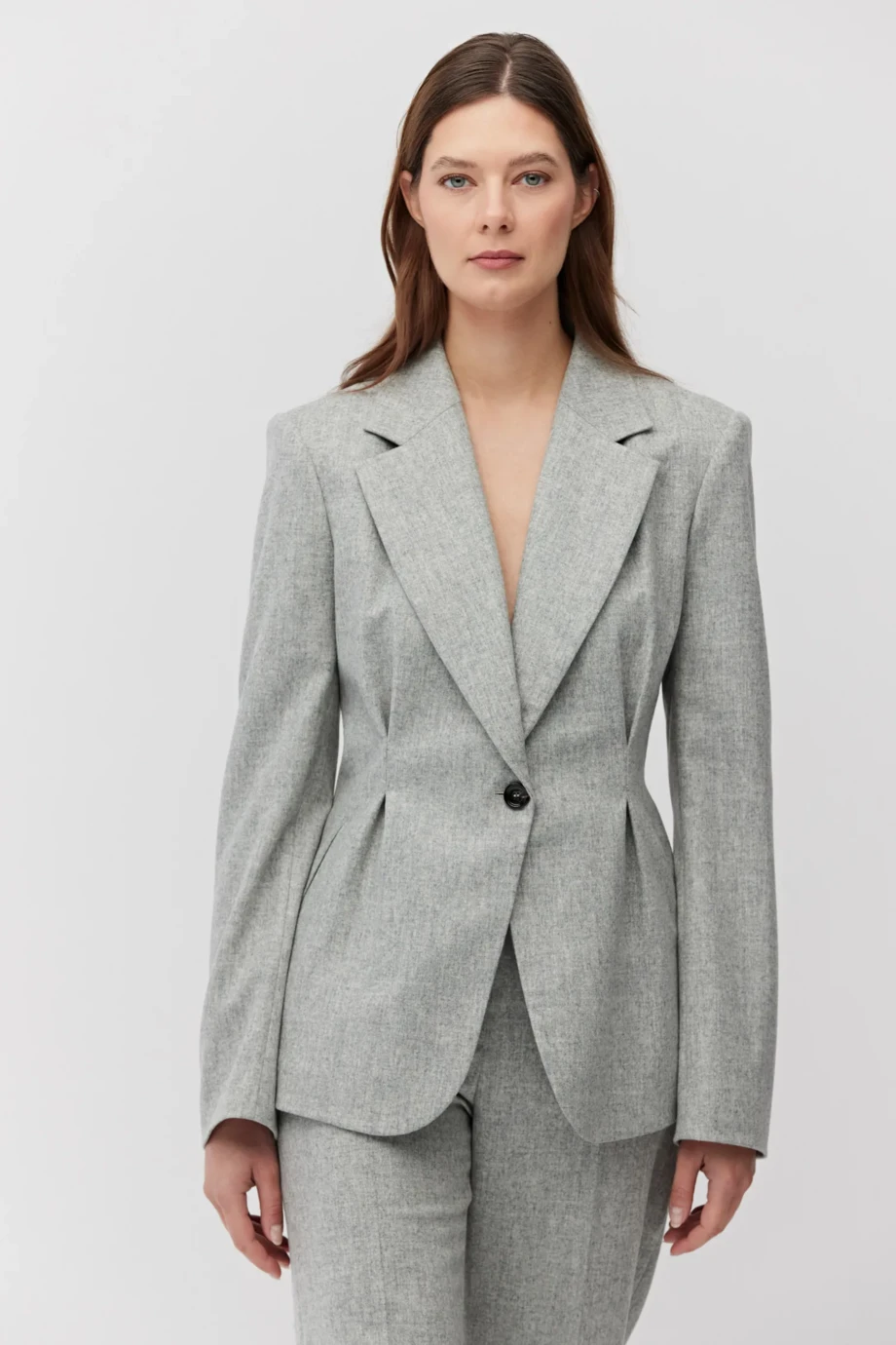 Kolor jasnoszary melanż łatwo zestawić z innymi odcieniami szarości, czernią czy bielą, a także z ciepłymi brązami, czerwienią, granatem i ciemną zielenią. Dzięki temu ten żakiet damski taliowany może być centralnym punktem garniturowego kompletu lub funkcjonować w miksie z innymi tkaninami, np. skórą, wełną czy jedwabiem. Noszony ze spodniami z tej samej tkaniny tworzy harmonijny garniturowy set, ale równie dobrze komponuje się z trapezową spódnicą czy casualowymi jeansami.