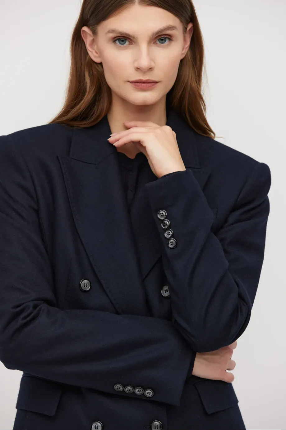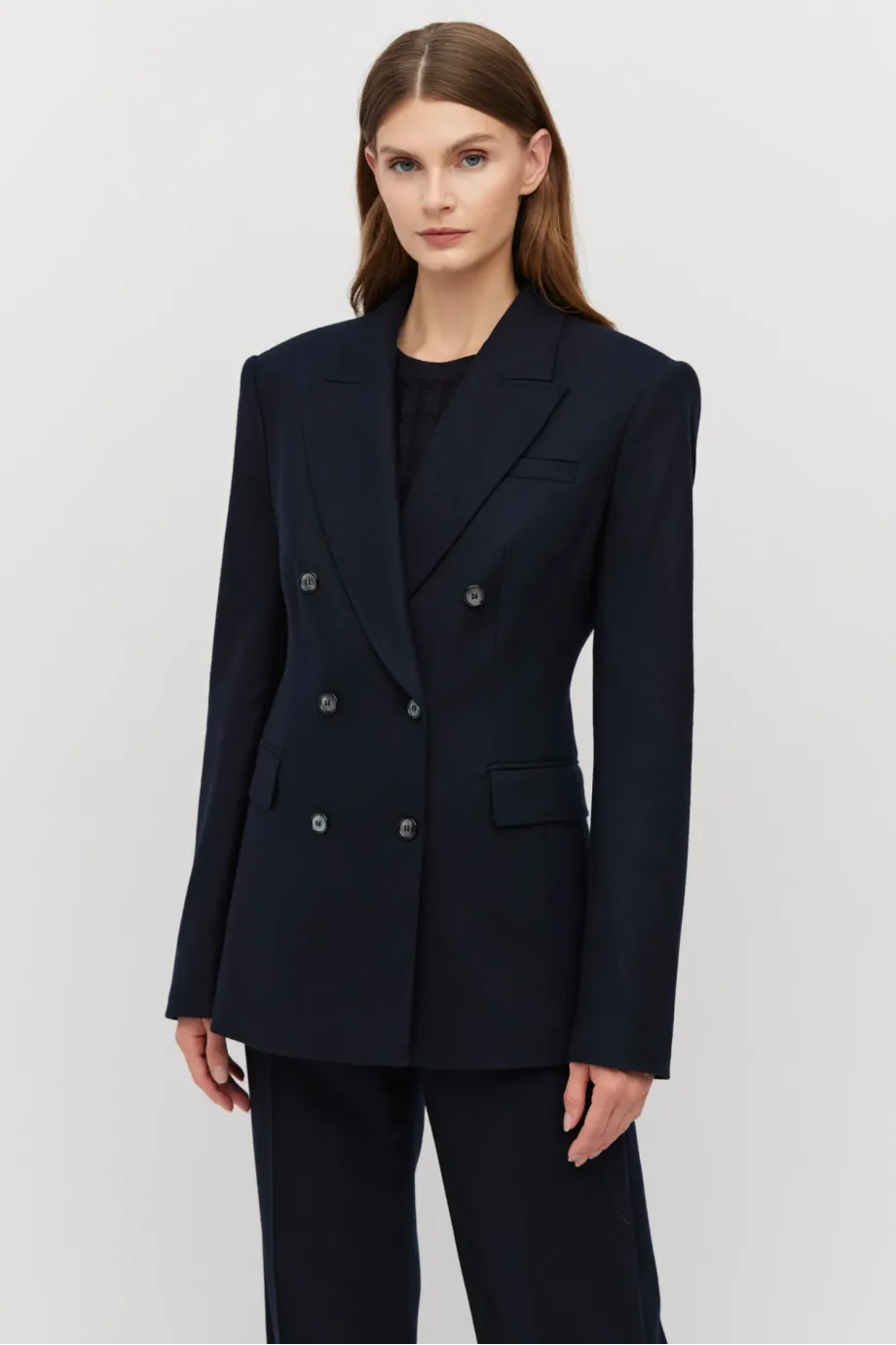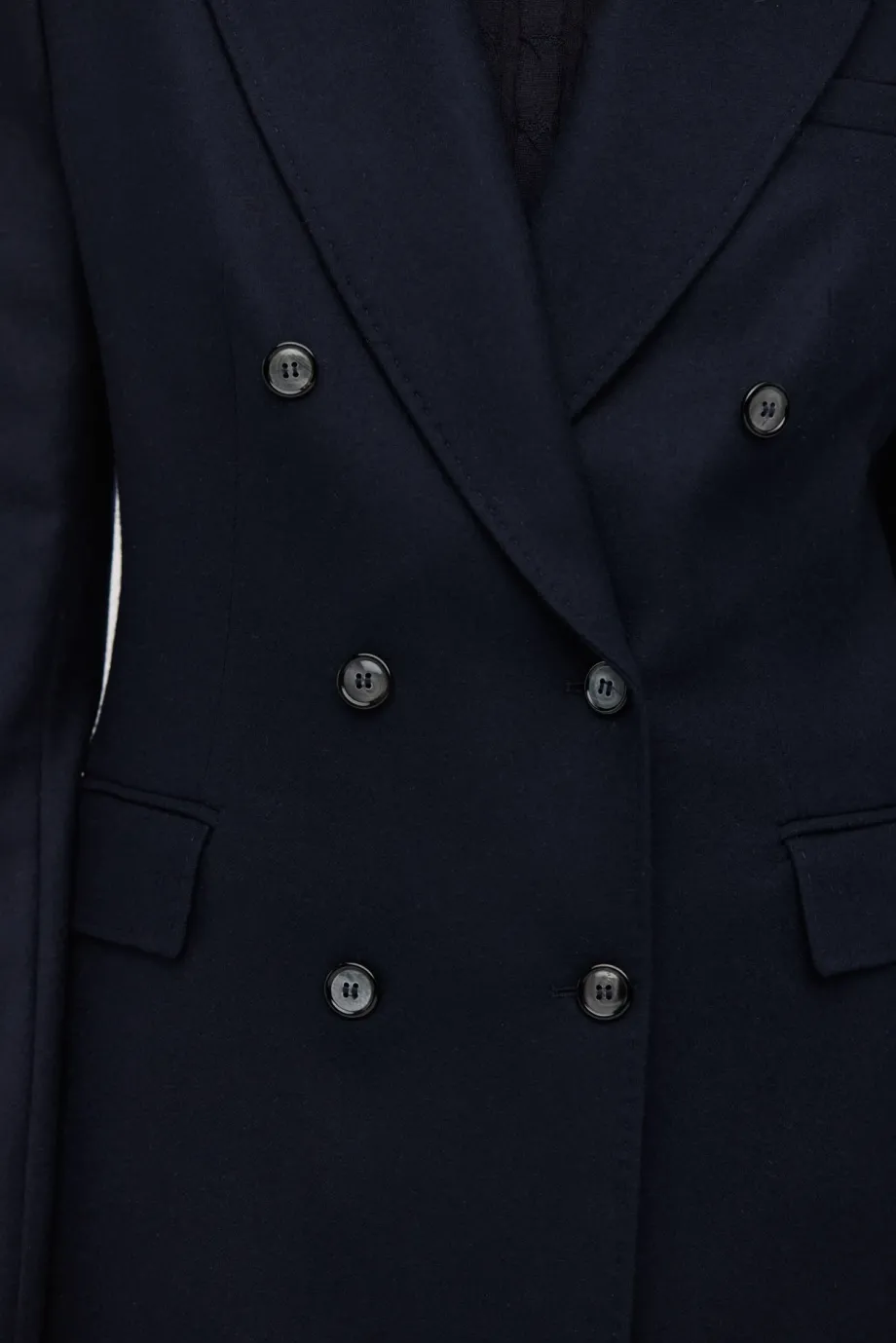 Żakiet do garnituru z kaszmirem. Dwurzędowy, taliowany, z zaznaczoną linią ramion. Długi rękaw, kieszenie. Model na podszewce, z ozdobnym pipingem. Kolor granatowy. Do zestawu spodnie z tej samej tkaniny.