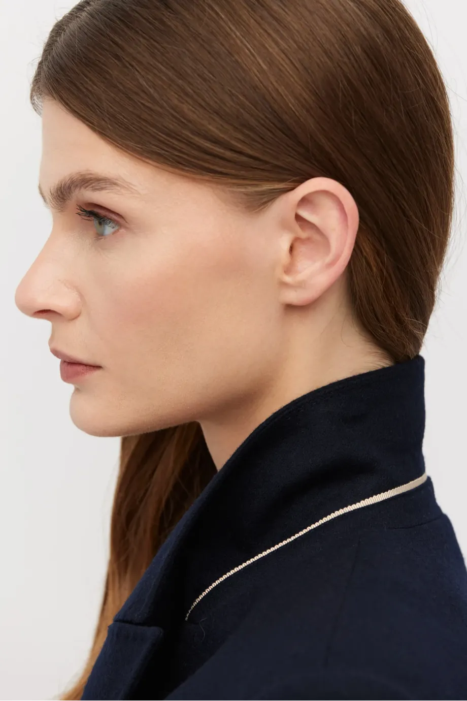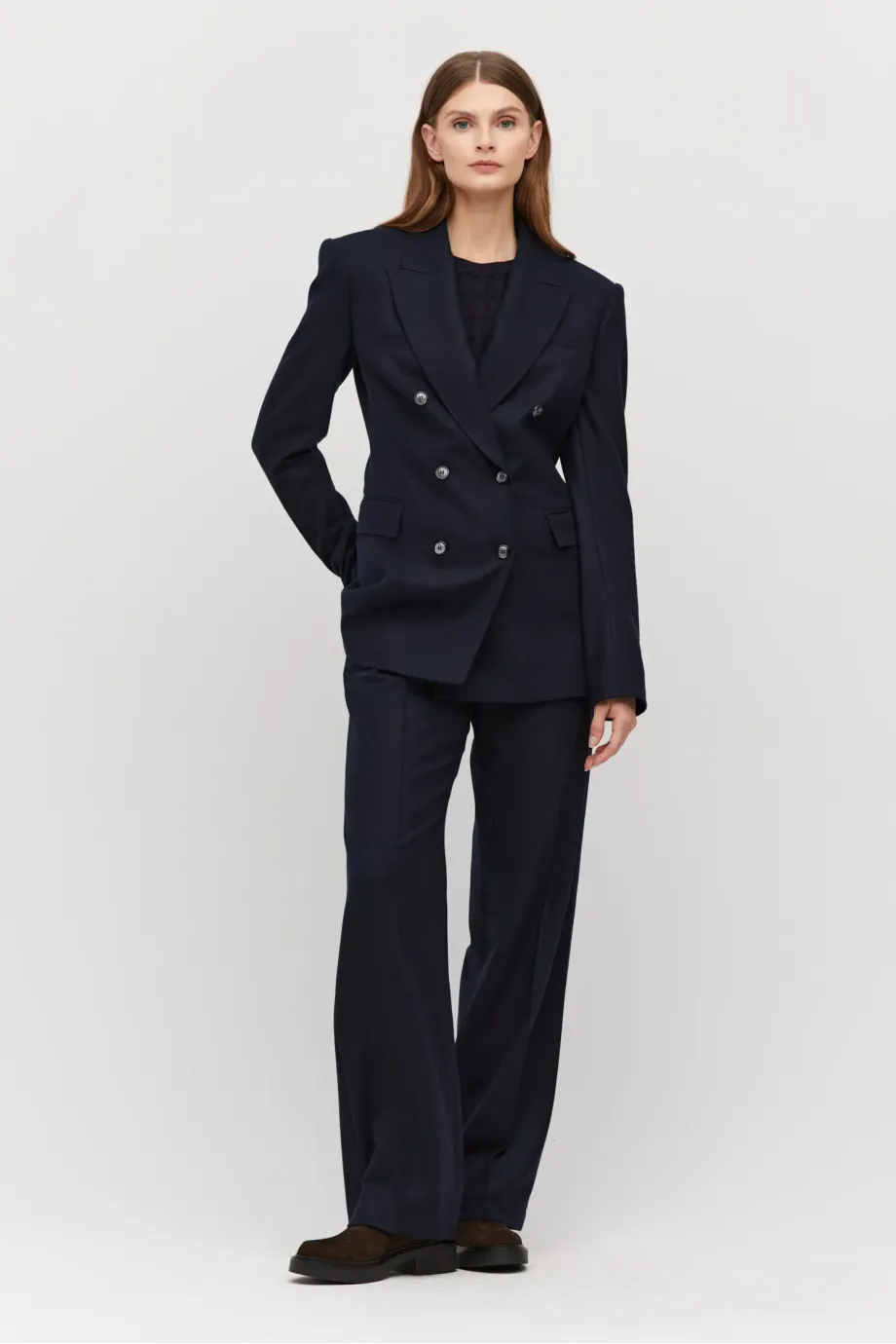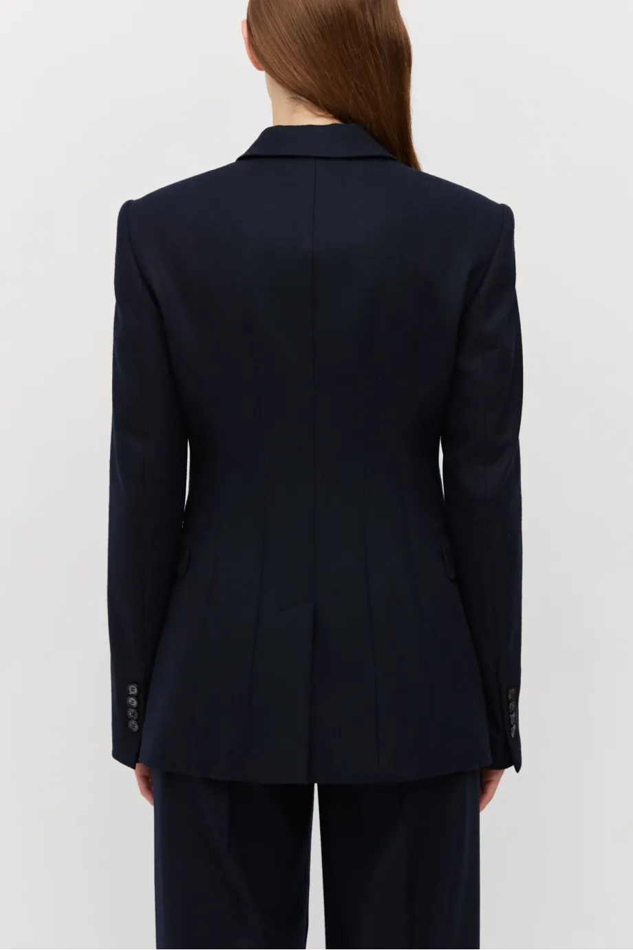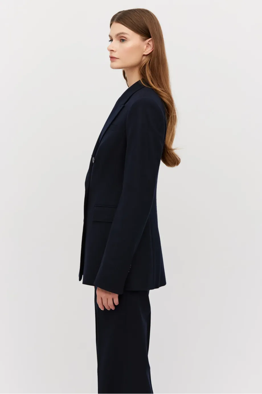 Żakiet do garnituru z kaszmirem. Dwurzędowy, taliowany, z zaznaczoną linią ramion. Długi rękaw, kieszenie. Model na podszewce, z ozdobnym pipingem. Kolor granatowy. Do zestawu spodnie z tej samej tkaniny.