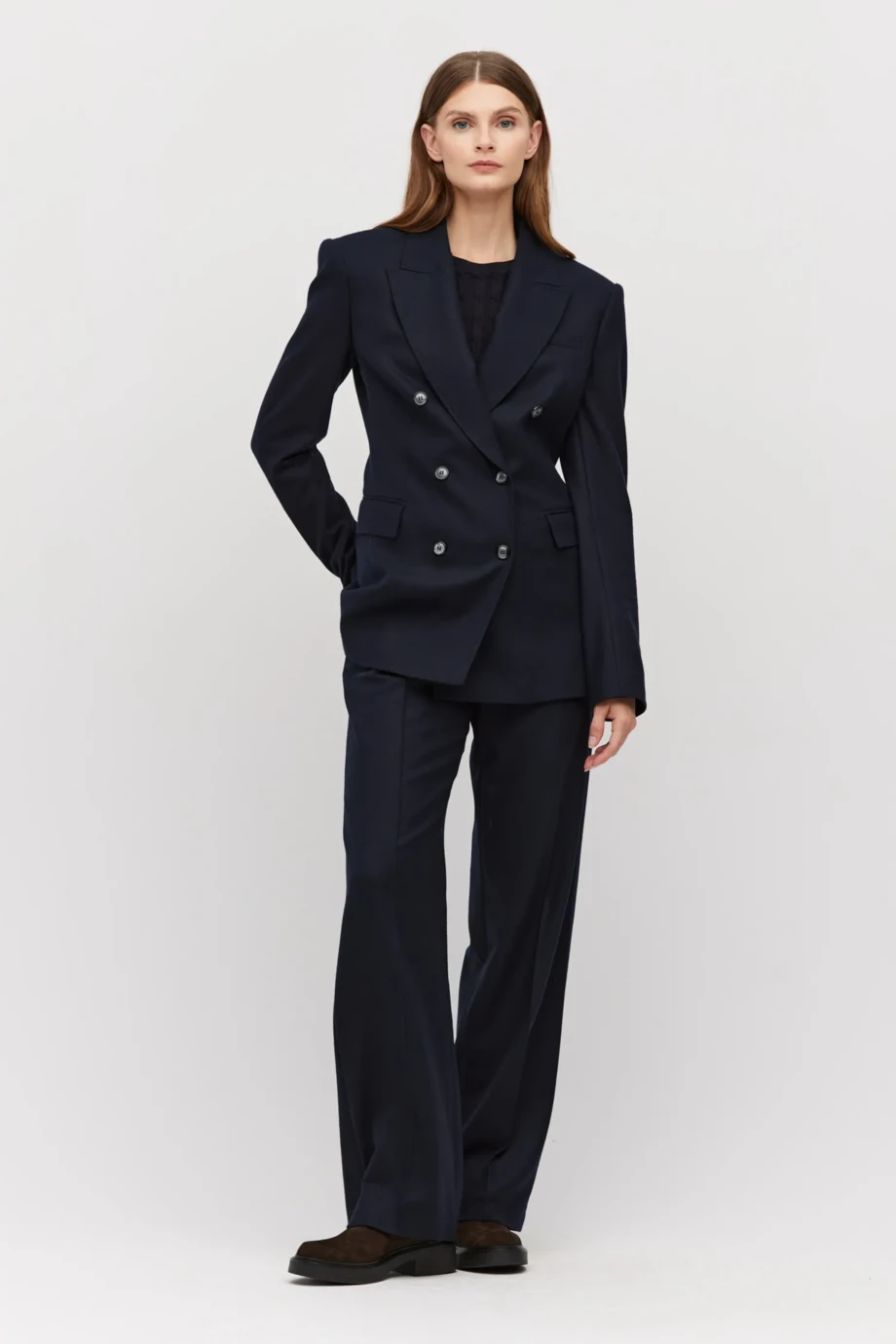Dwurzędowa konstrukcja przywołuje klasykę power dressing – styl, który decydująco zaznacza obecność w przestrzeni, wybierany m.in. przez Margaret Thatcher czy Hillary Clinton. Materiał i detale współpracują z ciałem: każdy ruch, każdy gest podkreślają proporcje sylwetki i elegancję w nienachalny wyrafinowany sposób. Głęboki granat, który wyróżnia ten żakiet do garnituru, świetnie komponuje się z taupe, śmietaną, brązem i czernią, odkrywając różne odcienie i charakter materiału w zależności od zestawienia. W tym sezonie, w dodatkach do granatowych ubrań warto używać też ciemnej czerwieni i zieleni.