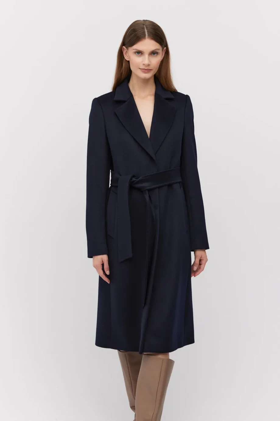 Granatowy płaszcz z paskiem. Fason bliżej ciała, na podszewce z ozdobnym pipingiem. Rękaw wstawiany, kieszenie.