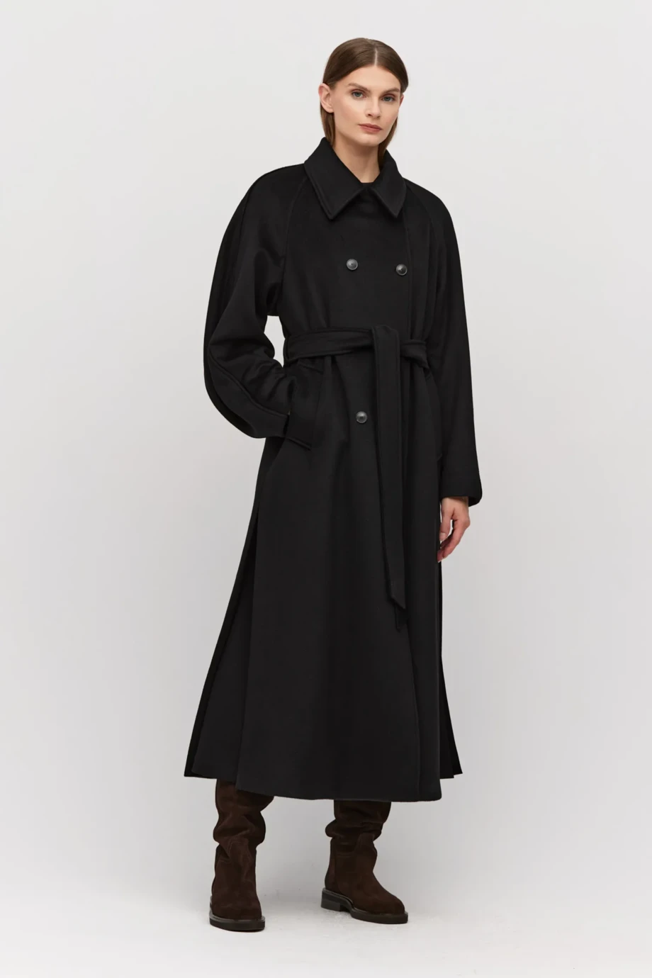 Czarny dwurzędowy płaszcz z domieszką jedwabiu i kaszmiru. Luźny fason z paskiem w talii, raglanowe rękawy, klasyczny kołnierz. Guziki z naturalnego rogu i orzecha, na podszewce z ozdobnym pipingiem.