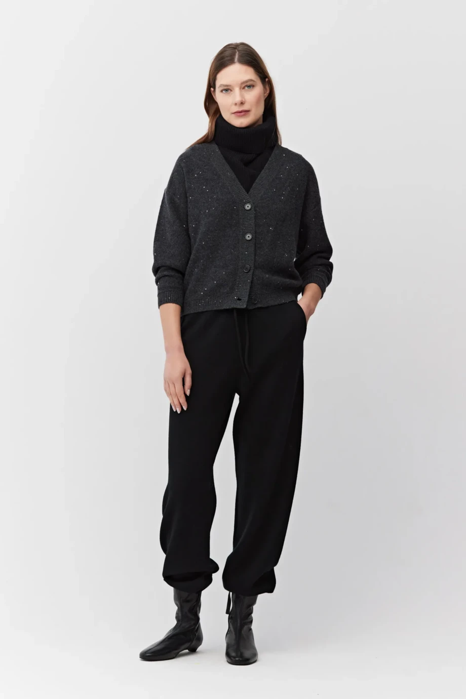 Kardigan z mieszanki wełny. Zapinany na naturalne guziki. Długi rękaw, dekolt w szpic. Wplecione luźno cekiny w kolorze srebra. Miękka dzianina, o splocie reverse jersey, wykonana na maszynie o uigleniu 7 GG. Kolor ciemna szarość.
