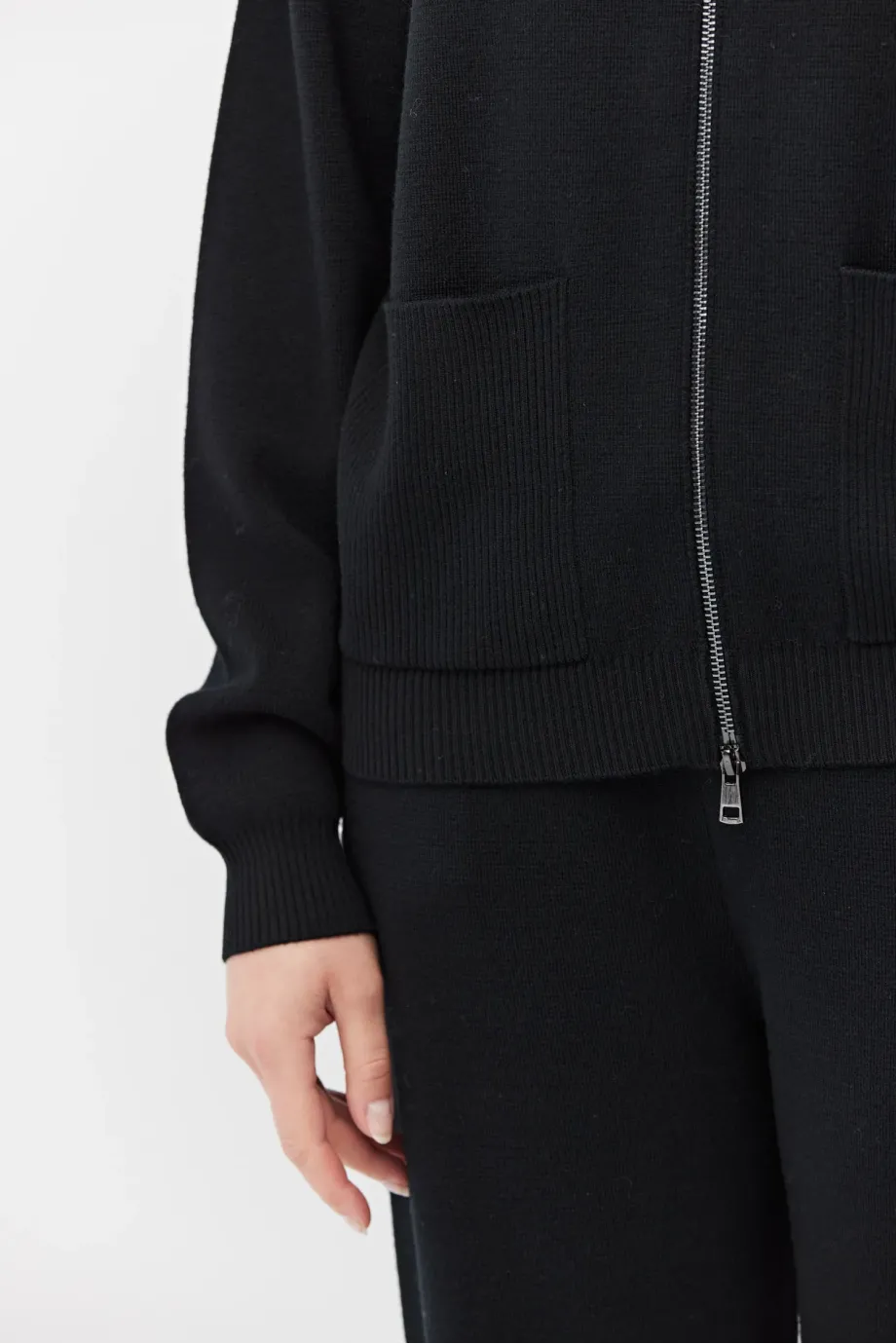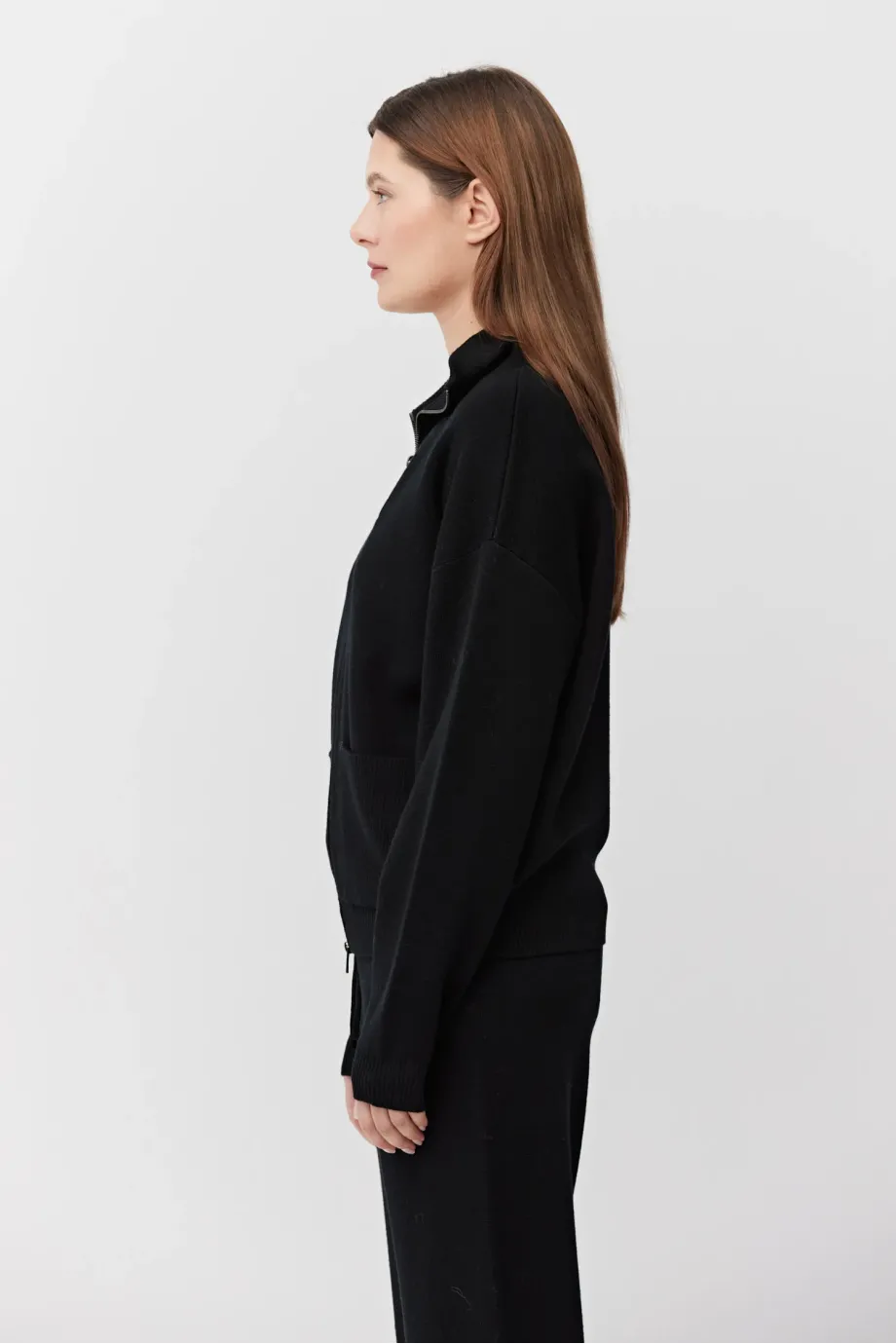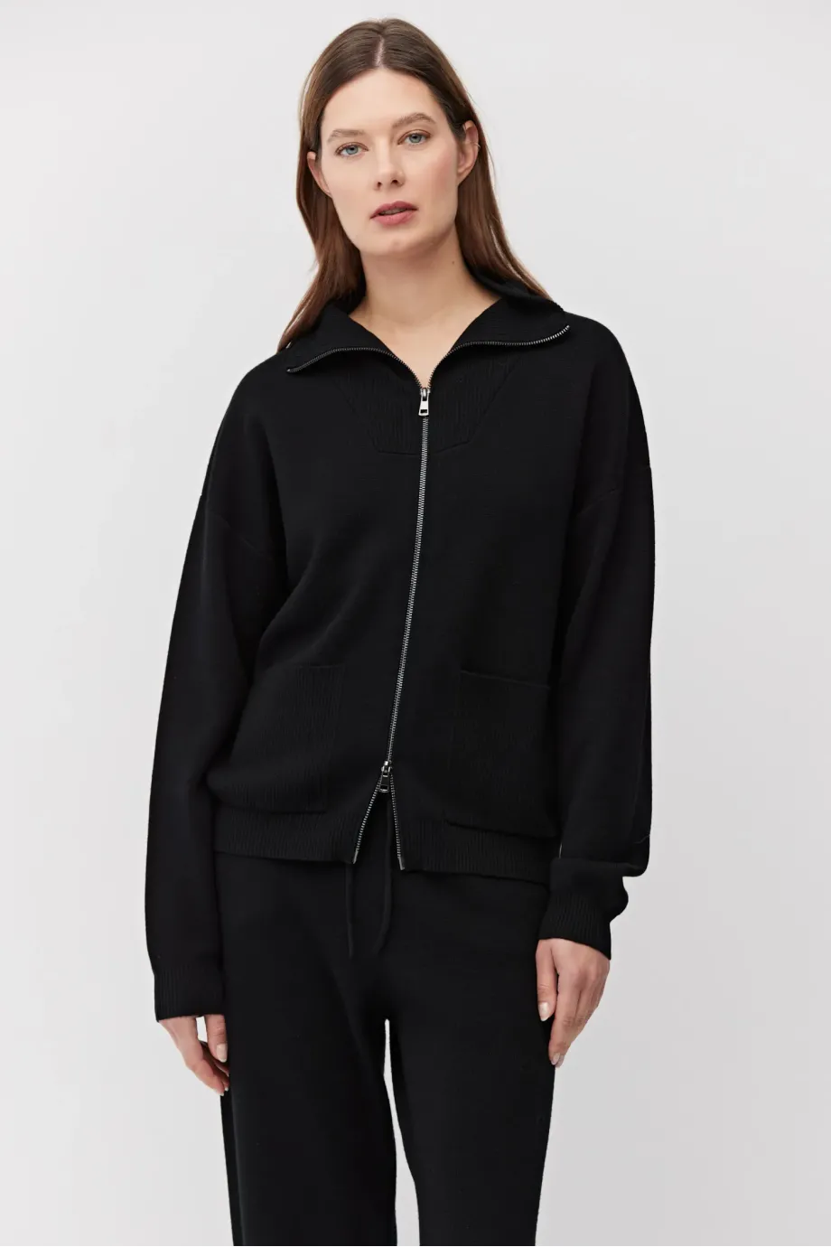 Bluza z wełny merynosowej. Zapięcie na dwubiegunowy suwak w kolorze srebra. Długi rękaw, stójka, kieszenie. Fason prosty, luźny. Miękka dzianina o splocie milano, przygotowana na maszynie o uigleniu 12 GG. Kolor czarny. Do uzupełninia zestawu spodnie.