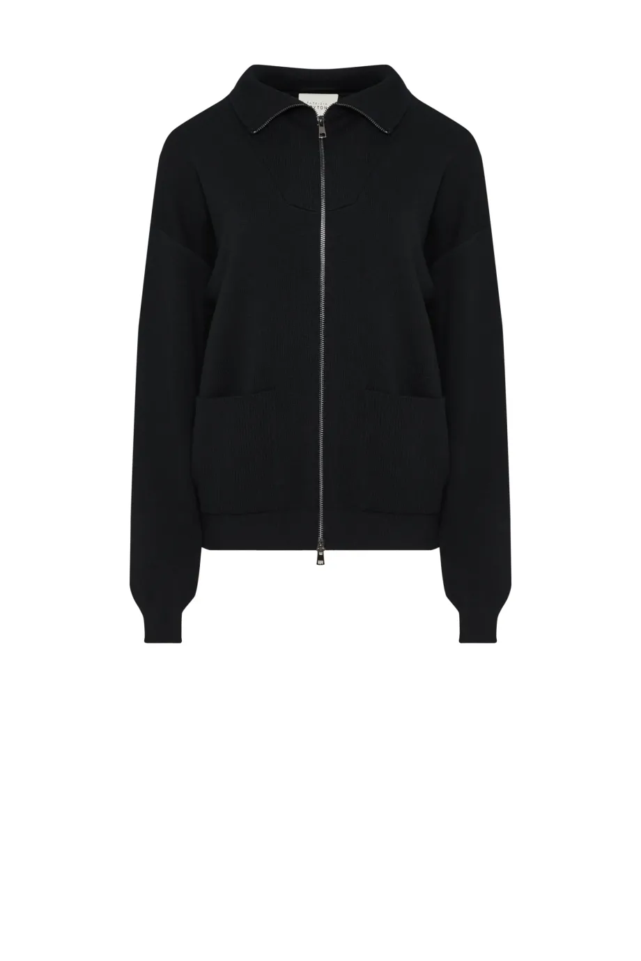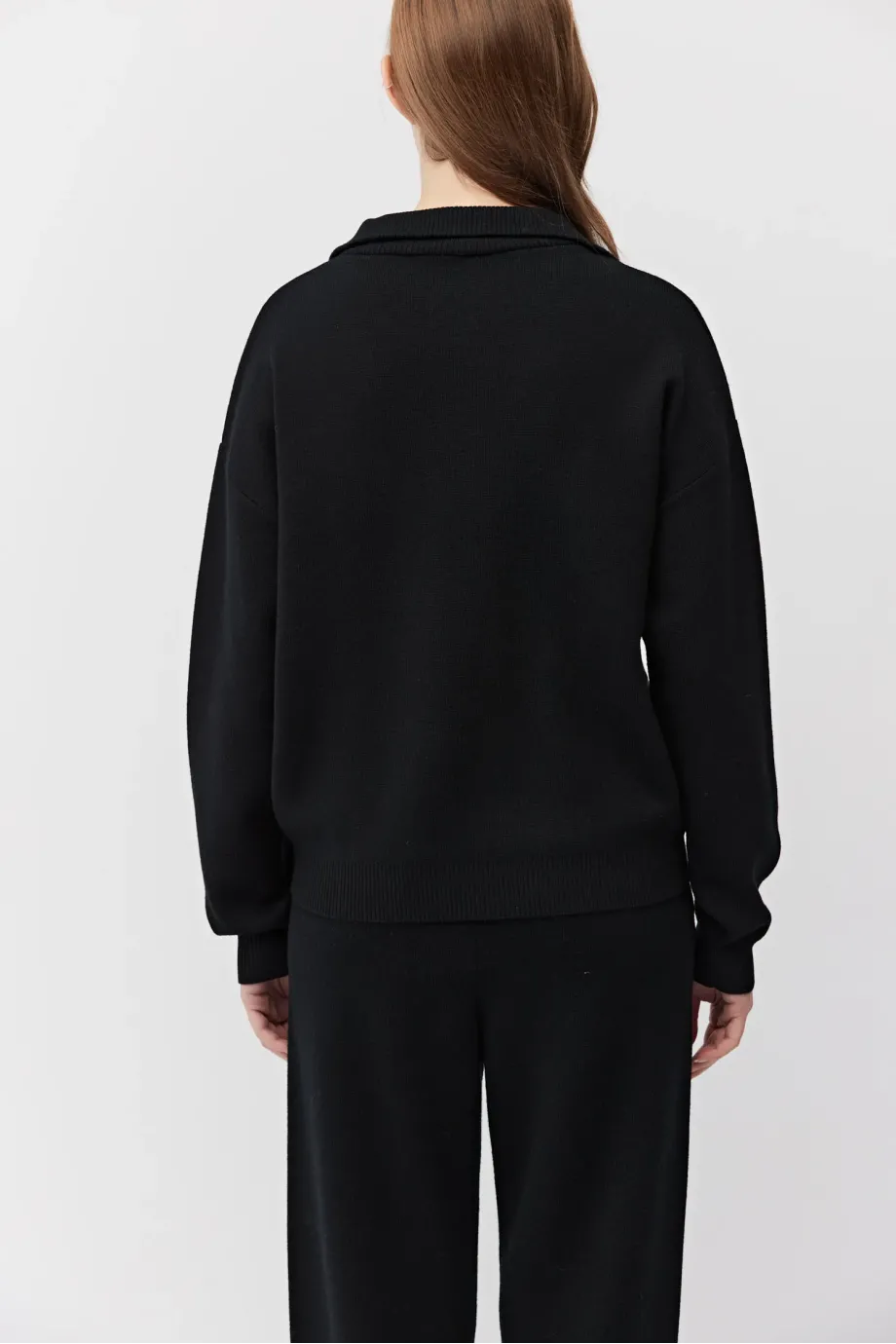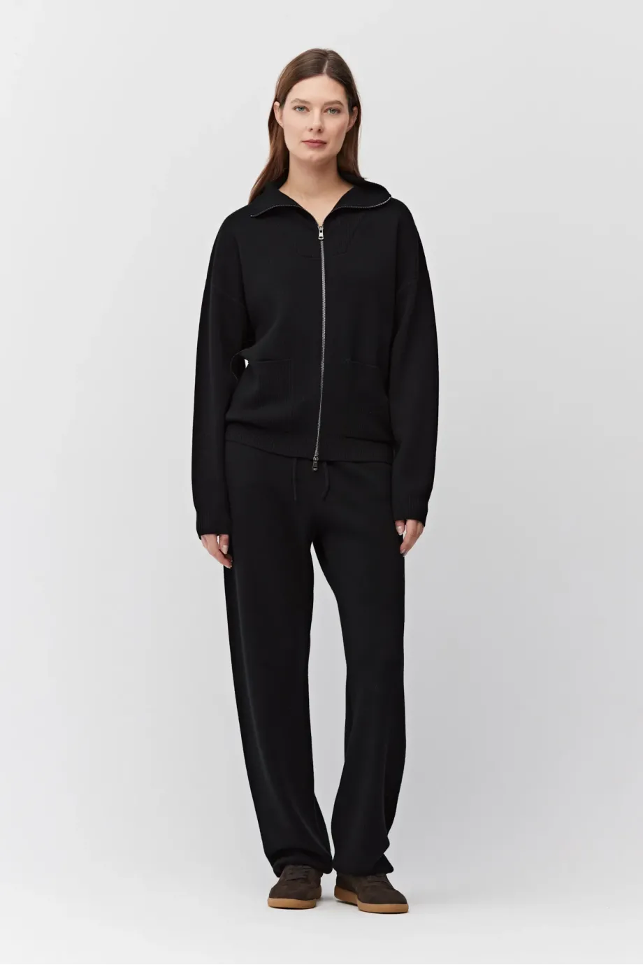 Bluza z wełny merynosowej. Zapięcie na dwubiegunowy suwak w kolorze srebra. Długi rękaw, stójka, kieszenie. Fason prosty, luźny. Miękka dzianina o splocie milano, przygotowana na maszynie o uigleniu 12 GG. Kolor czarny. Do uzupełninia zestawu spodnie.
