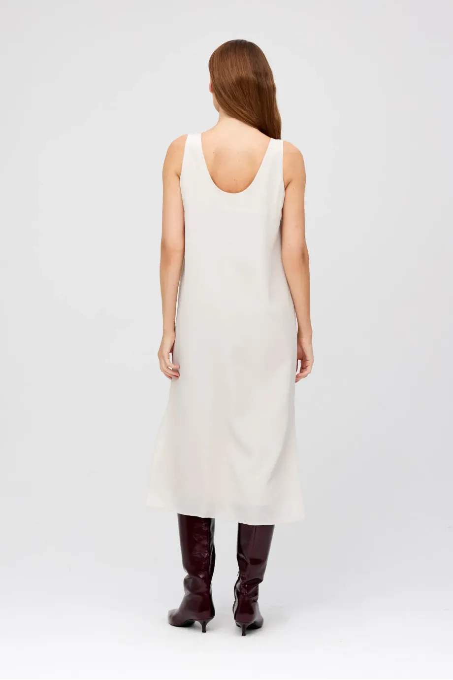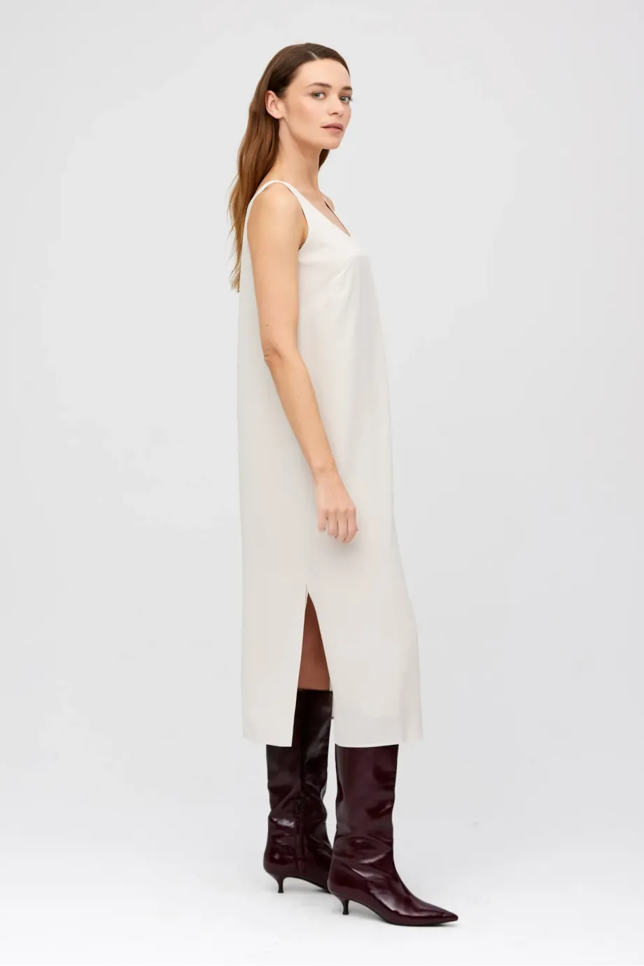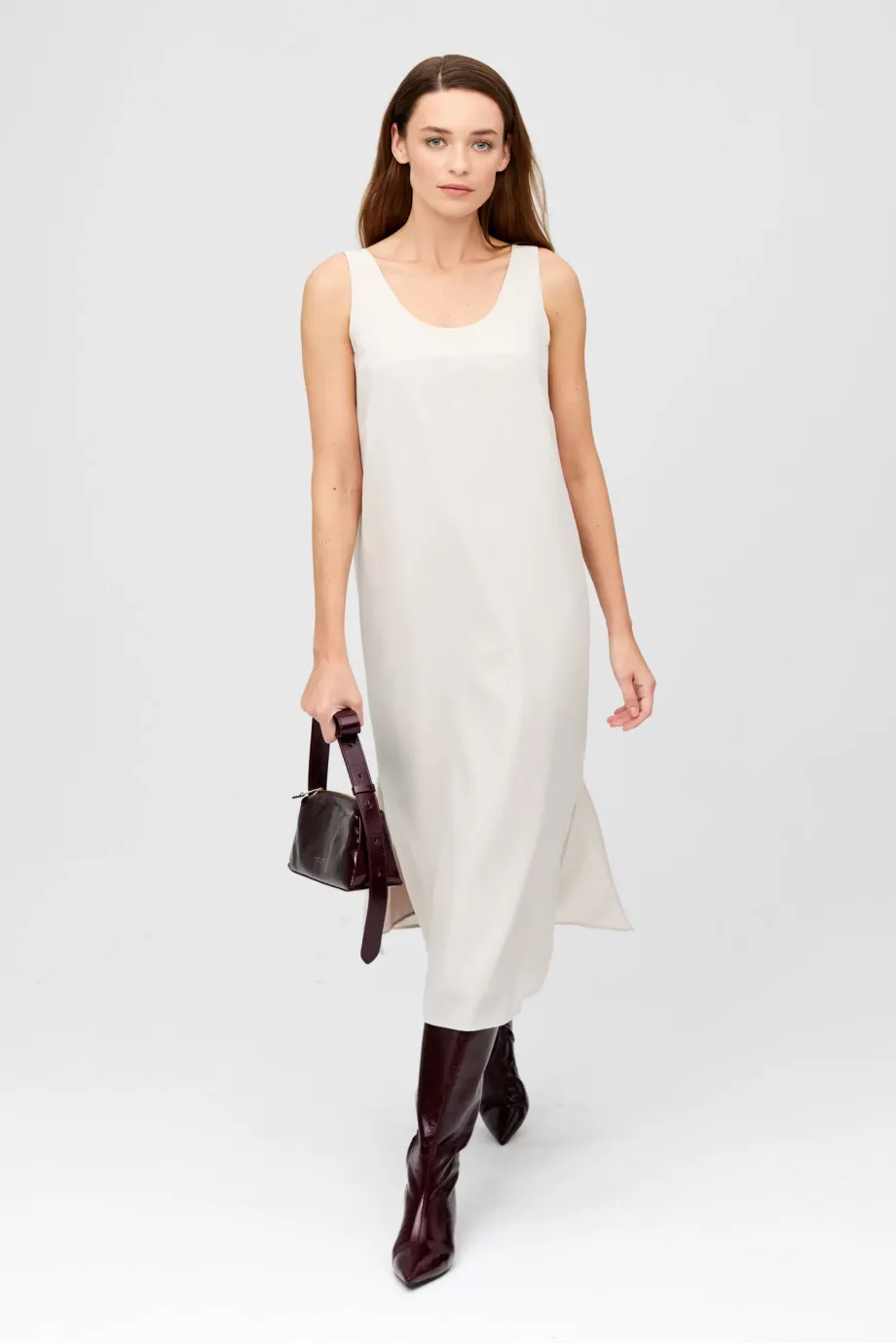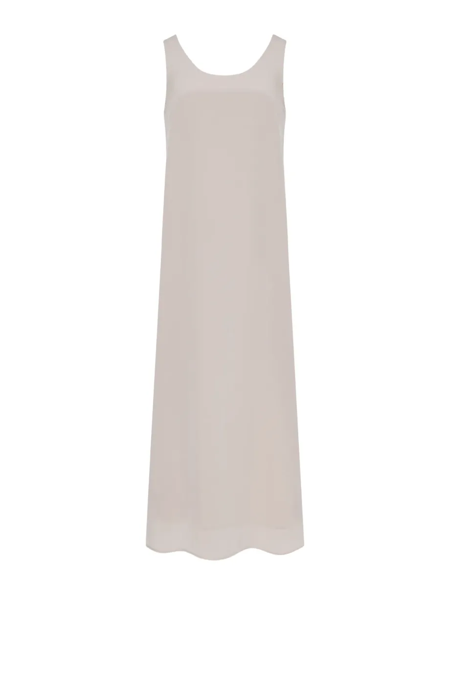 Sukienka z jedwabiu. Szerokie ramiączka, okrągły dekolt. Długość midi. Kolor beżowy.