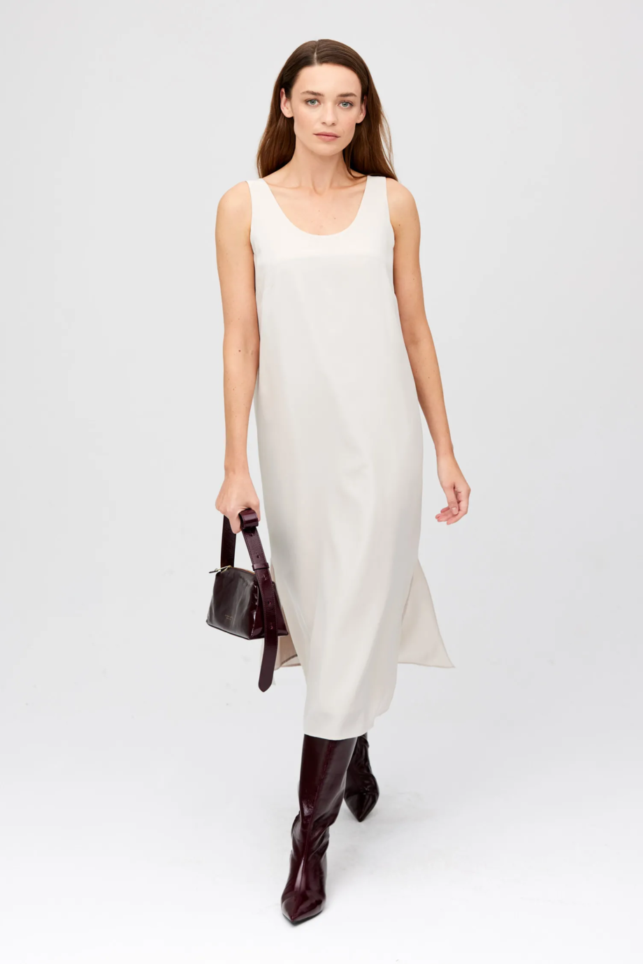 Projektując tę sukienkę, skupiliśmy się na formie, która daje przestrzeń do indywidualnej interpretacji. Prosta sukienka na szerokich ramiączkach pięknie układa się na sylwetce, a okrągły dekolt podkreśla linię szyi i ramion w wyjątkowo elegancki sposób. Długość midi nadaje jej uniwersalności - to wszystko sprawia, że nasza sukienka bez rękawów midi sprawdzi się zarówno w ciągu dnia, jak i wieczorem.