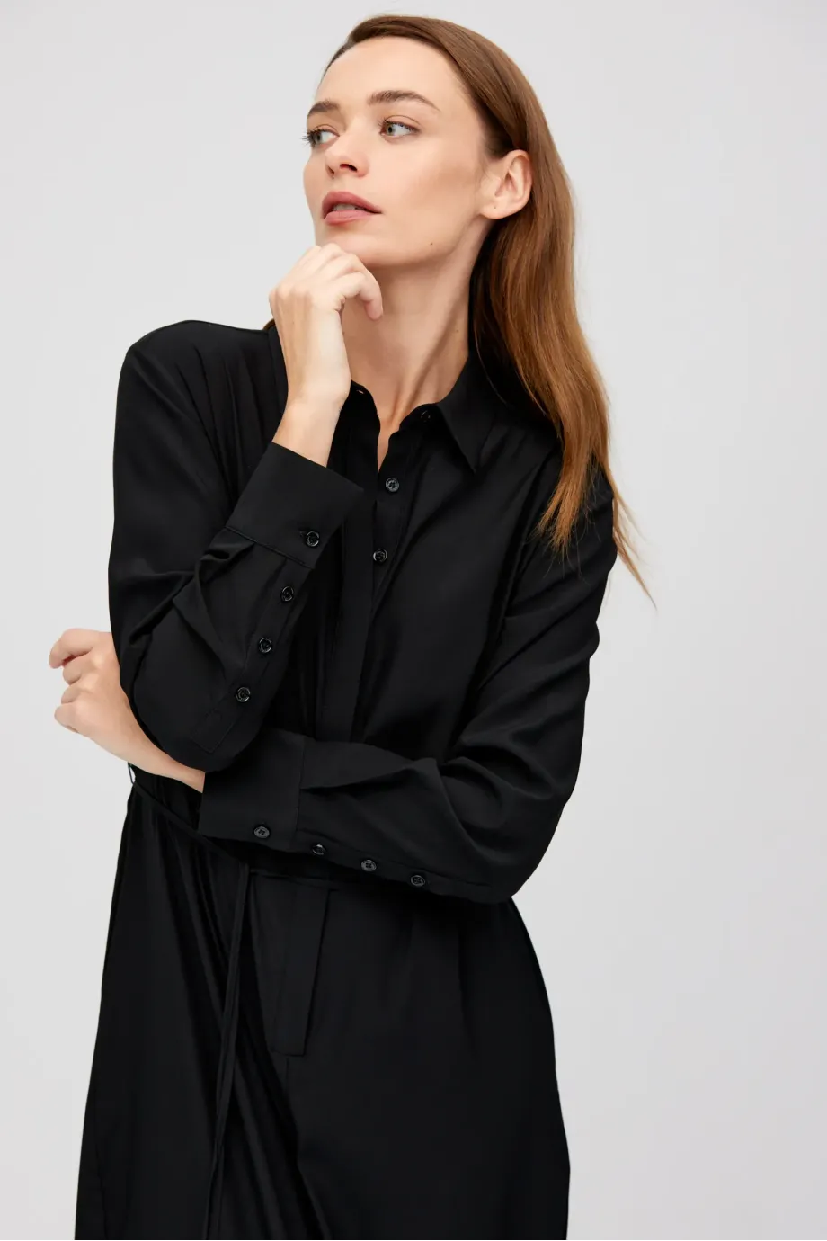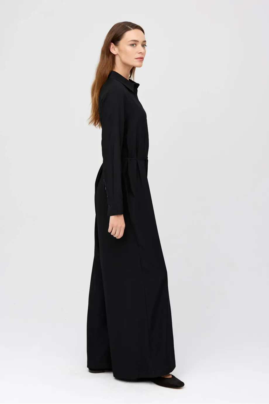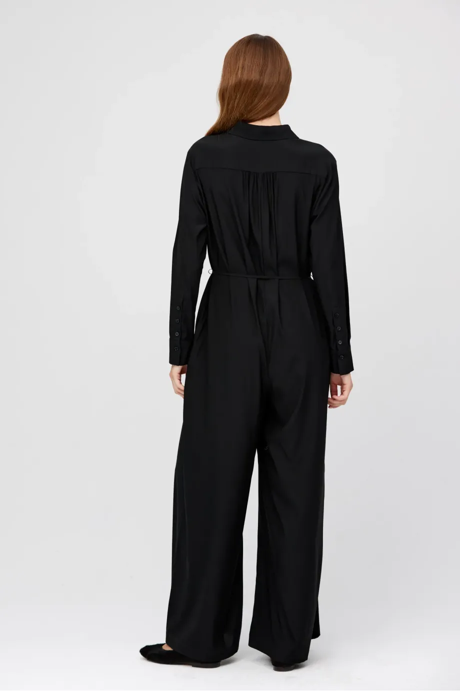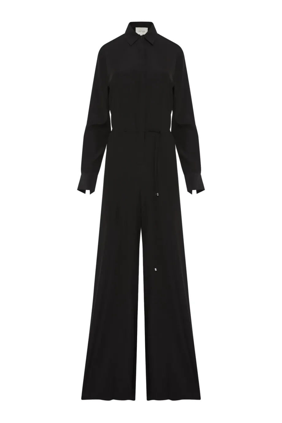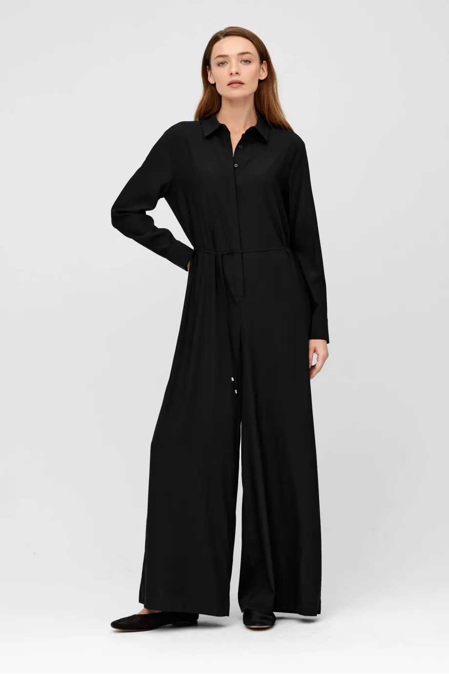 Kombinezon z jedwabiu. Luźny fason, szeroka nogawka. Kieszenie. Kolor czarny.