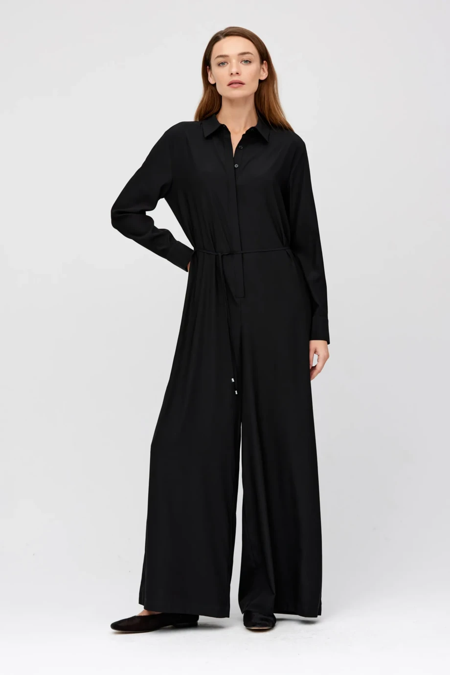 Czarny kombinezon z szeroką nogawką i długim rękawem