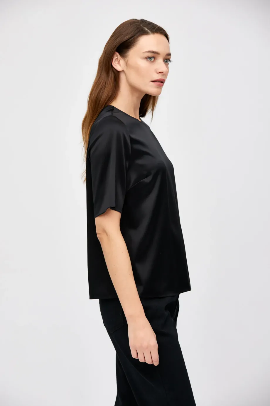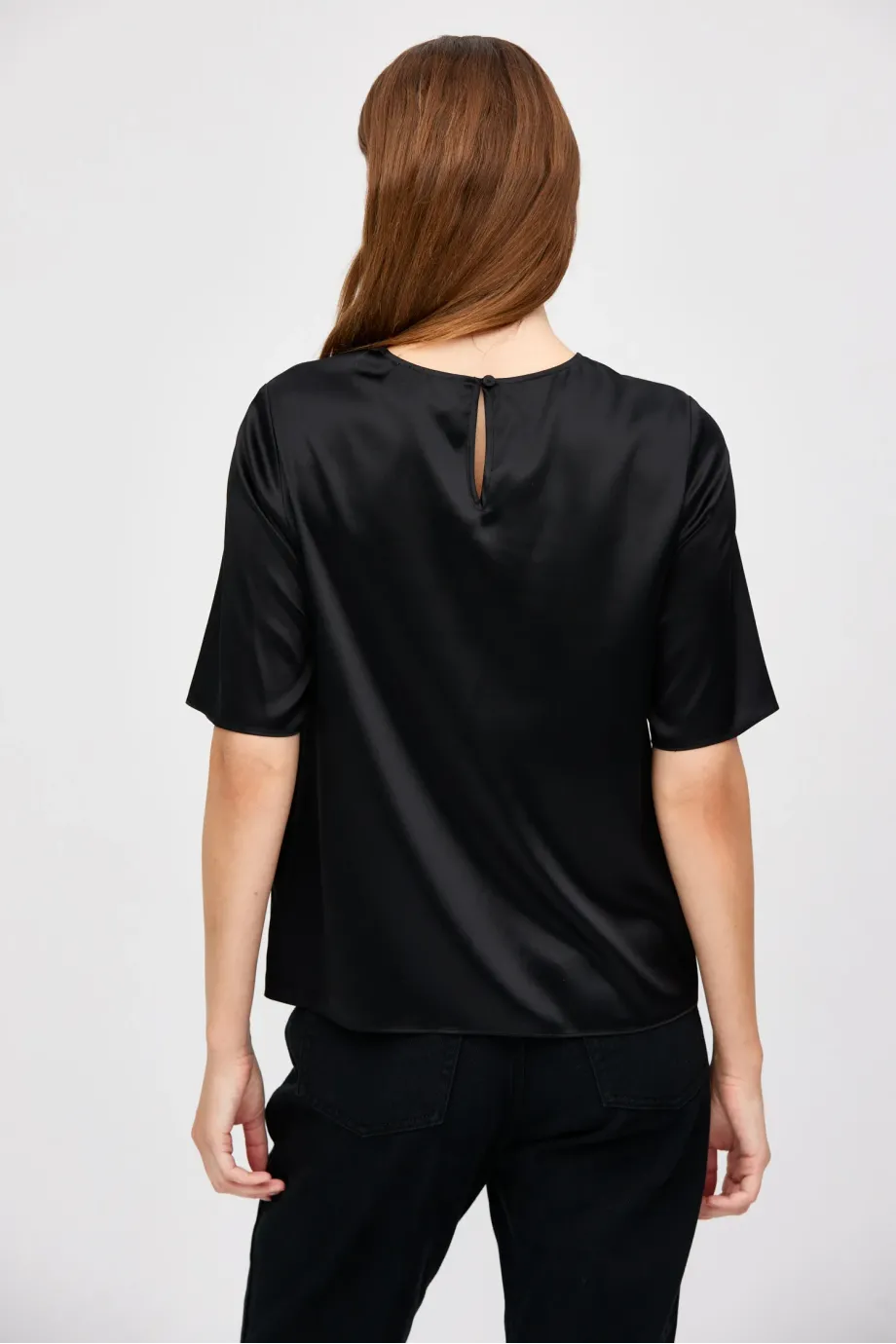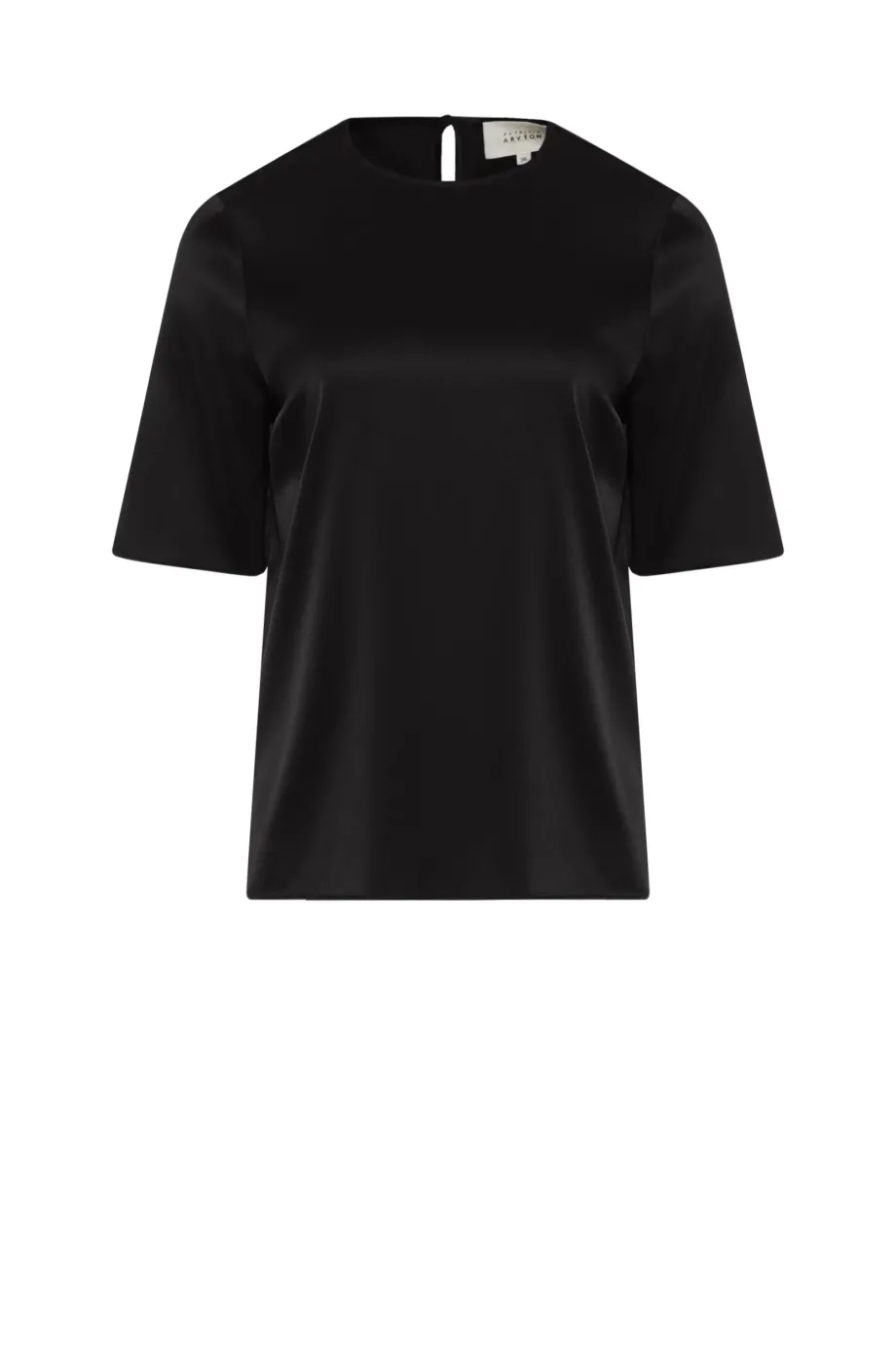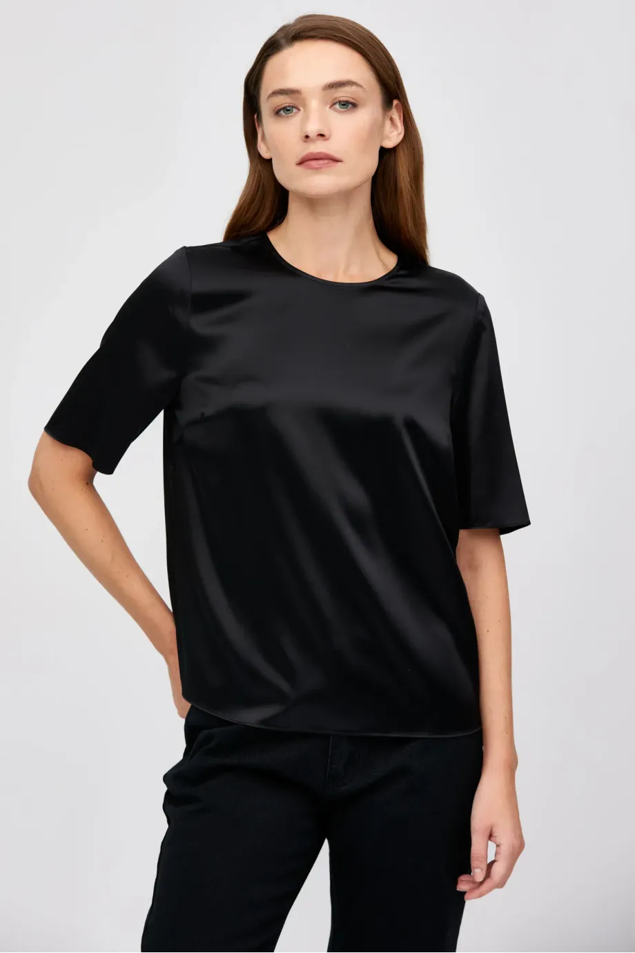 Czarna bluzka z jedwabiu. Krótki rękaw, okrągły dekolt, prosty fason. Z tyłu zapięcie na guzik. Model dostępny także w zieleni.
