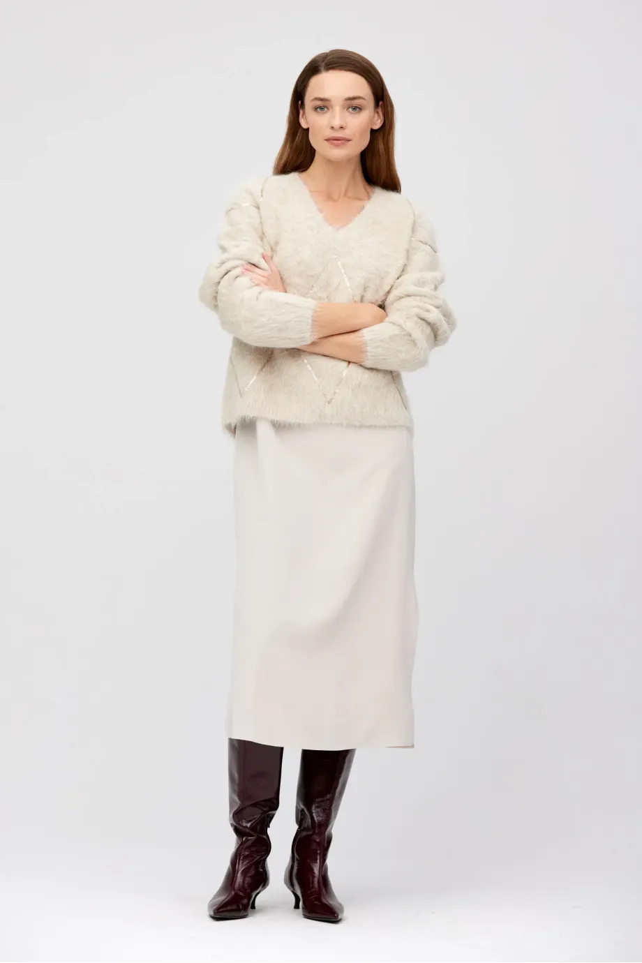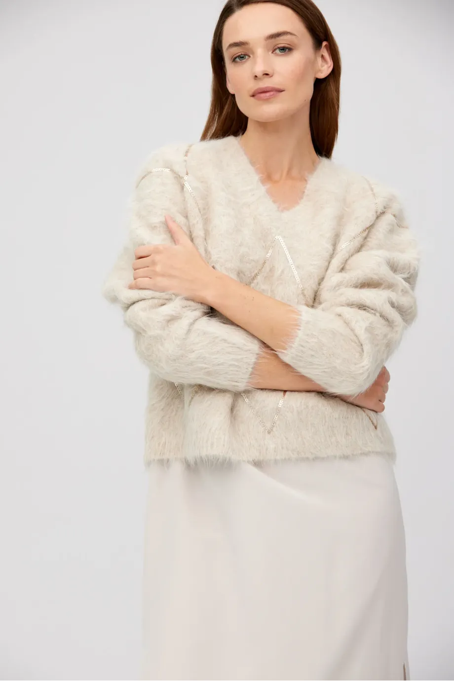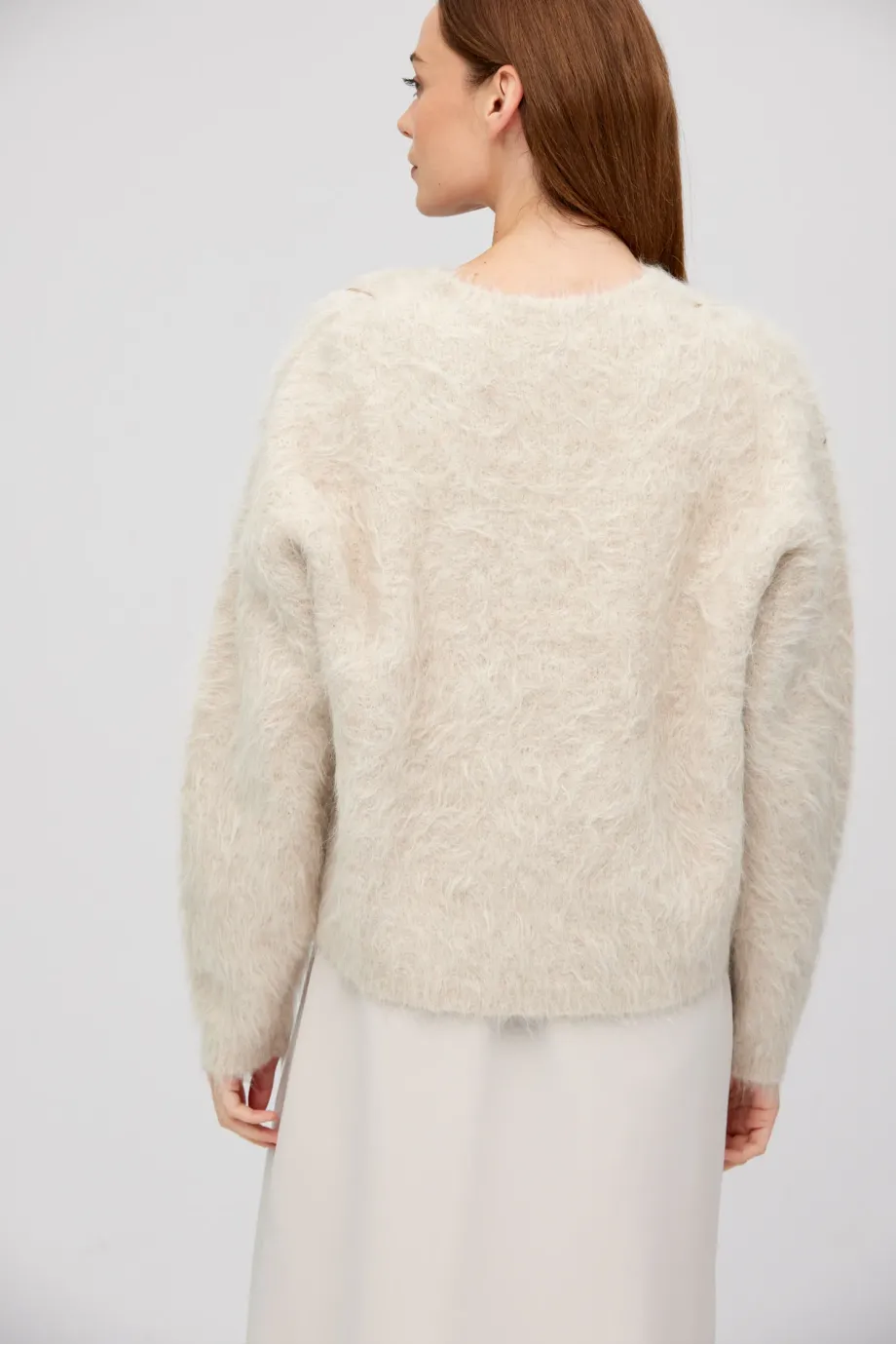 Sweter z wełną alpaki. Dekolt w szpic, długi rękaw, prosta forma. Miękka, ciepła dzianina z dłuższym włosem, wykonana luźnym splotem single jersey, na maszynie o uigleniu 3 GG. Kolor beż.