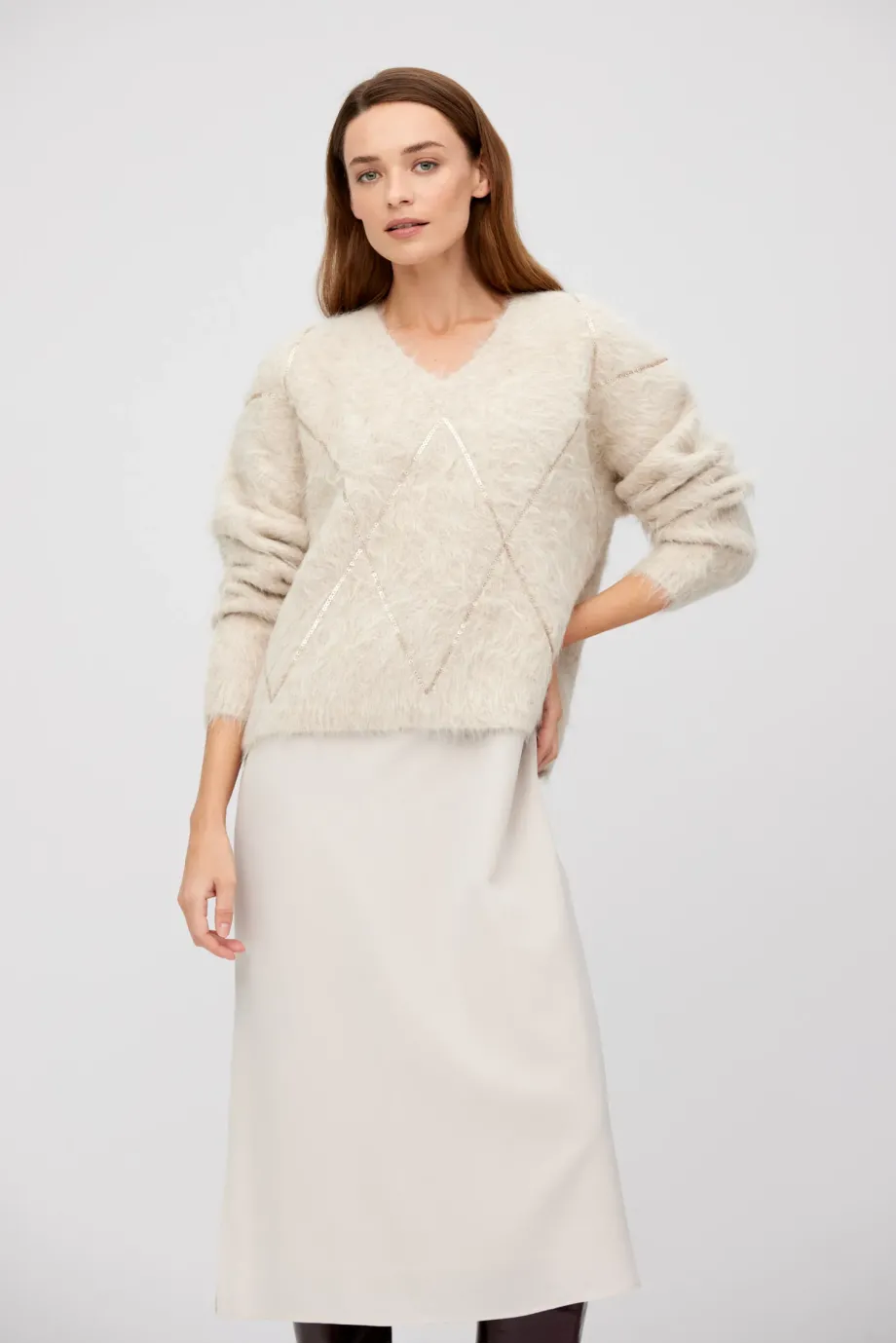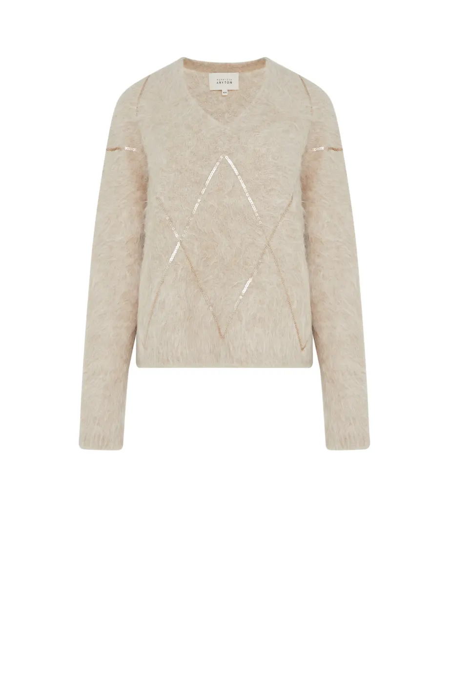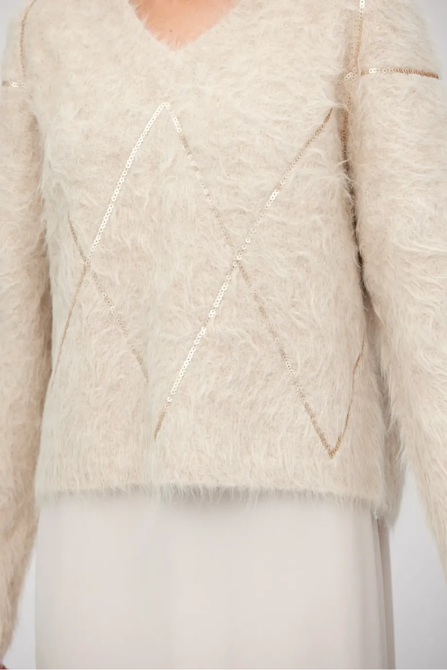 Sweter z wełną alpaki. Dekolt w szpic, długi rękaw, prosta forma. Miękka, ciepła dzianina z dłuższym włosem, wykonana luźnym splotem single jersey, na maszynie o uigleniu 3 GG. Kolor beż.