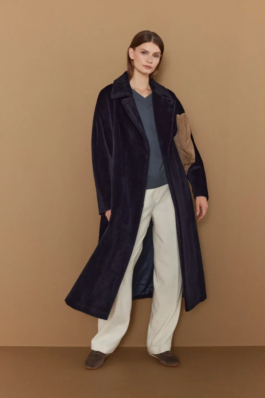 Granatowy płaszcz z paskiem z baby suri alpaką