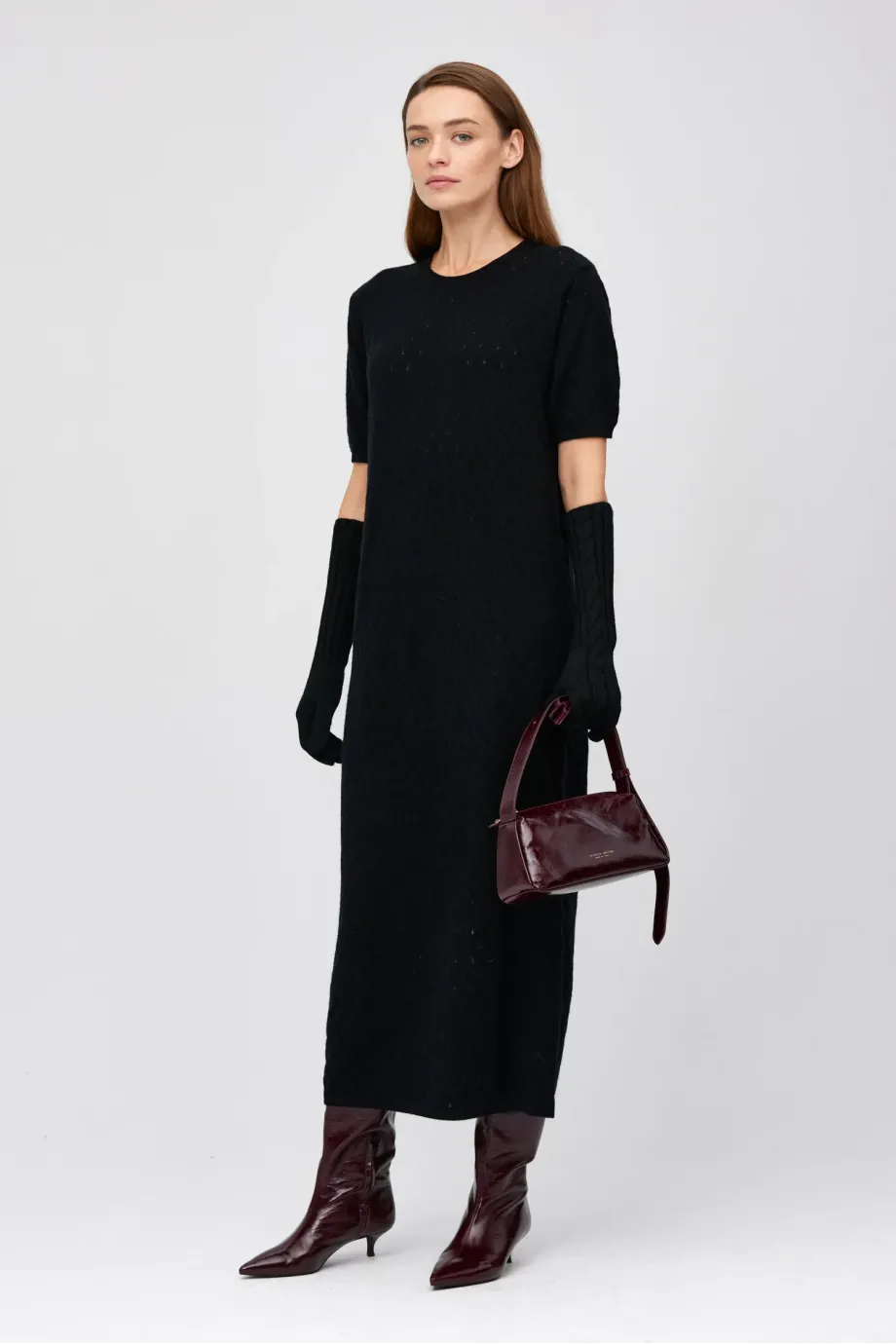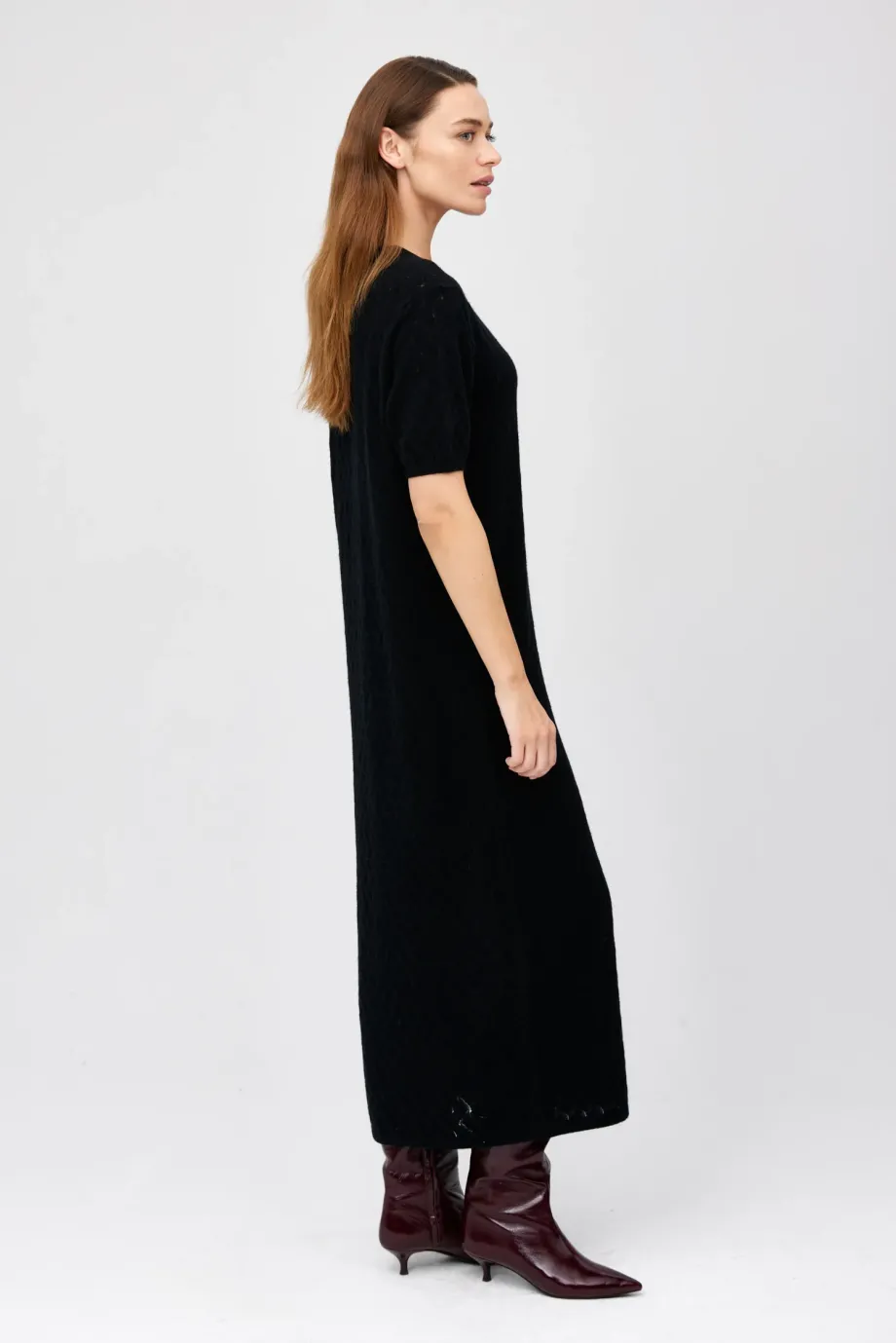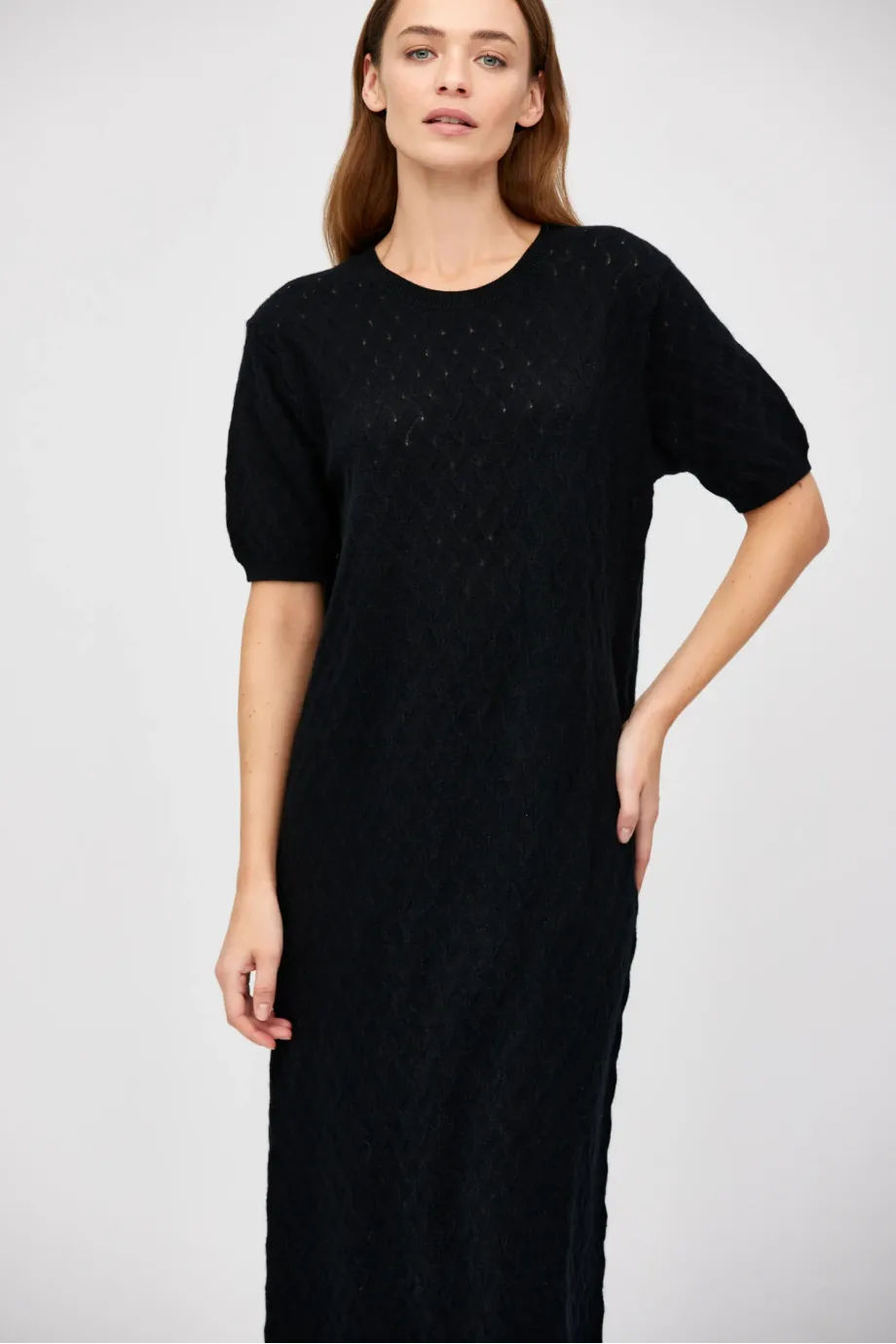 Sukienka z wełny merynosowej i domieszki wełny alpaki. Okrągły dekolt, krótki rękaw, prosty fason. Długość midi. Kolor czarny.
