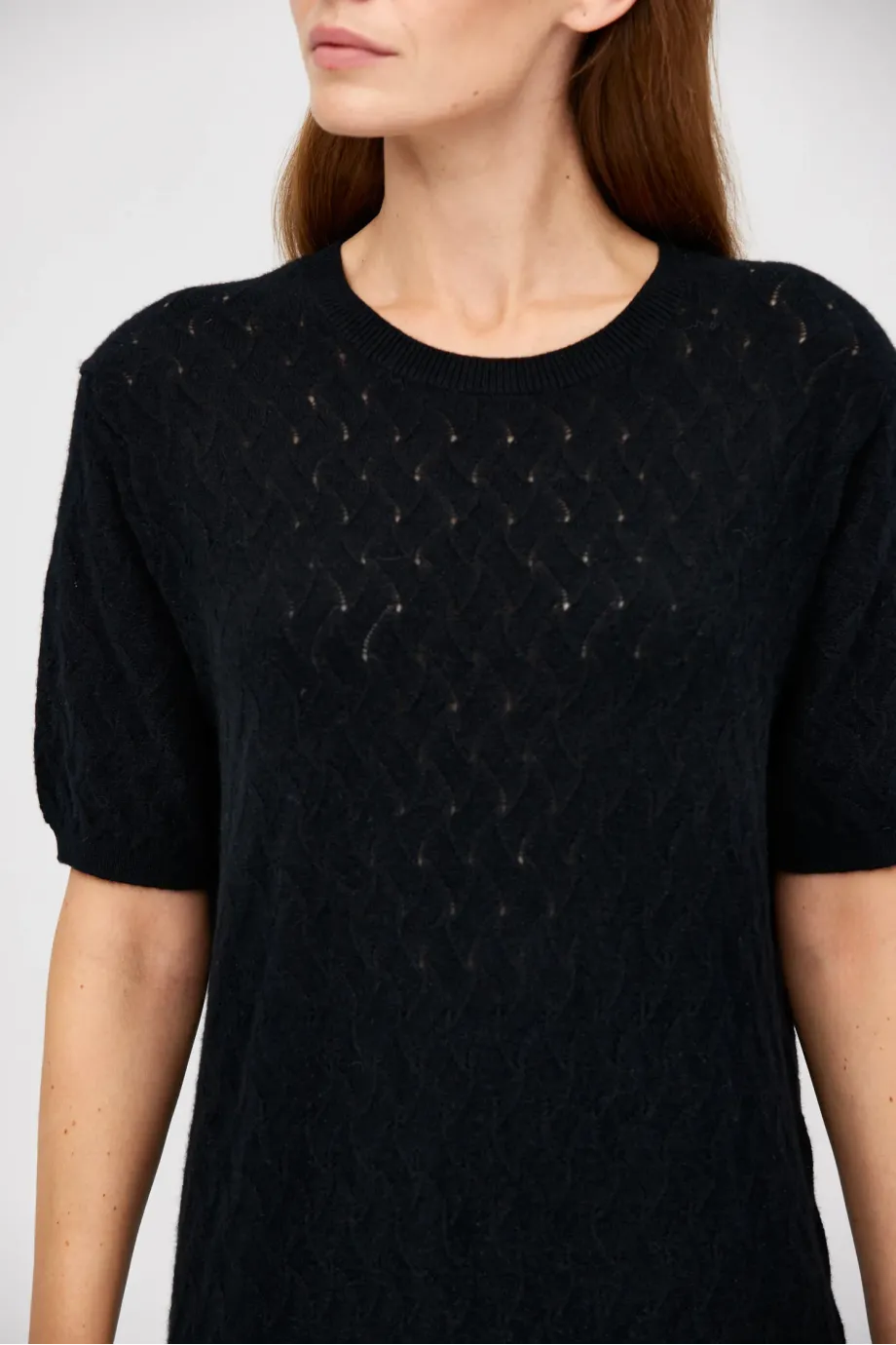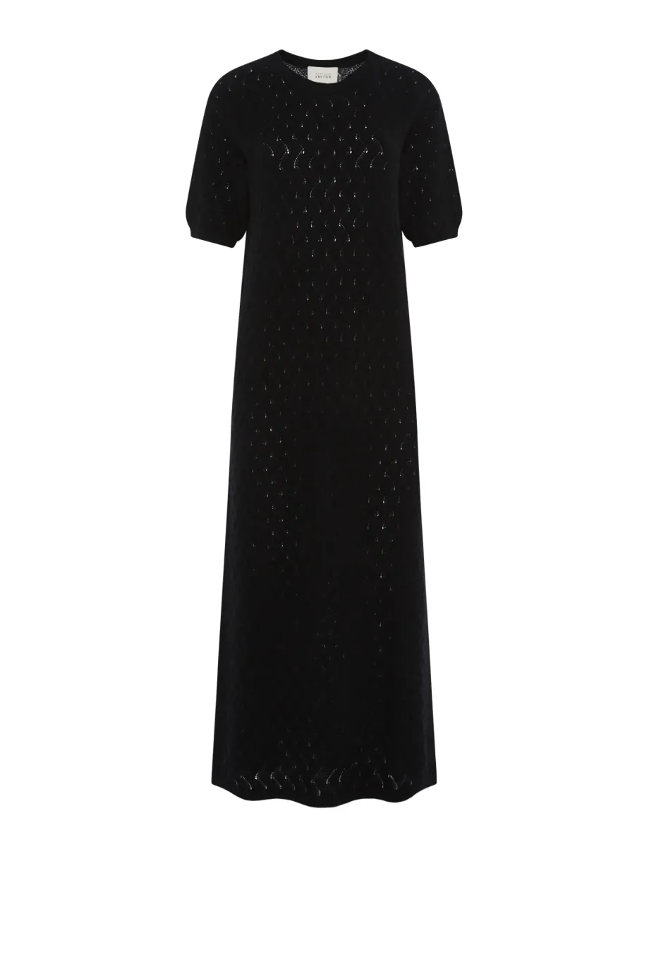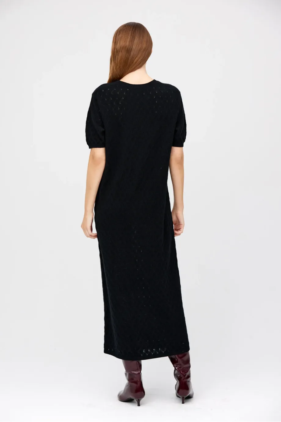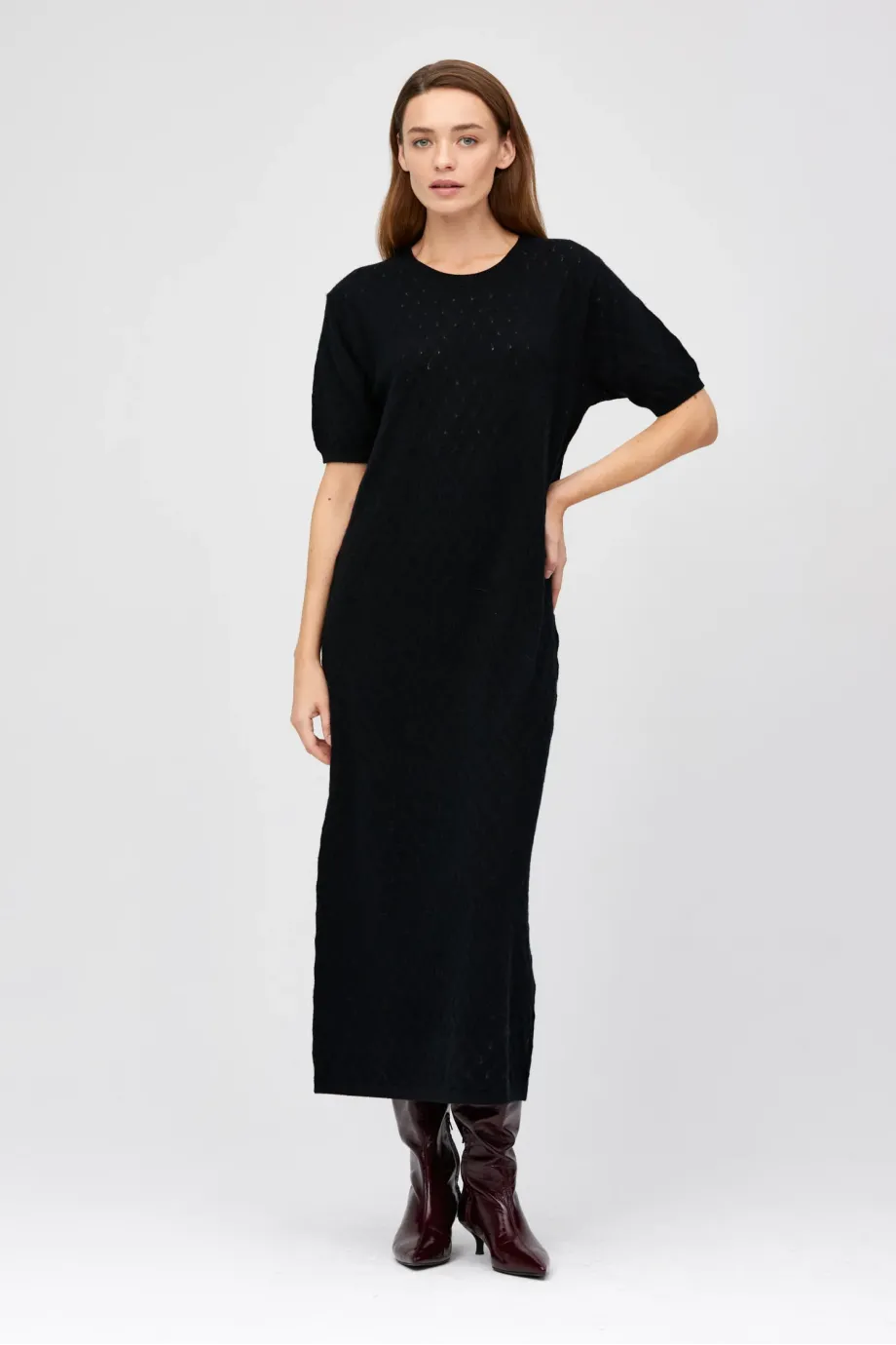 Sukienka z wełny merynosowej i domieszki wełny alpaki. Okrągły dekolt, krótki rękaw, prosty fason. Długość midi. Kolor czarny.