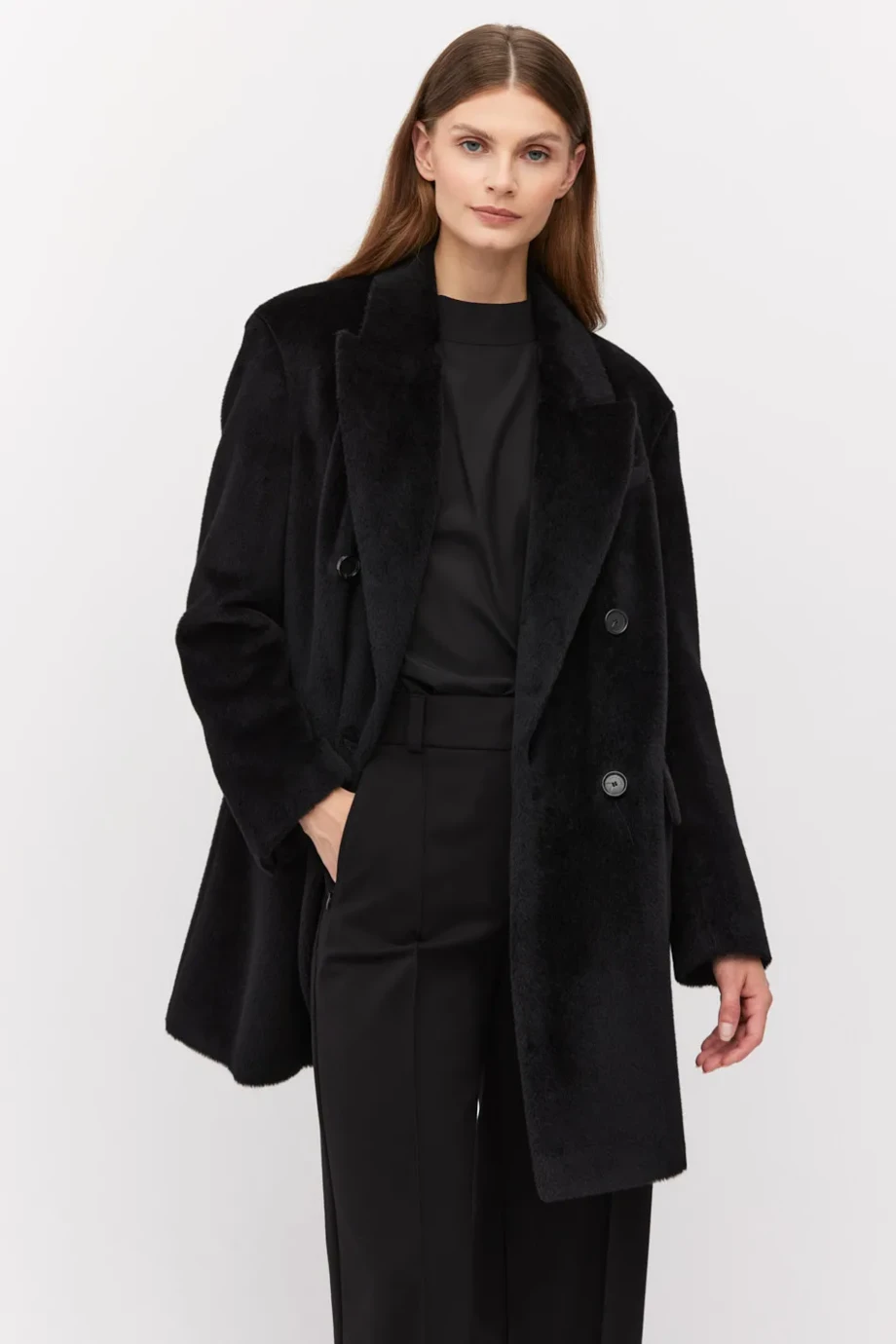 Luźna, dwurzędowa konstrukcja sprawia, że ta dwurzędowa kurtka damska pięknie układa się na sylwetce, nie krępując ruchów. Zaznaczona, opadająca linia ramion nadaje jej modowego charakteru i subtelnie nawiązuje do estetyki oversize. Klasyczny kołnierz podkreśla elegancki charakter projektu, czyniąc ją ponadczasową czarną kurtką z kołnierzem. Model posiada funkcjonalne kieszenie oraz pełną podszewkę wykończoną ozdobnym pipingiem - detal, który zdradza jakość premium. Jest to długa czarna kurtka, dzięki wydłużonej formie, doskonała zarówno do szerokich spodni garniturowych, jak i do sukienek czy dzianinowych zestawów.