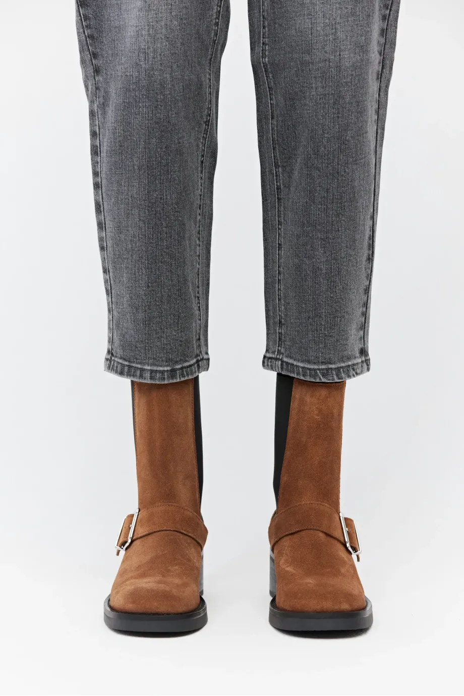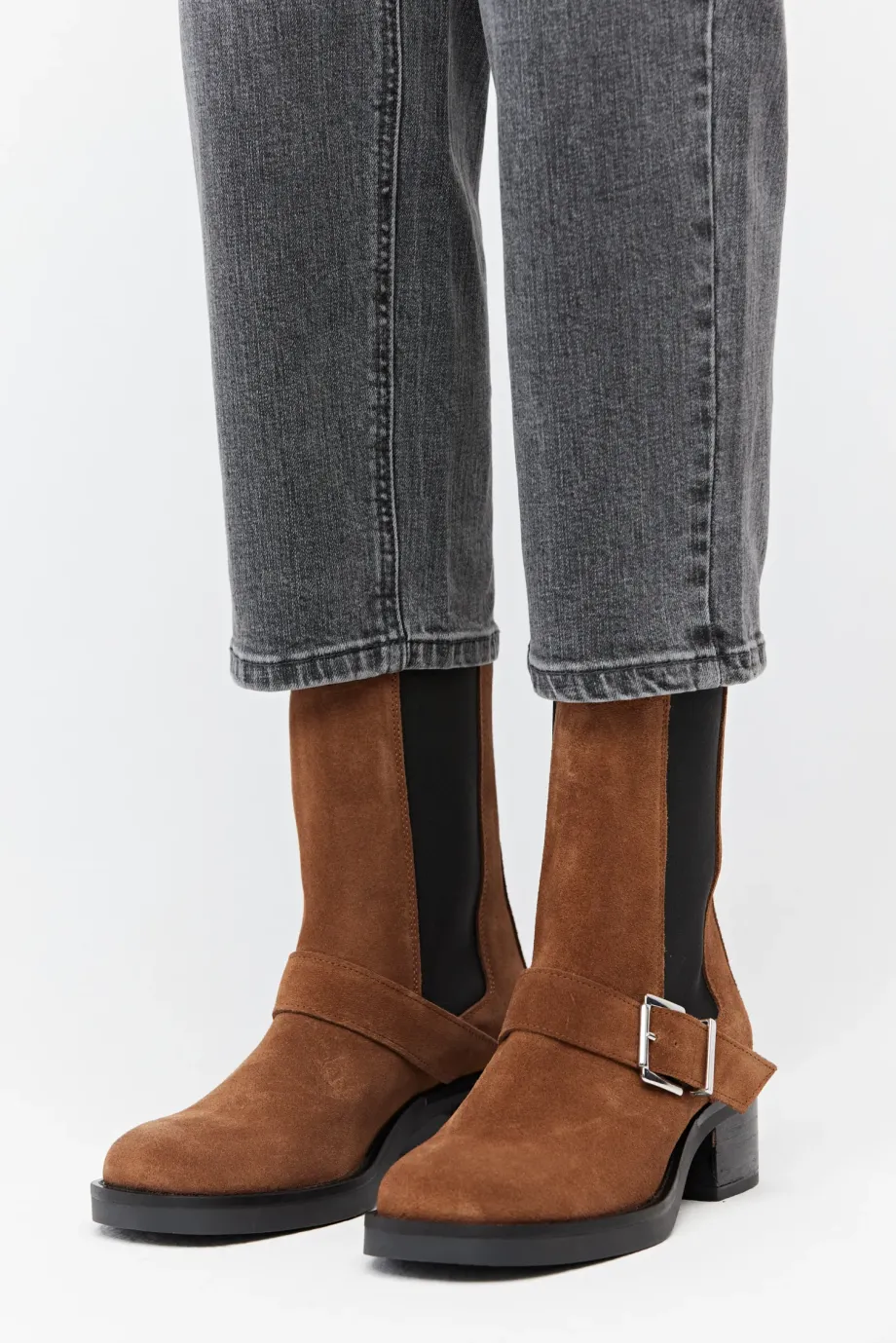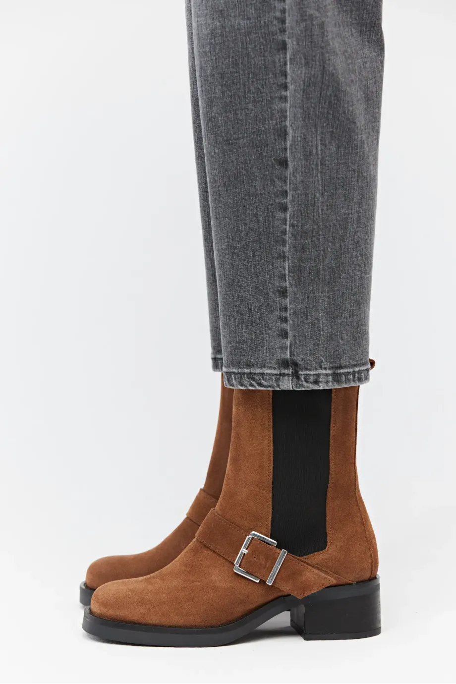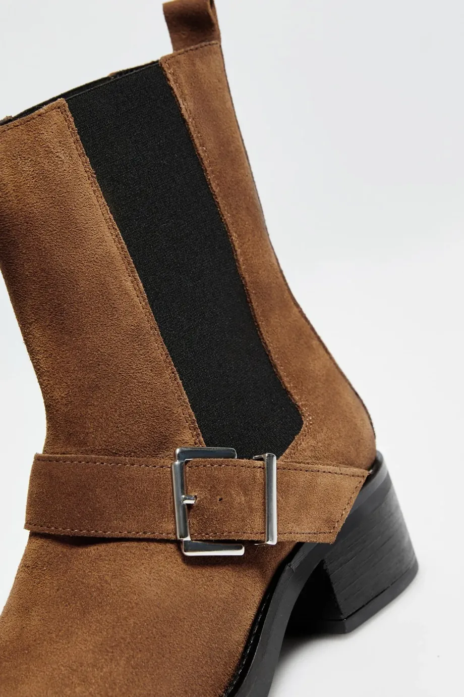 Brązowe zamszowe botki z klamrą