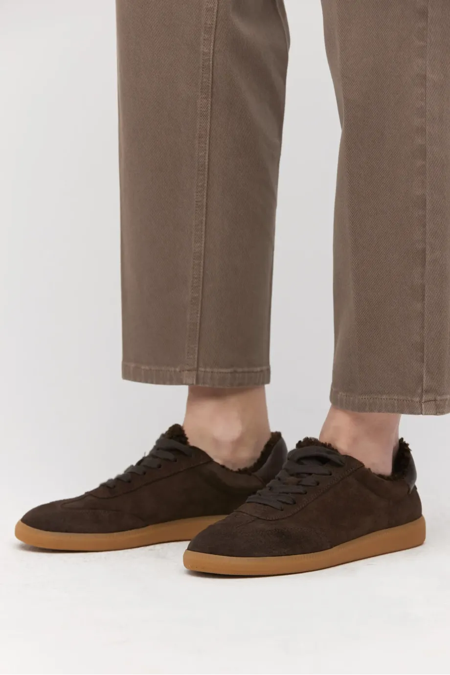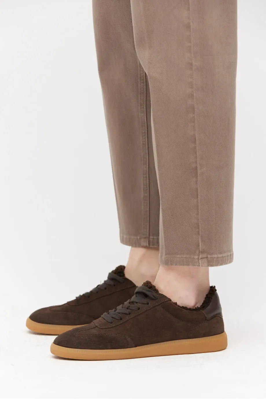 Zamszowe sneakersy z ociepleniem z miękkiego futerka, wykonane ręcznie w portugalskiej manufakturze z najwyższej jakości naturalnej skóry. Klasyczne sznurowanie. Kolor brązowy.