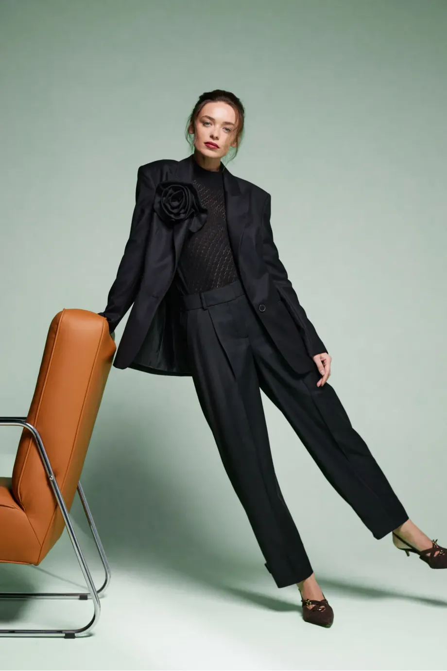 Półgolf z wełny merynosowej. Fason bliżej ciała. Miękka, dzianina o drobnym splocie pointelle, wykonana na maszynie o uigleniu 18 GG. Kolor czarny.
