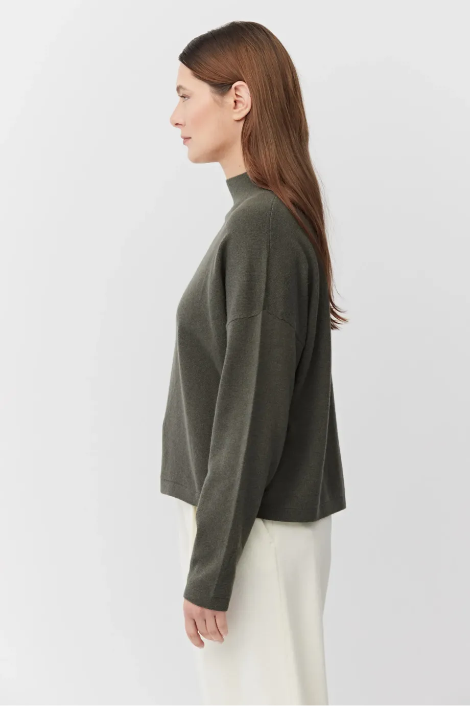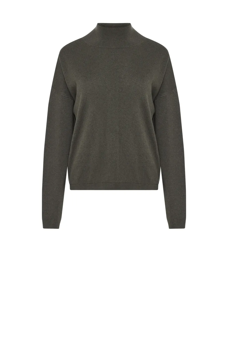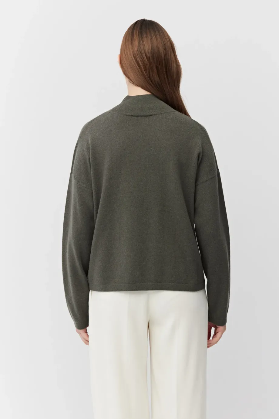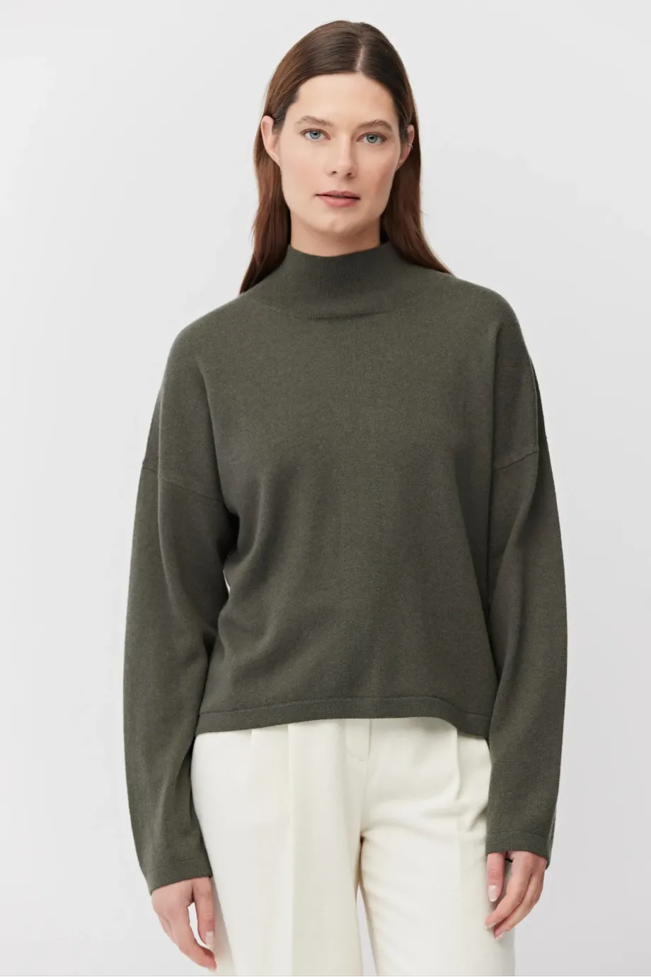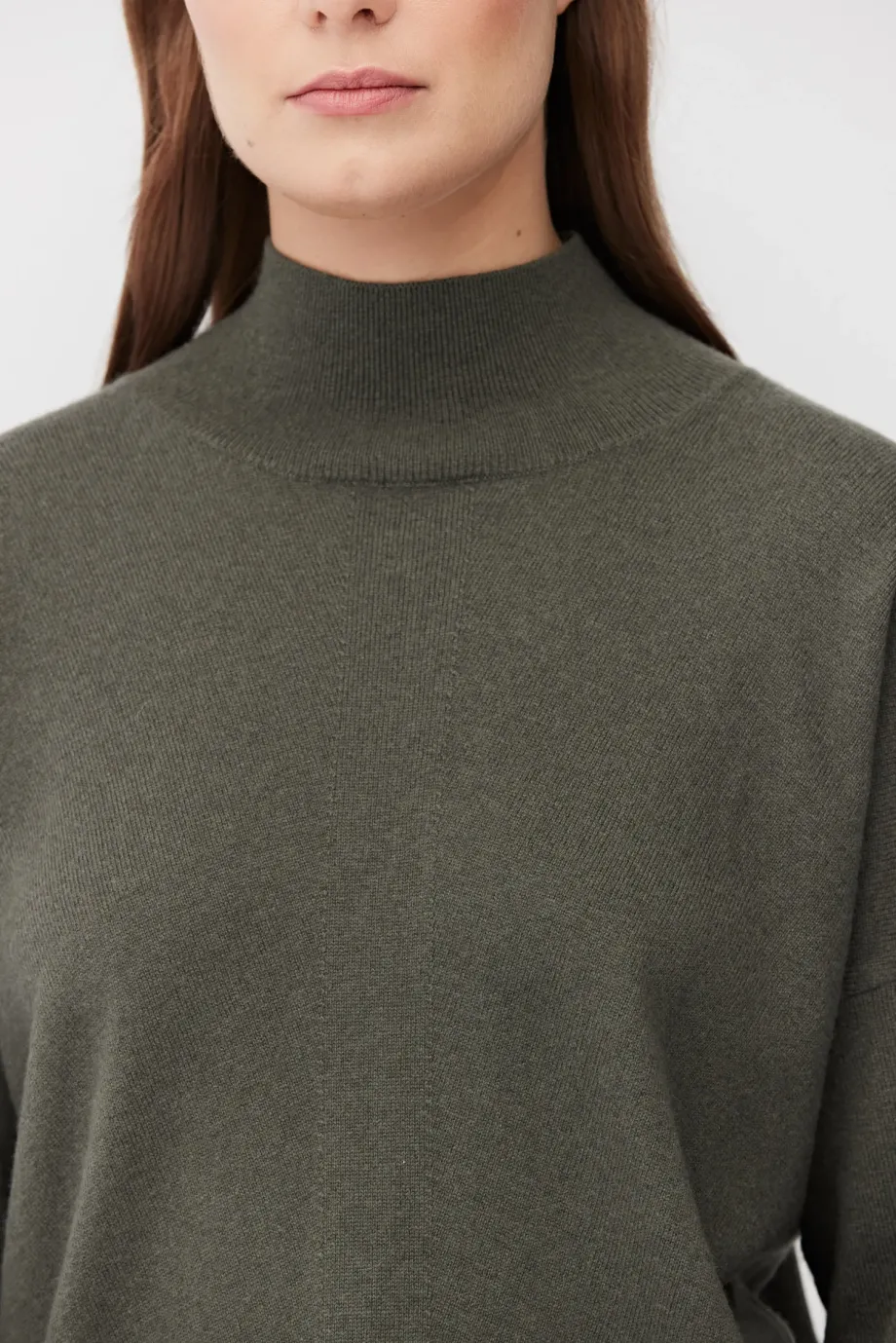 Zielony sweter z wełną merynosową i kaszmirem. Golf, długi rękaw, luźny fason. Miękka dzianina o splocie jersey knit, przygotowana na maszynie o uigleniu 12 GG.