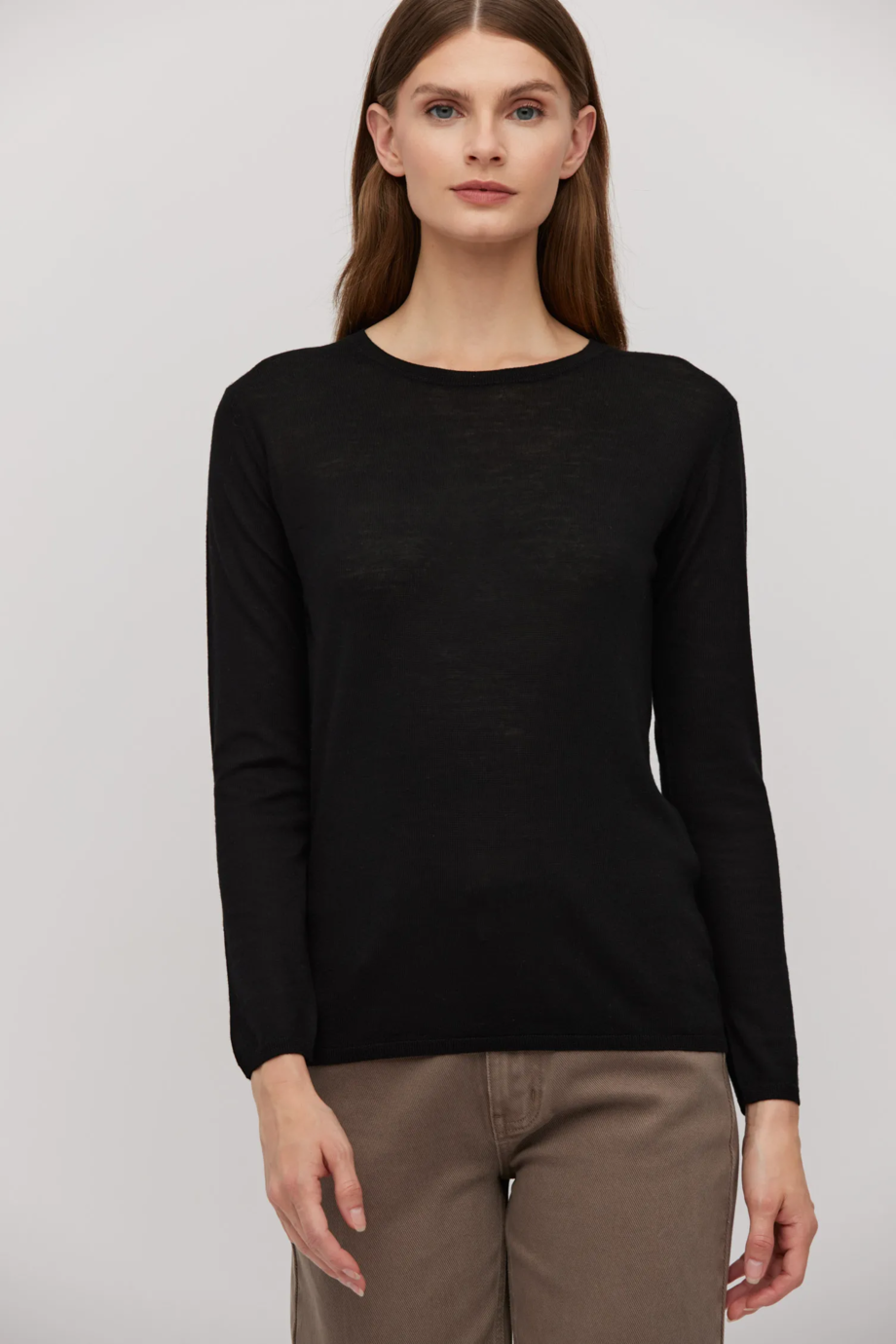 Bluzka top z wełny merynosowej. Okrągły dekolt, długi rękaw, fason bliżej ciała. Dzianina o bardzo drobnym splocie single jersey, przygotowana na maszynie o uigleniu 18 GG. Kolor czarny.