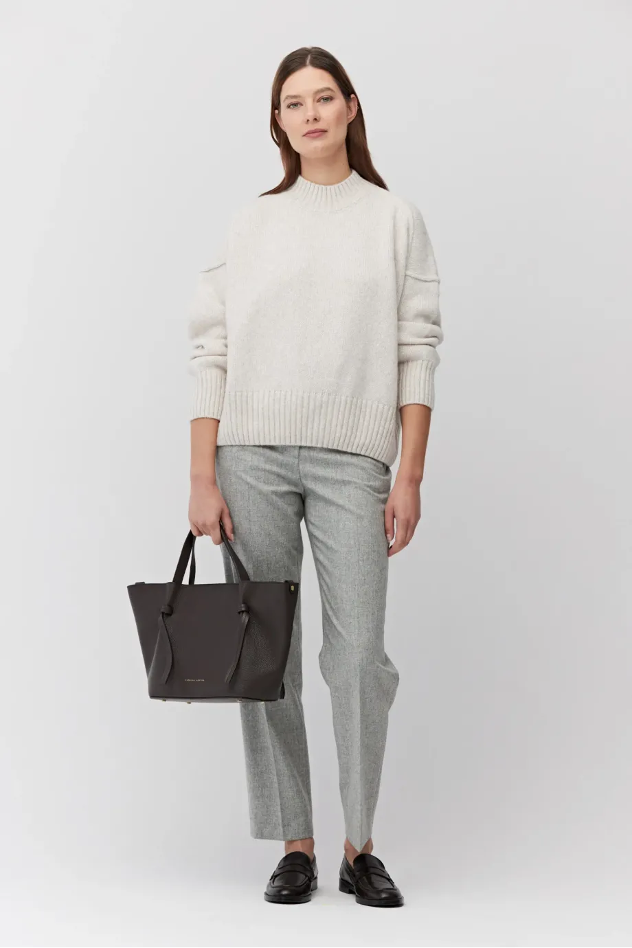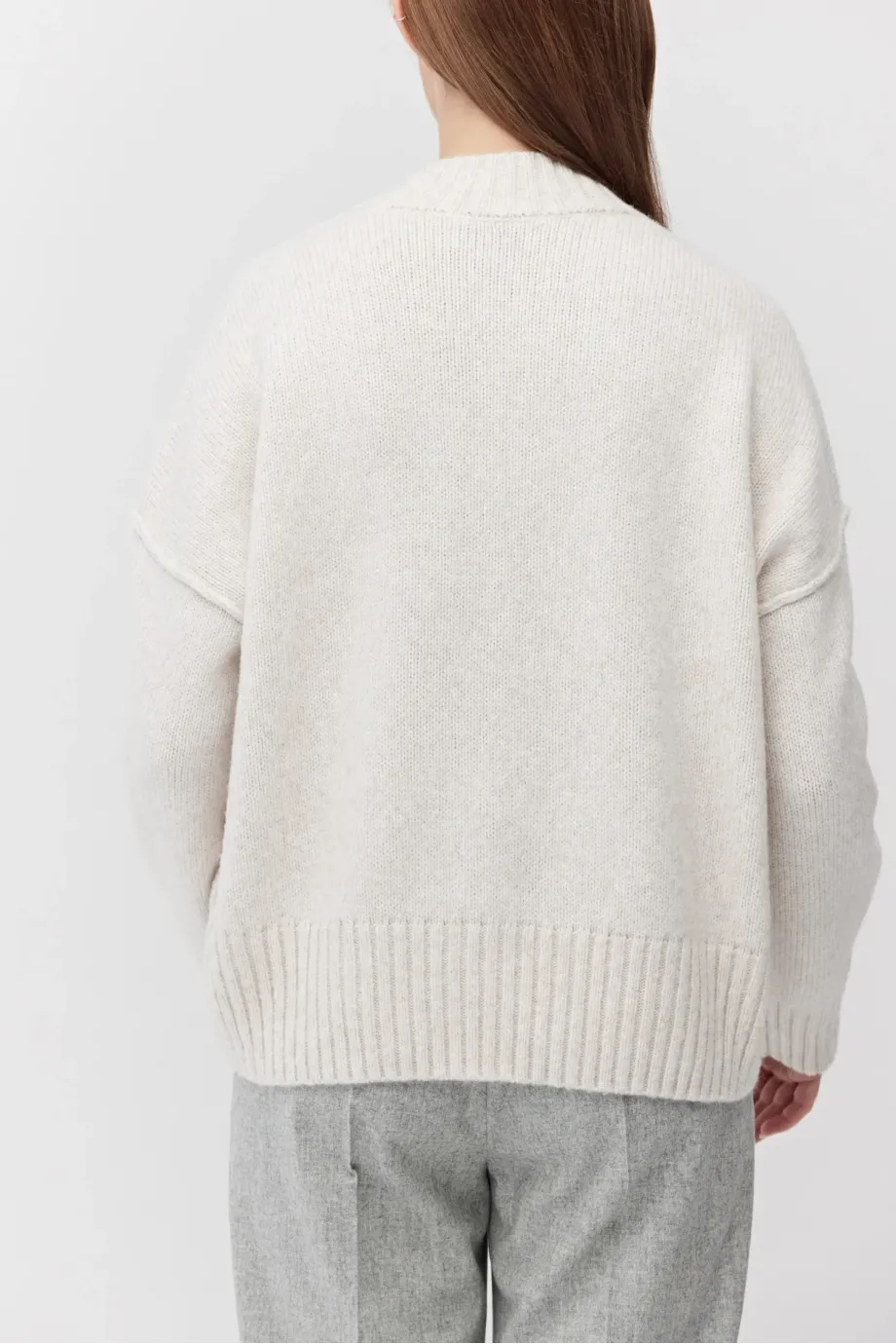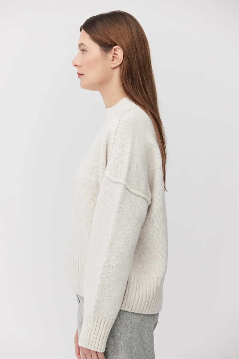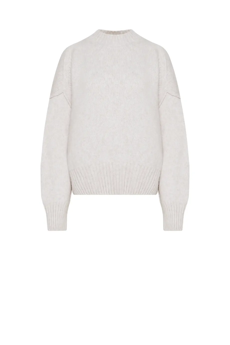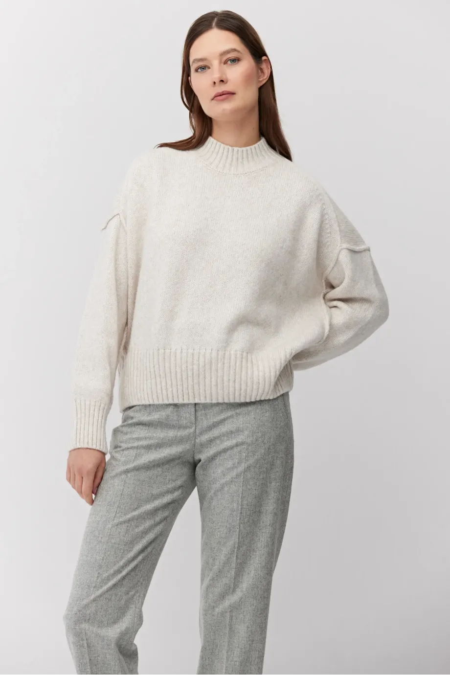 Sweter z wełną merynosową i bawełną. Półgolf, długi rękaw, luźny fason. Miękka dzianina o luźnym splocie single jersey, przygotowana na maszynie o uigleniu 2 GG. Kolor beż.
