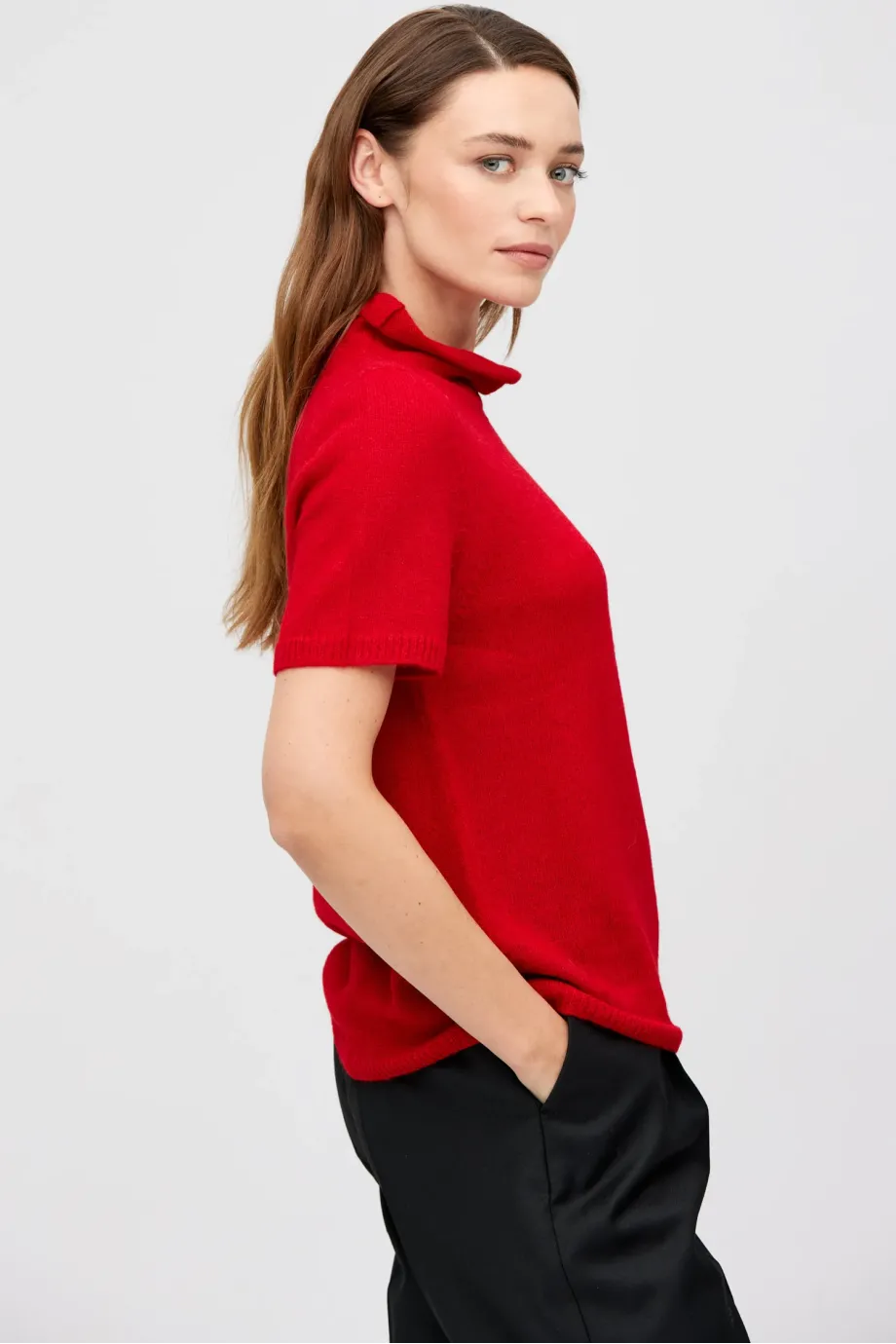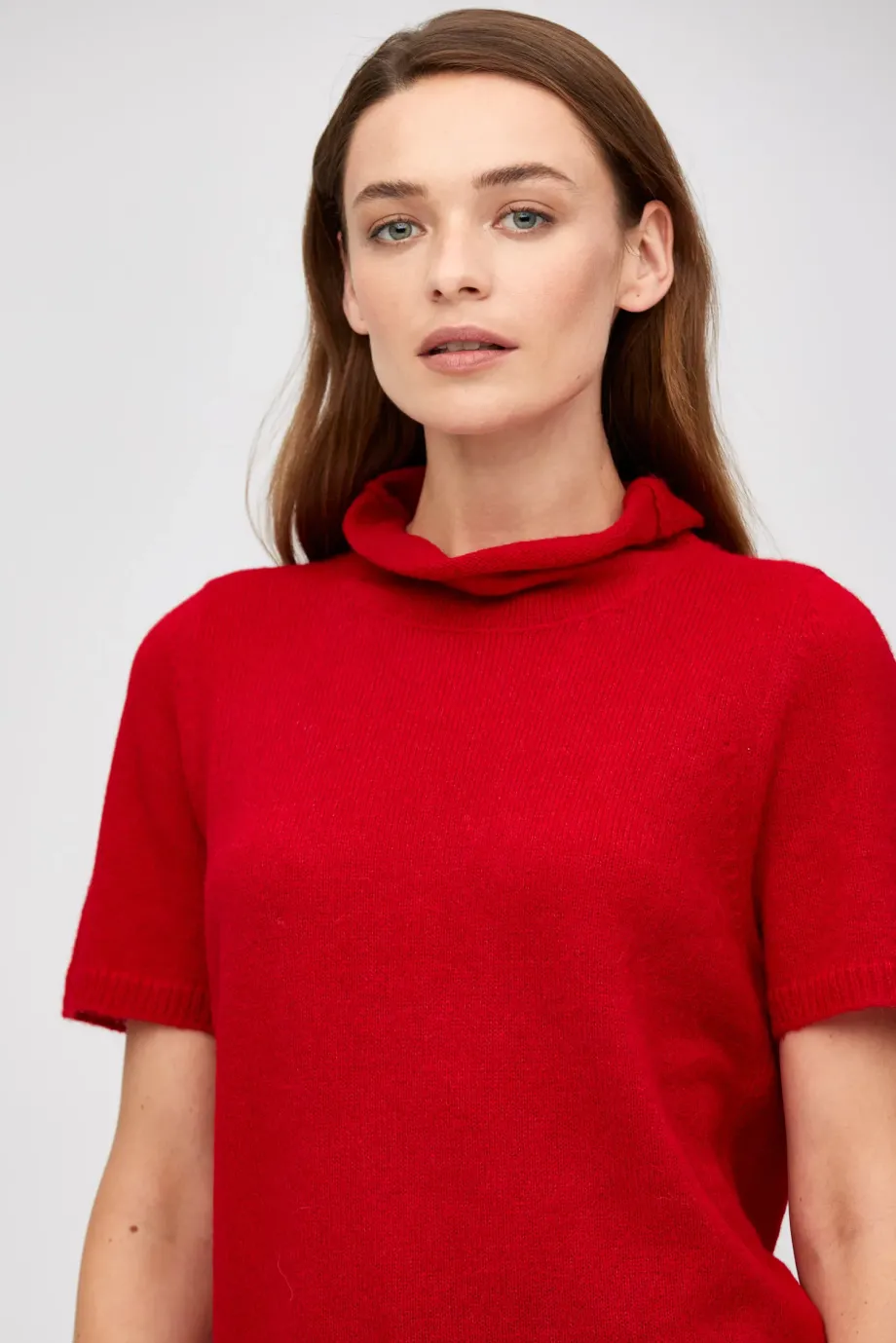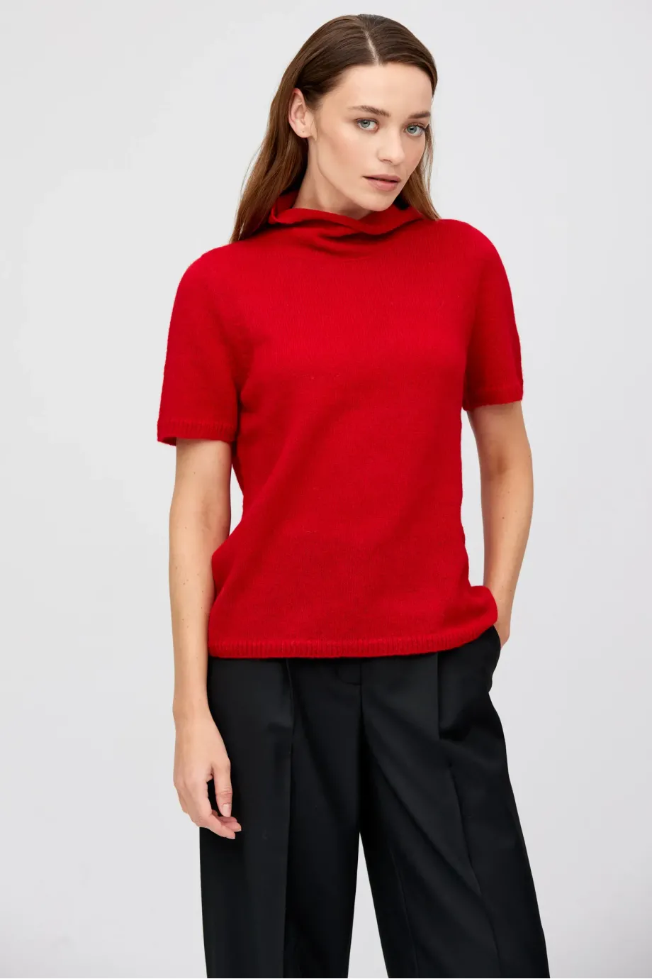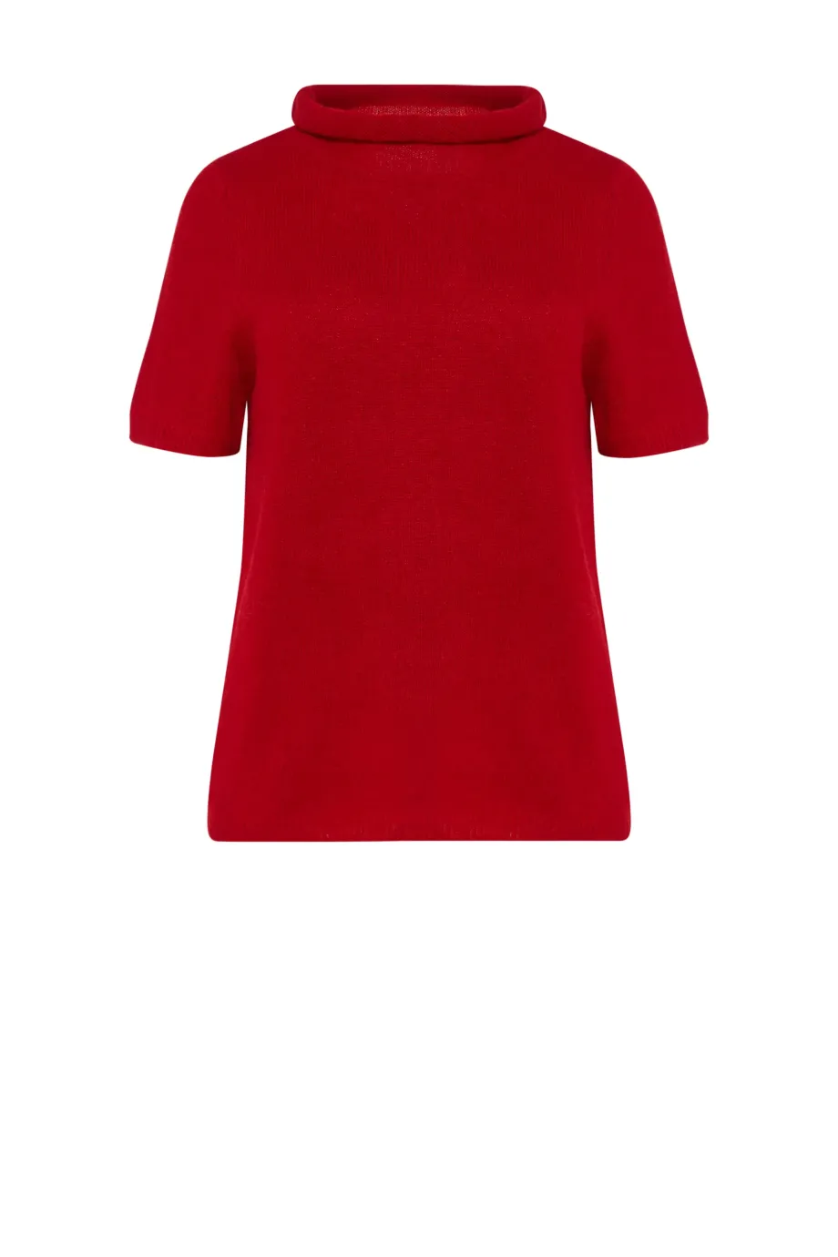 Półgolf z wełną baby alpaki. Krótki rękaw, prosta forma. Miękka, ciepła dzianina o luźnym splocie single jersey, wykonana na maszynie o uigleniu 5 GG. Kolor czerwony.