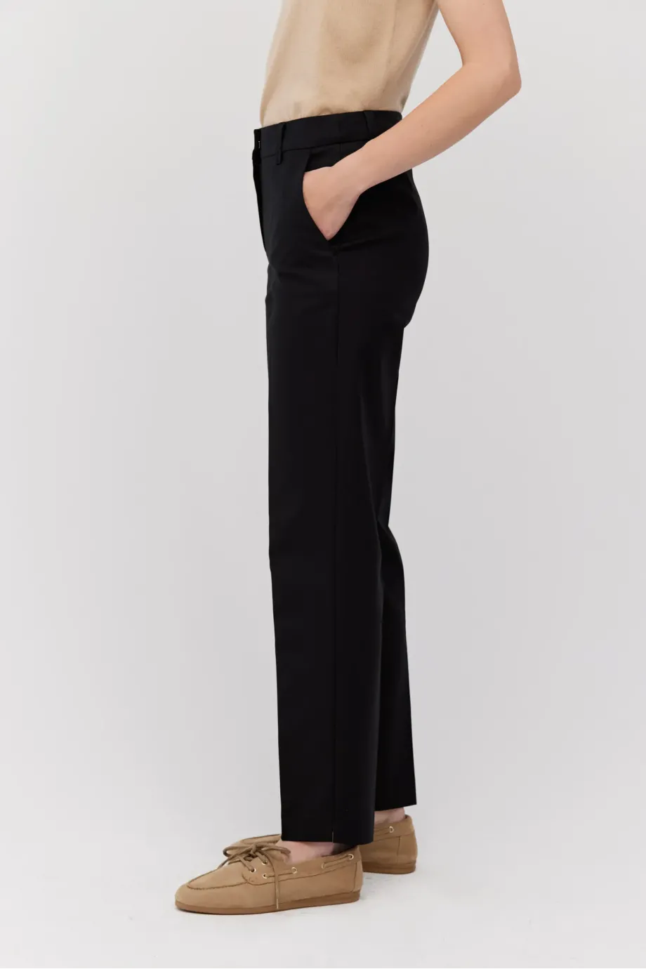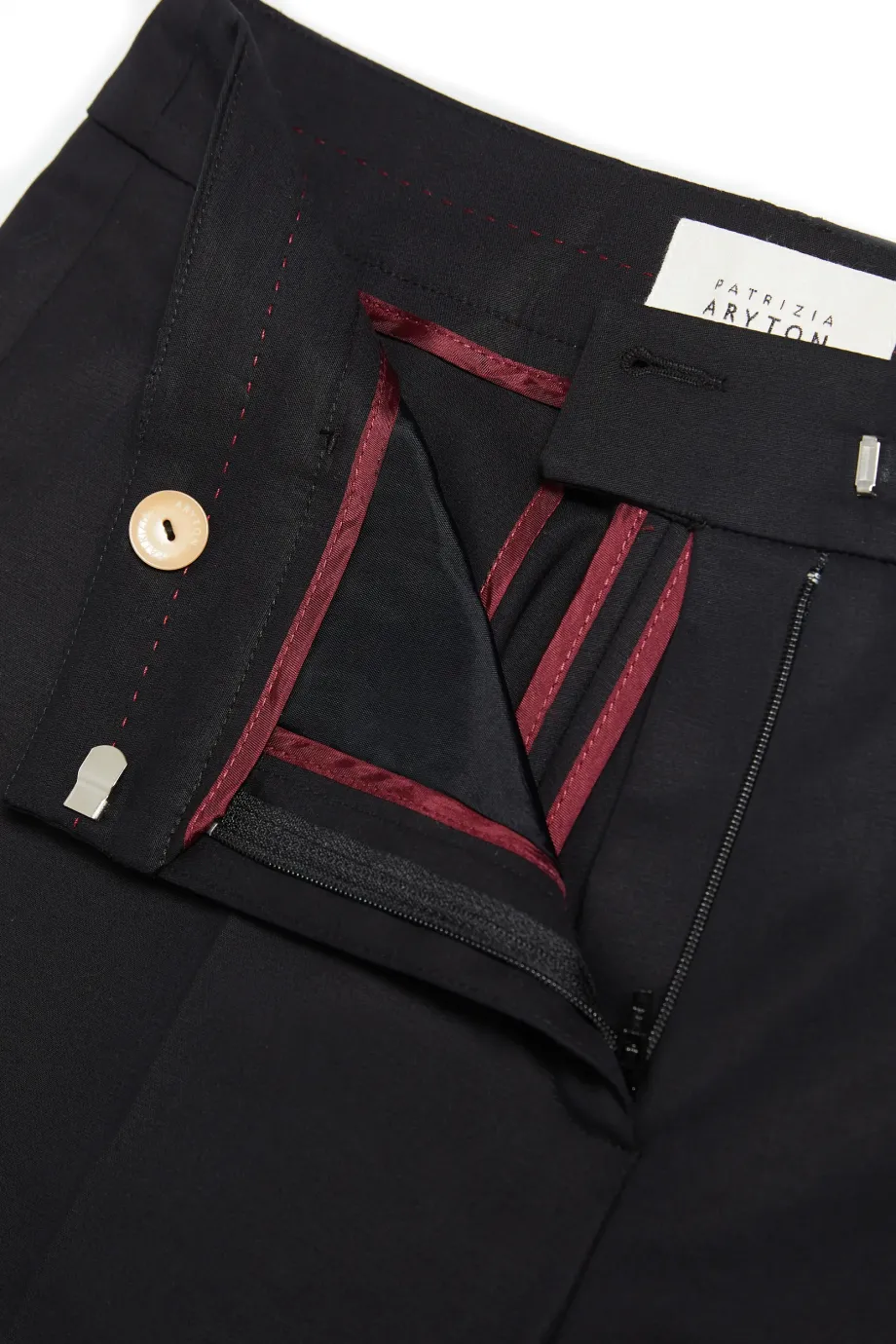 Bawełniane spodnie ze zwężaną nogawką. Zapięcie na suwak, haczyk, guzik od środka. Szlufki, kieszenie. Od środka ozdobne lamówki. Kolor czarny.