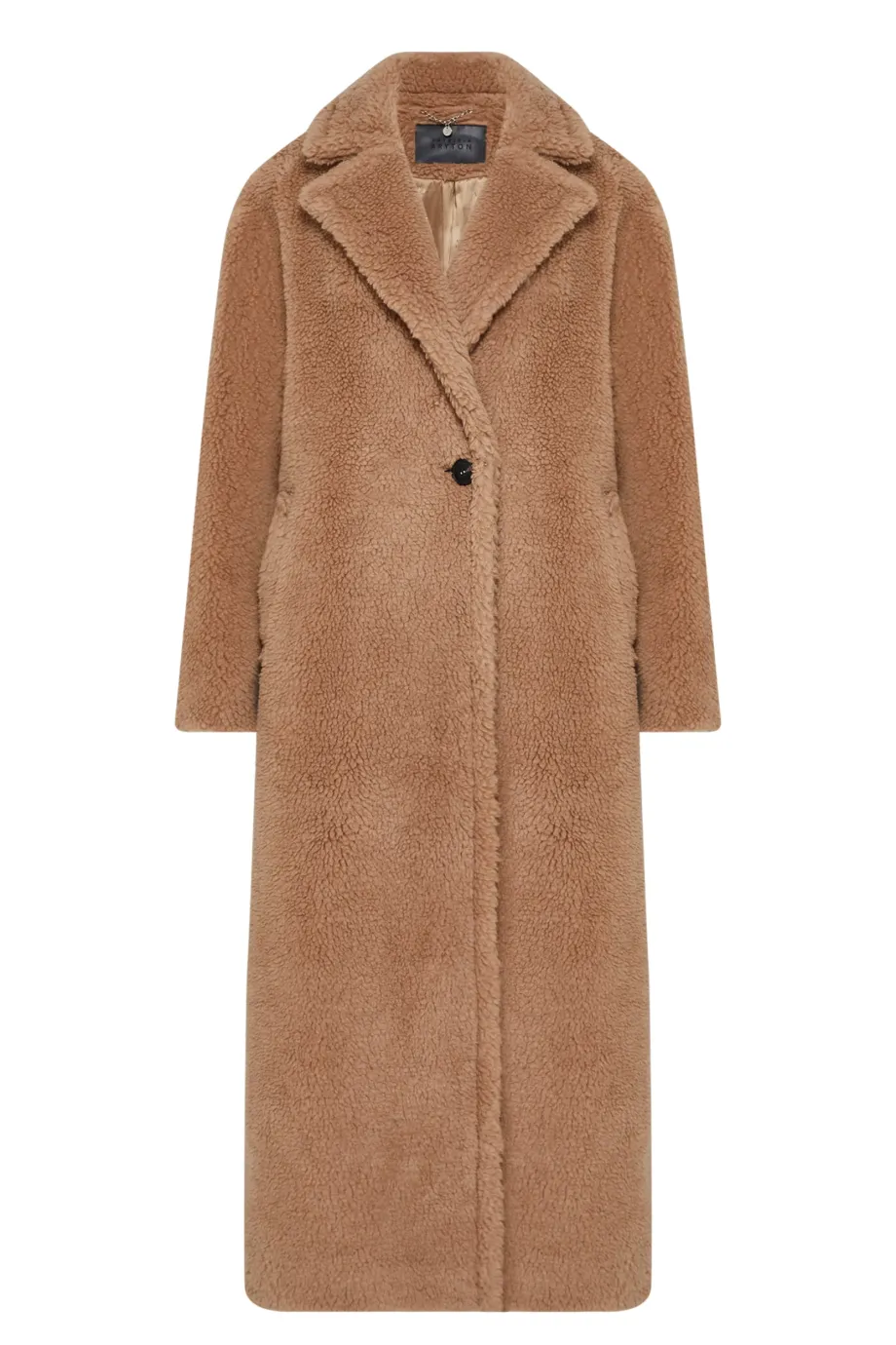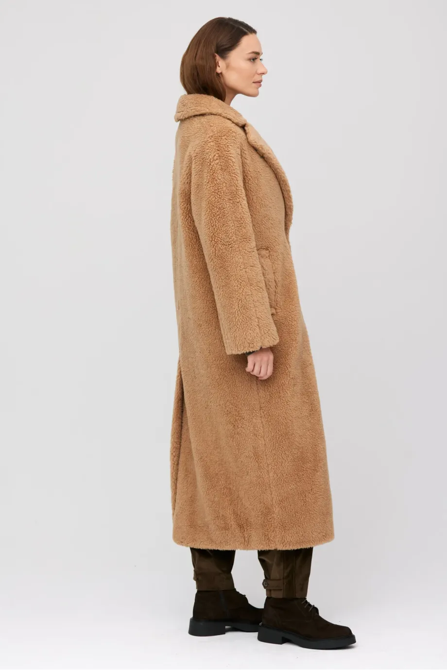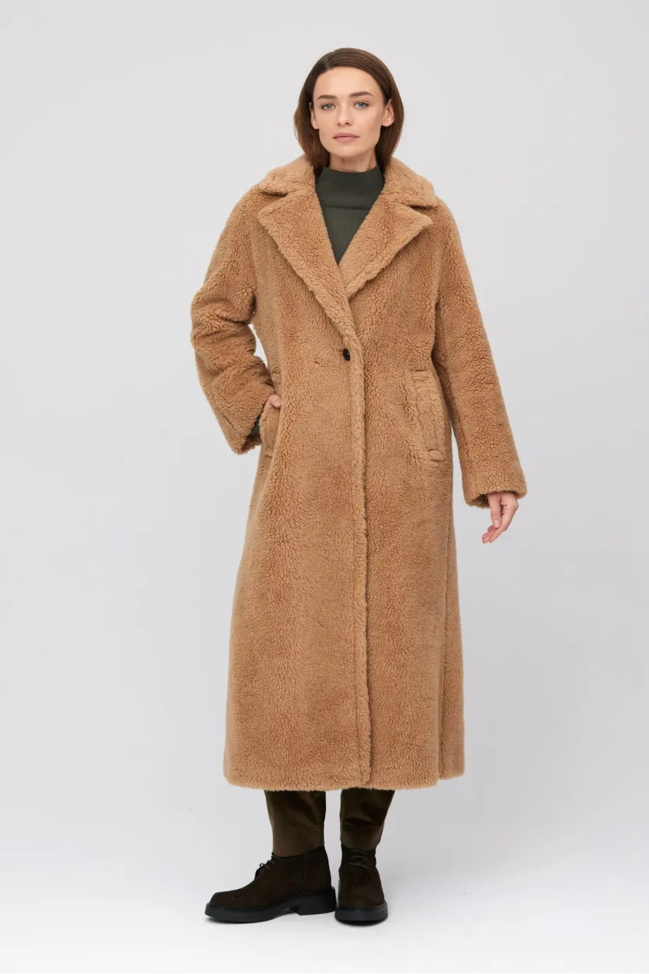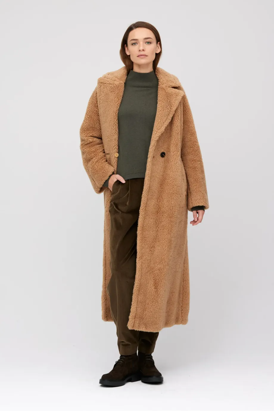 Camelowy płaszcz teddy bear z wełną wielbłądzią i jedwabiem