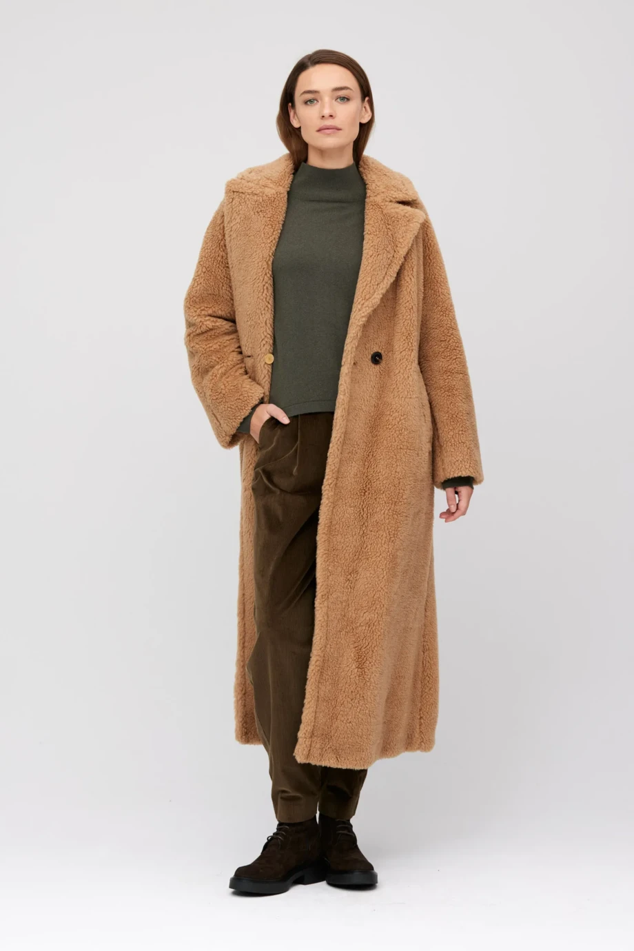 Płaszcz teddy bear z wełną wielbłądzią i jedwabiem. Prosta, luźna forma, długość midi. Model dwurzędowy, zapinany na zewnątrz na guzik z rogu, od środka na guzik z orzecha. Długi rękaw, kołnierz, kieszenie. Kolor camel. Na podszewce.