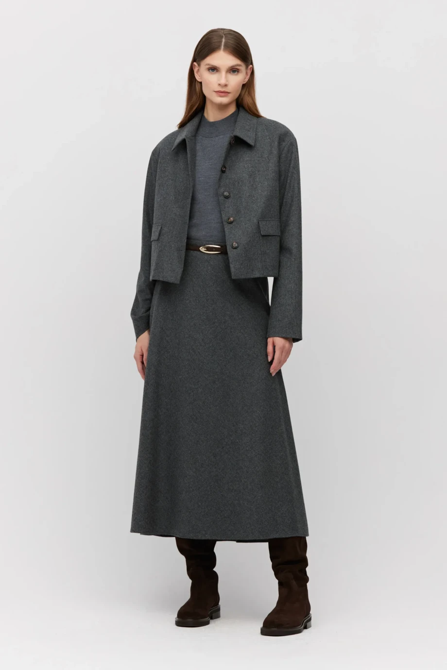 Ciemnoszara spódnica midi na podszewce. Tkanina z domieszką kaszmiru. W talii klasyczna, dół ze skosu. Zapinana na zamek po lewej stronie.