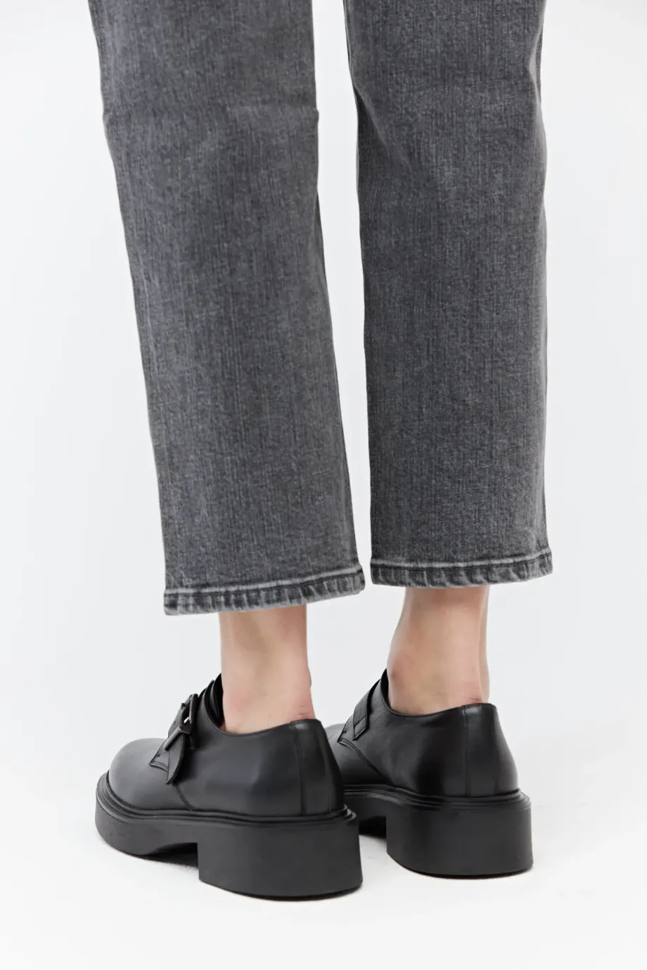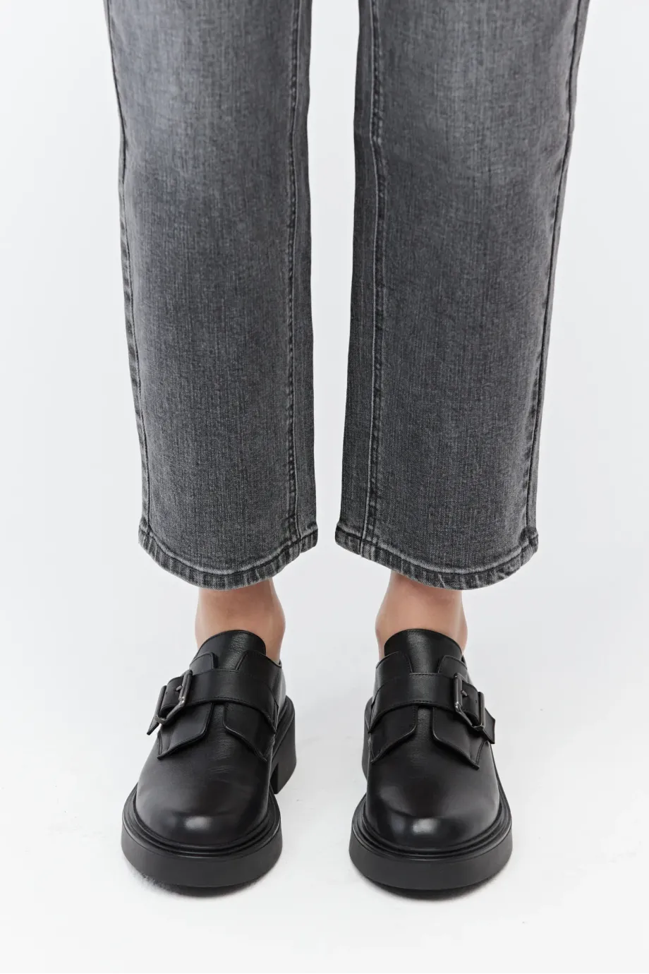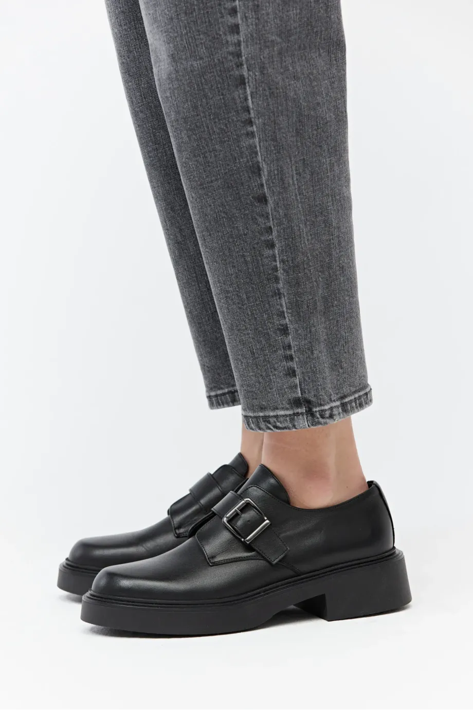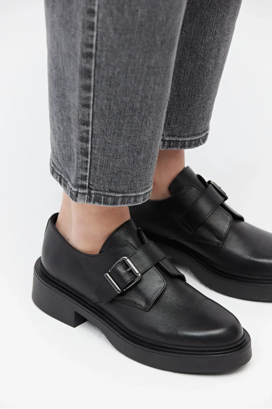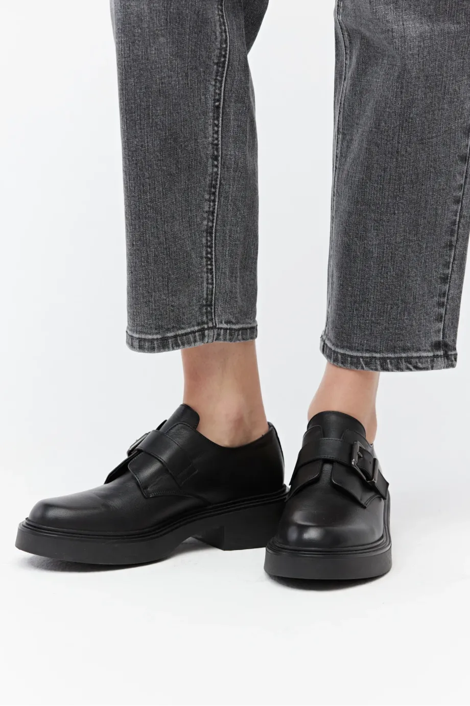 Czarne monk shoes z miękkiej skóry koziej, ręcznie szyte we Włoszech. Klasyczny fason z klamrą i okrągłym noskiem na masywnej podeszwie.
