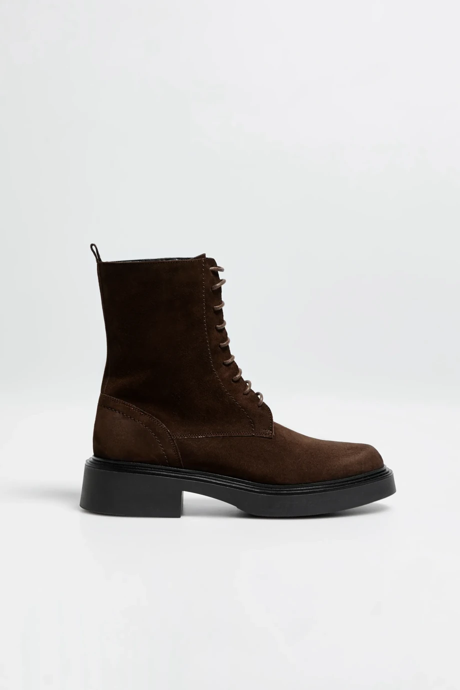 Brązowe botki z miękkiej skóry zamszowej. Sznurowane, z masywną podeszwą i okrągłym noskiem. Uszyte ręcznie we włoskiej manufakturze.
