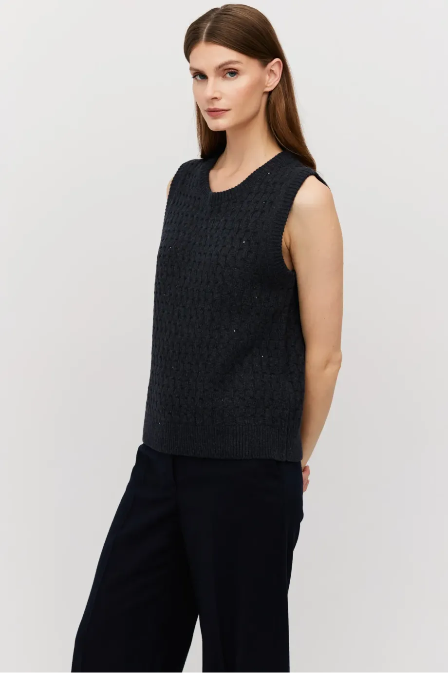 Grafitowa kamizelka z wełny merynosowej. Fason bliżej ciała z okrągłym dekoltem. Dzianina z delikatną lureksową nitką.