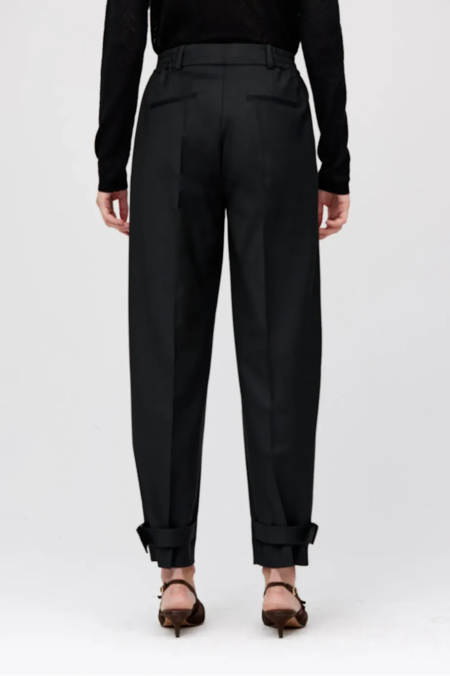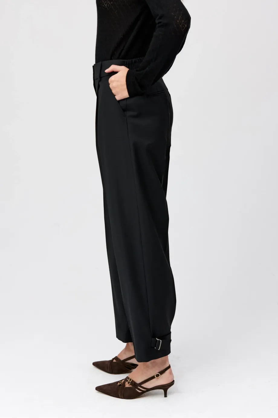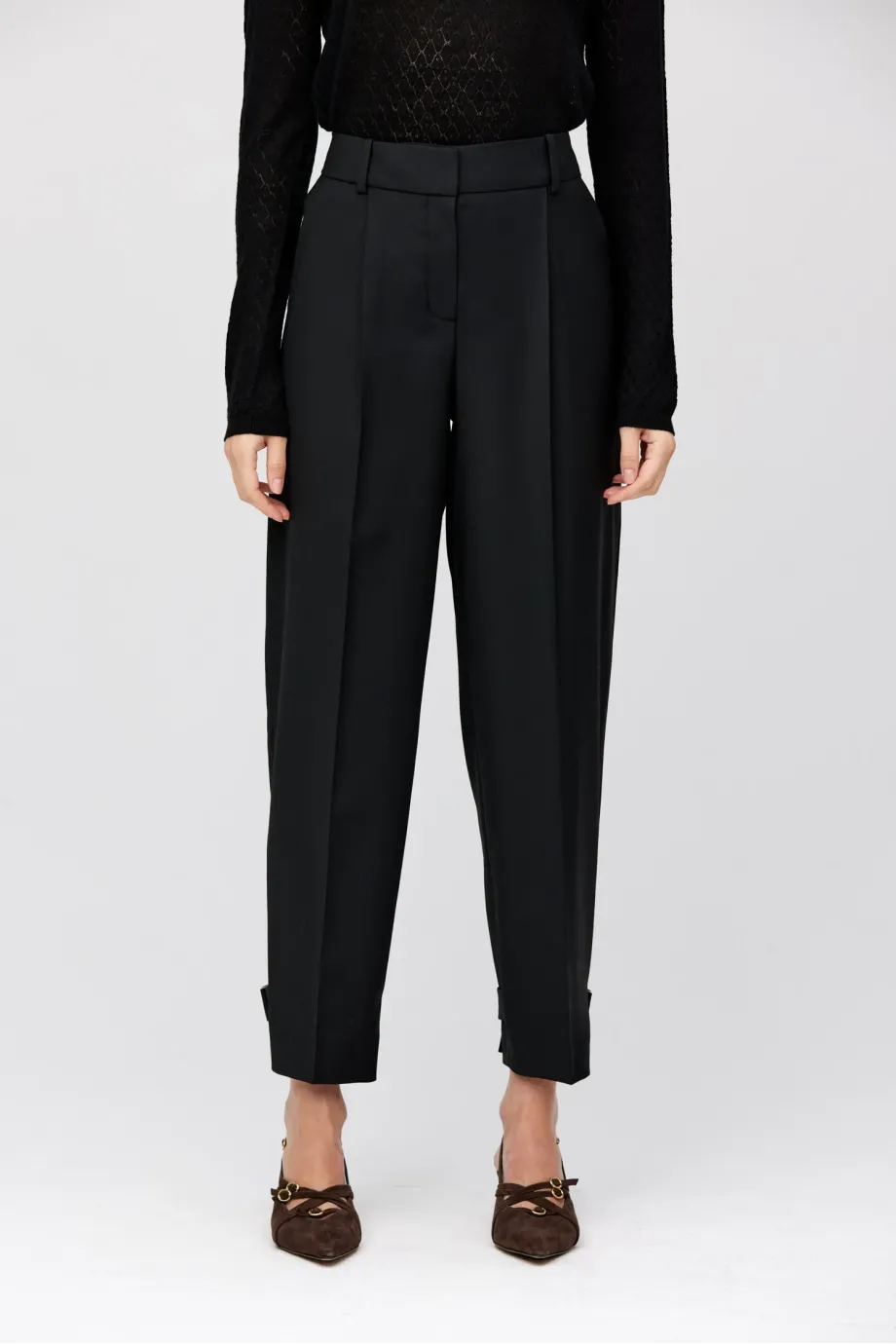 Spodnie z wełną. Kolor czarny. Zwężana nogawka, elastyczna talia z tyłu. Boczne kieszenie, wewnętrzne wykończenia ozdobne. Zapięcie na stalowy haczyk i guzik z naturalnego orzecha corozo.