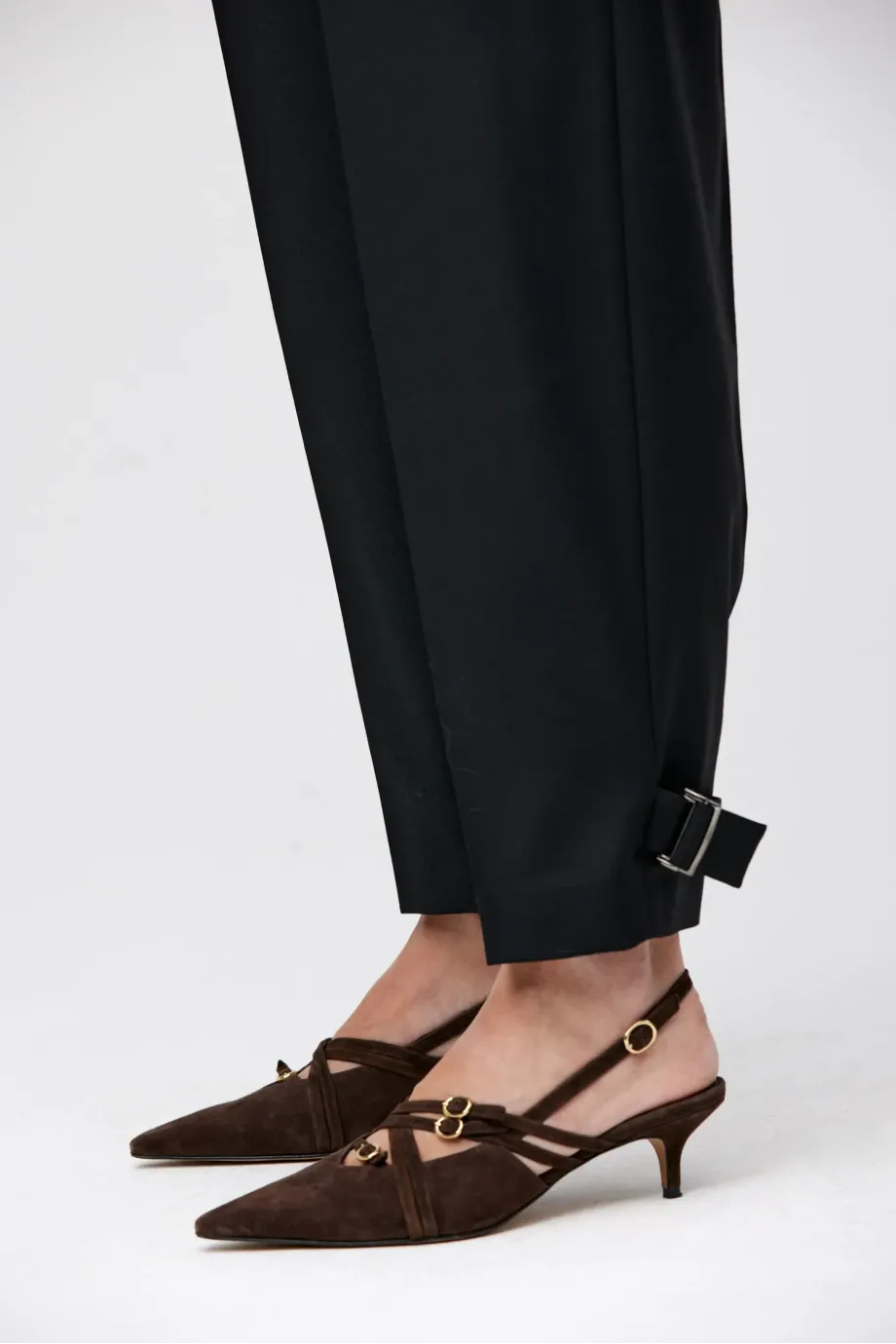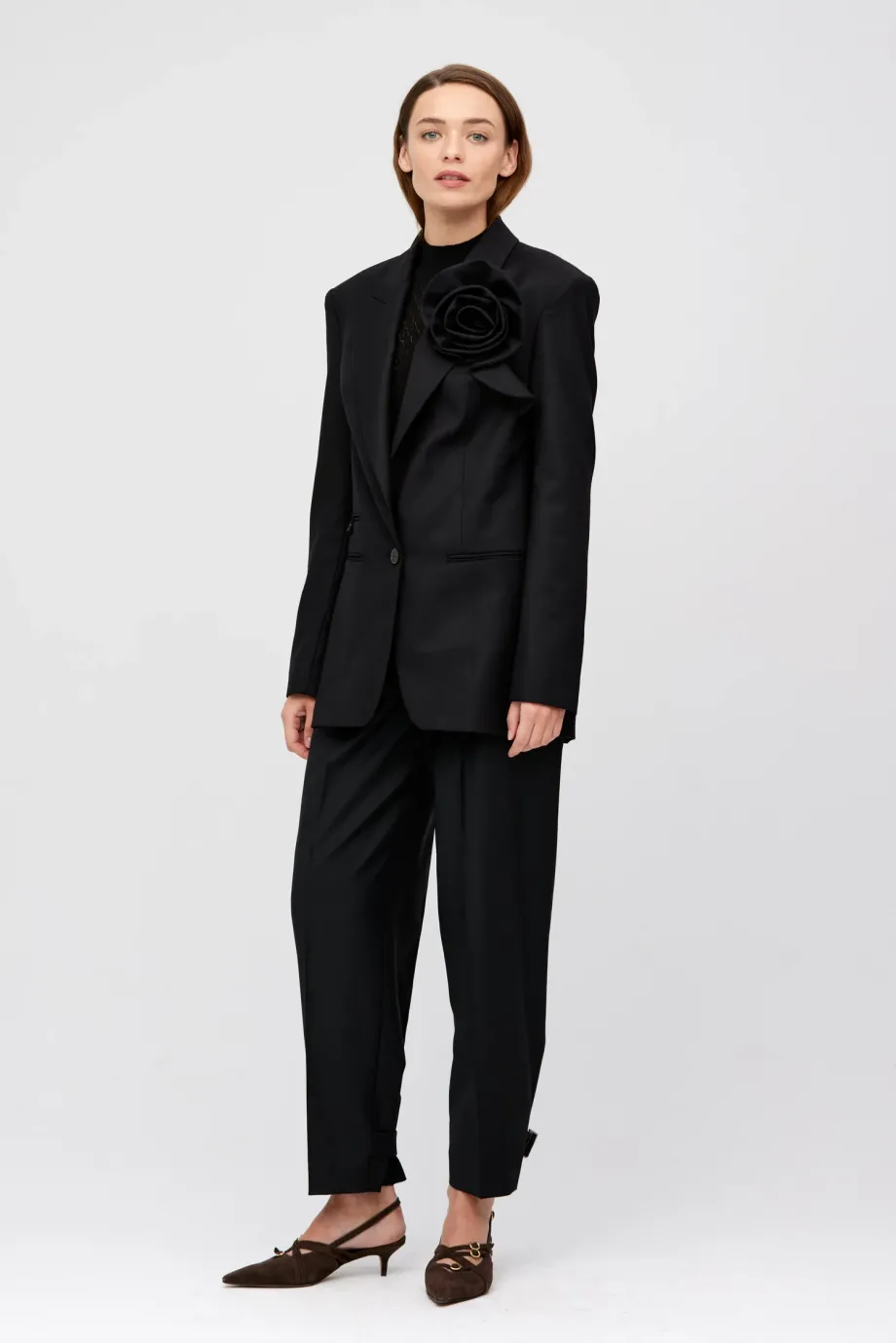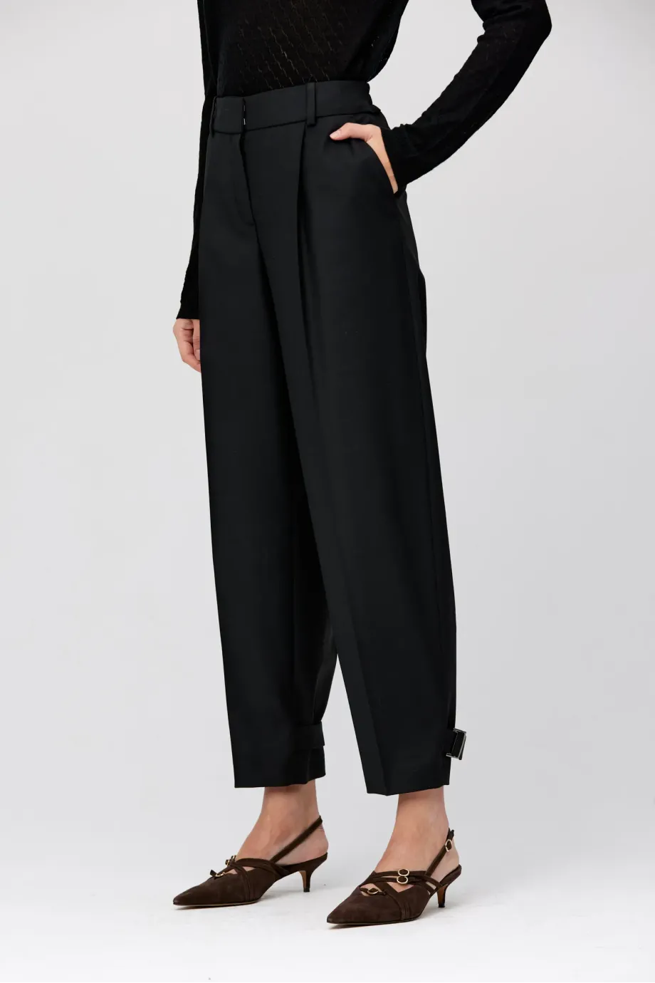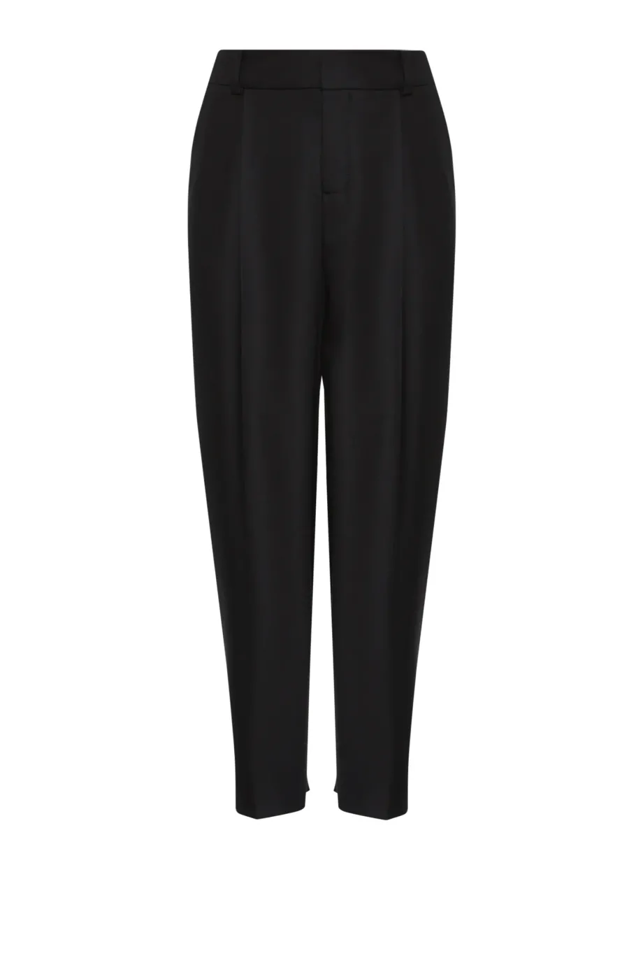 Spodnie z wełną. Kolor czarny. Zwężana nogawka, elastyczna talia z tyłu. Boczne kieszenie, wewnętrzne wykończenia ozdobne. Zapięcie na stalowy haczyk i guzik z naturalnego orzecha corozo.