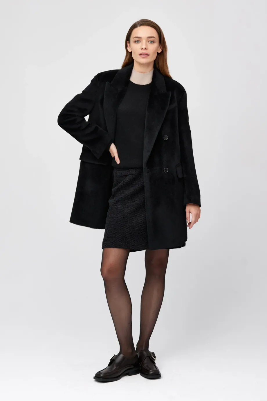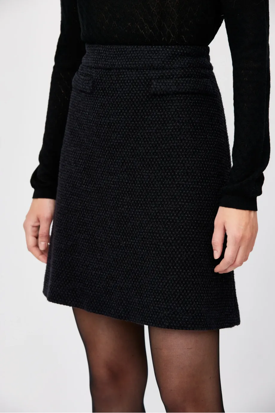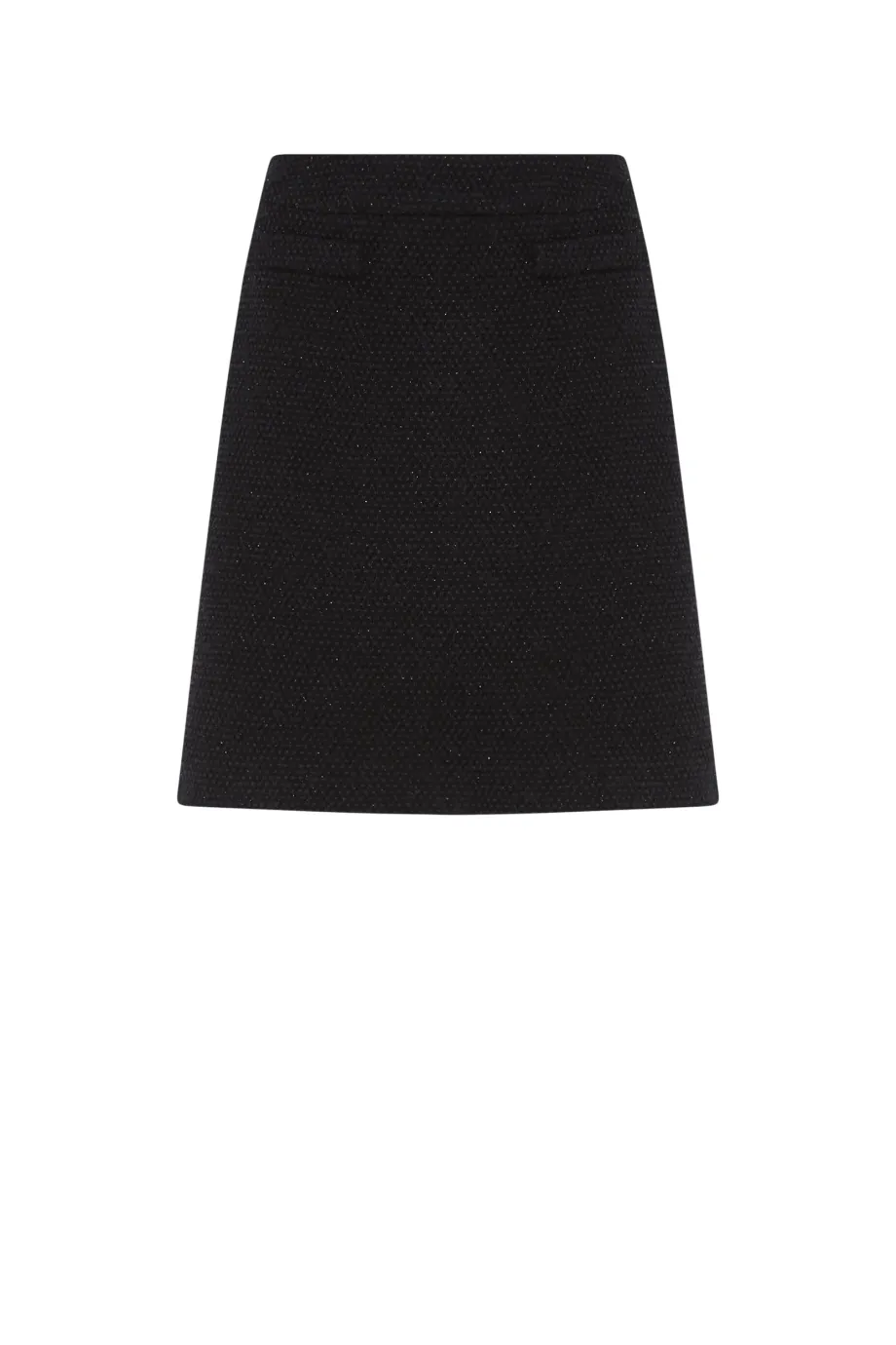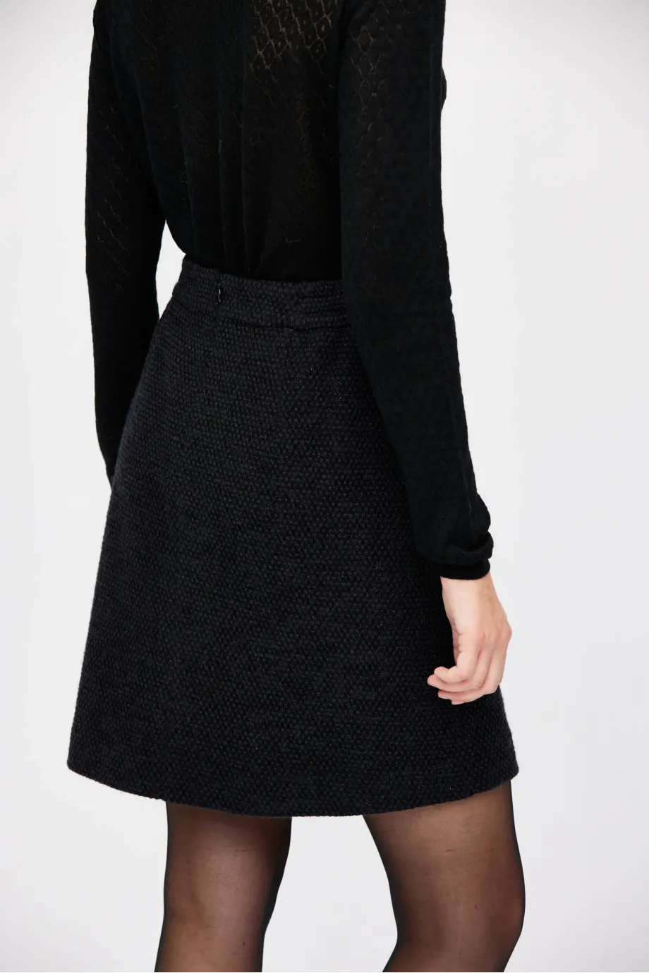 Czarna spódnica mini na podszewce. Tkanina z domieszką wełny. Gumka w talii.