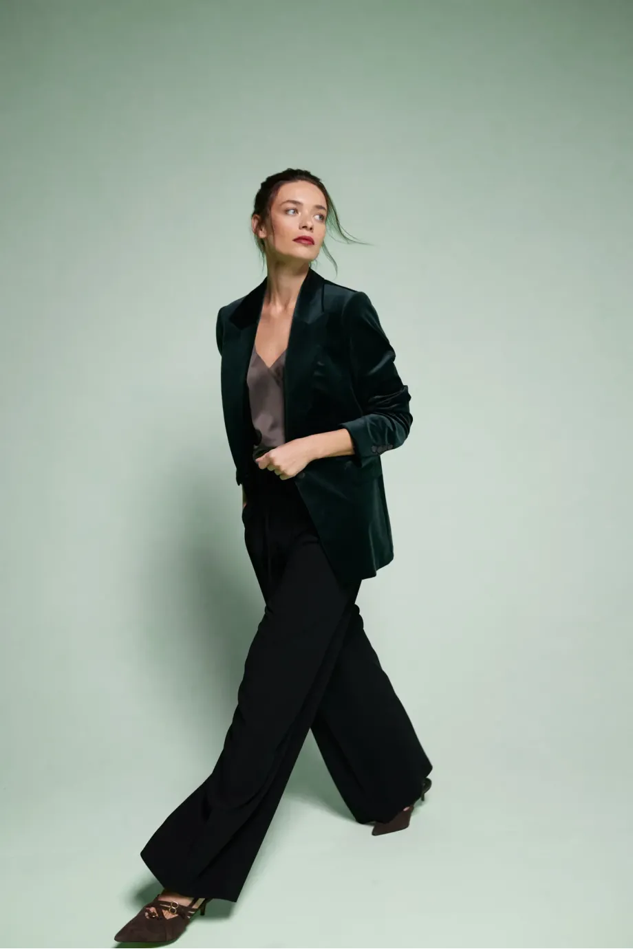 Żakiet jednorzędowy, z aksamitnej tkaniny. Fason lekko taliowany, długi rękaw, zapięcie na guzik z rogu naturalnego. Kieszenie. Model na podszewce, z ozdobnym stebnowaniem i pipingiem od środka. Kolor zielony.
