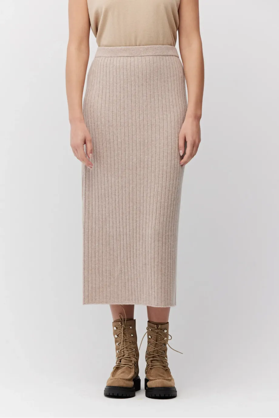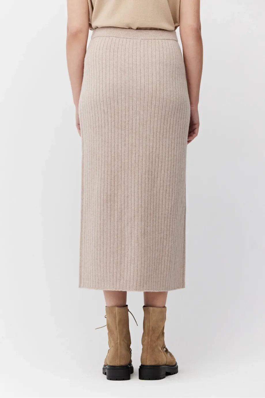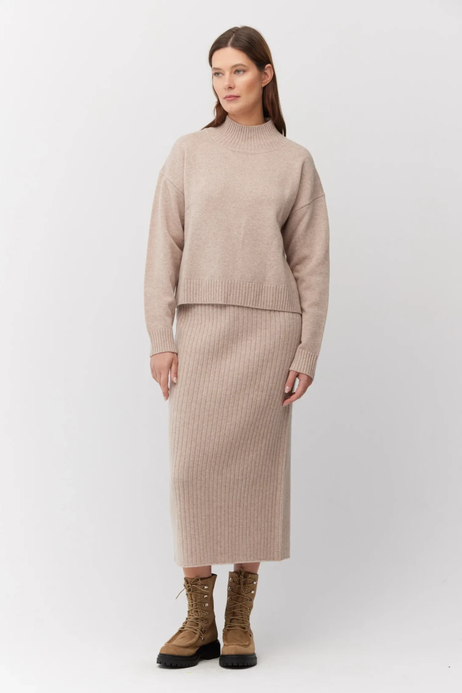 Spódnica z wełny merynosowej. Miękka dzianina o splocie rib, wykonana na maszynie o uigleniu 7 GG. Fason bliżej ciała, długość midi. Kolor beż. Do uzupełnienia zestawu sweter.