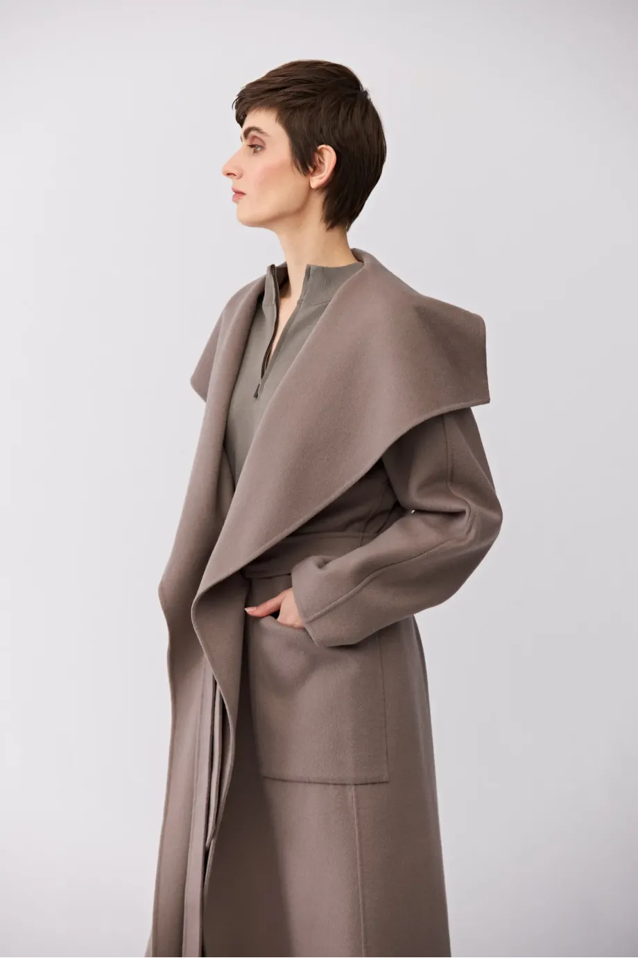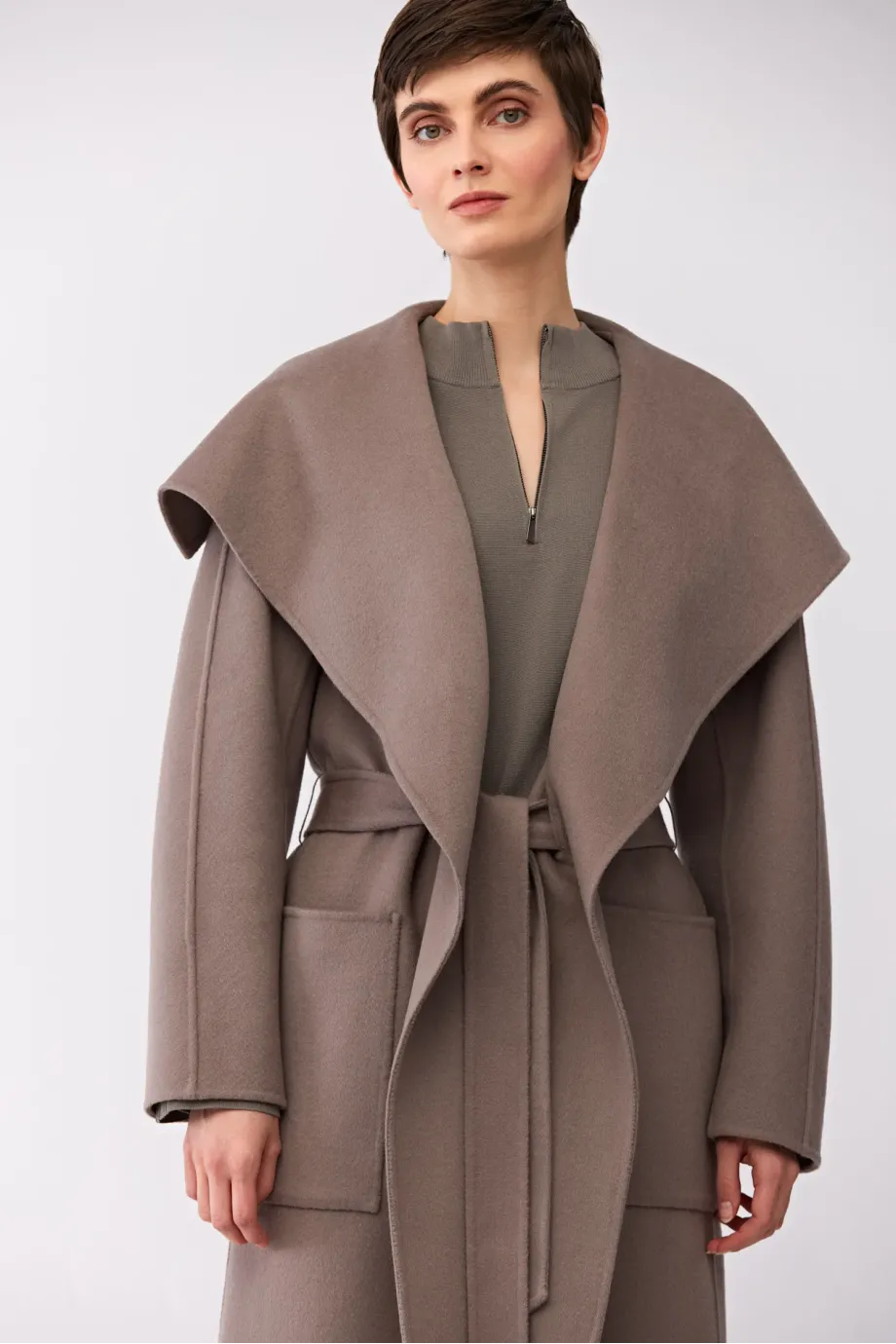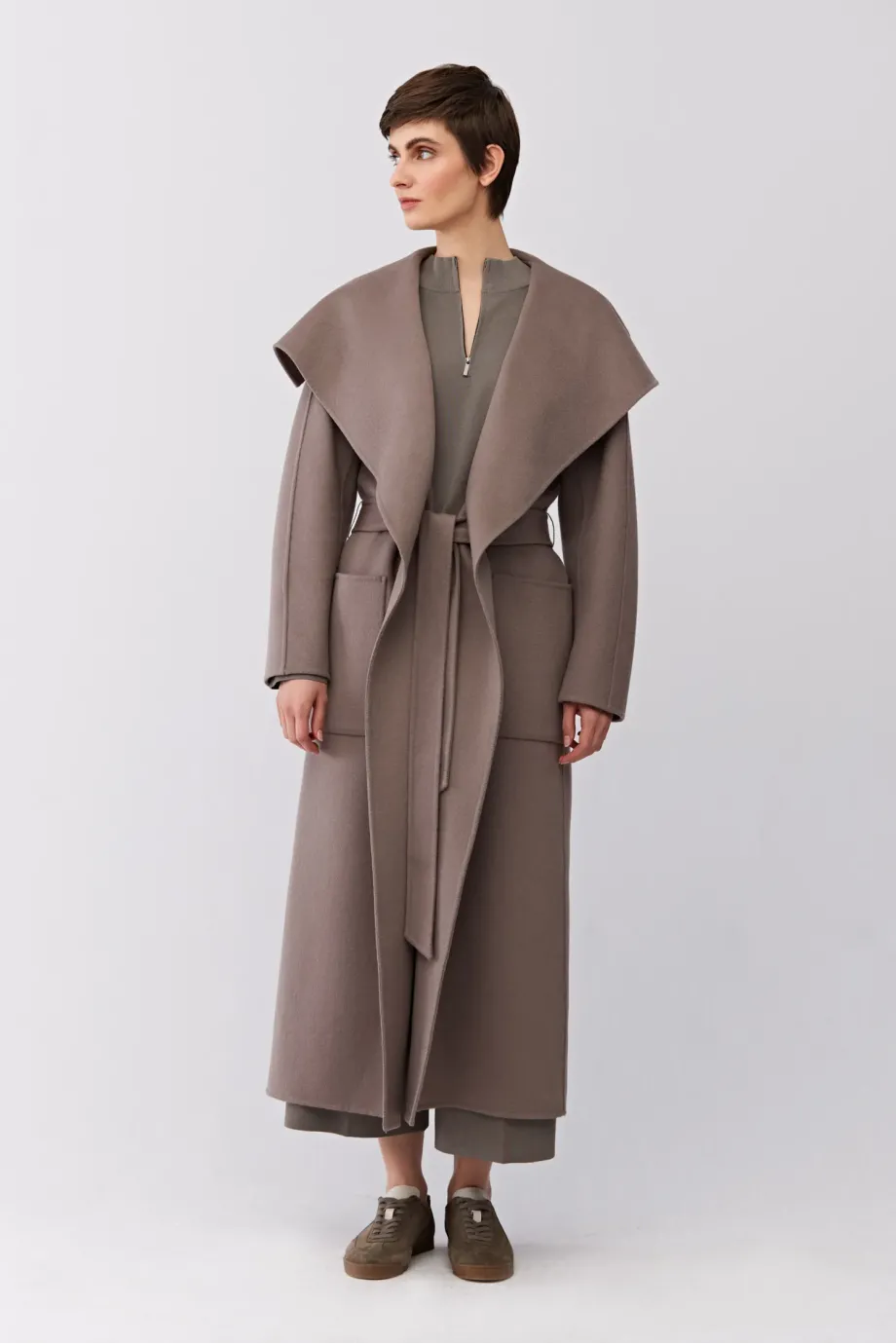 Płaszcz z jedwabiem doubleface. Duzy kołnierz, długi rękaw kimono. Kieszenie. Zapięcie na pasek. Długość midi. Kolor taupe.