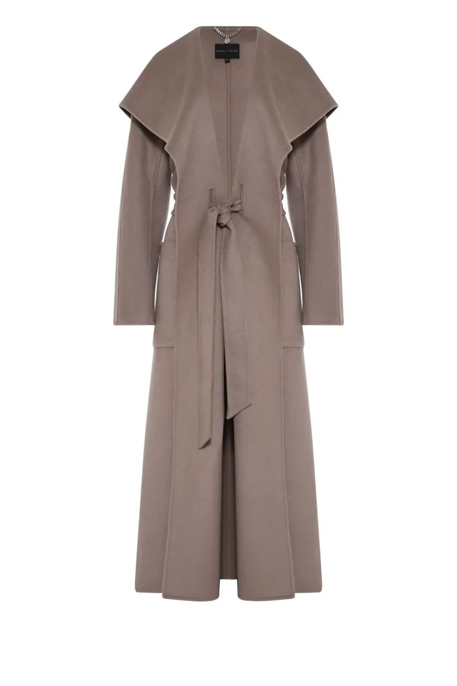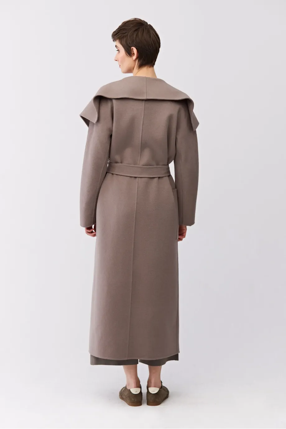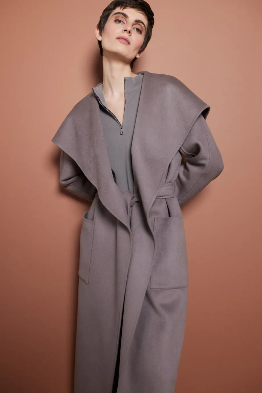 Płaszcz z jedwabiem doubleface. Duzy kołnierz, długi rękaw kimono. Kieszenie. Zapięcie na pasek. Długość midi. Kolor taupe.