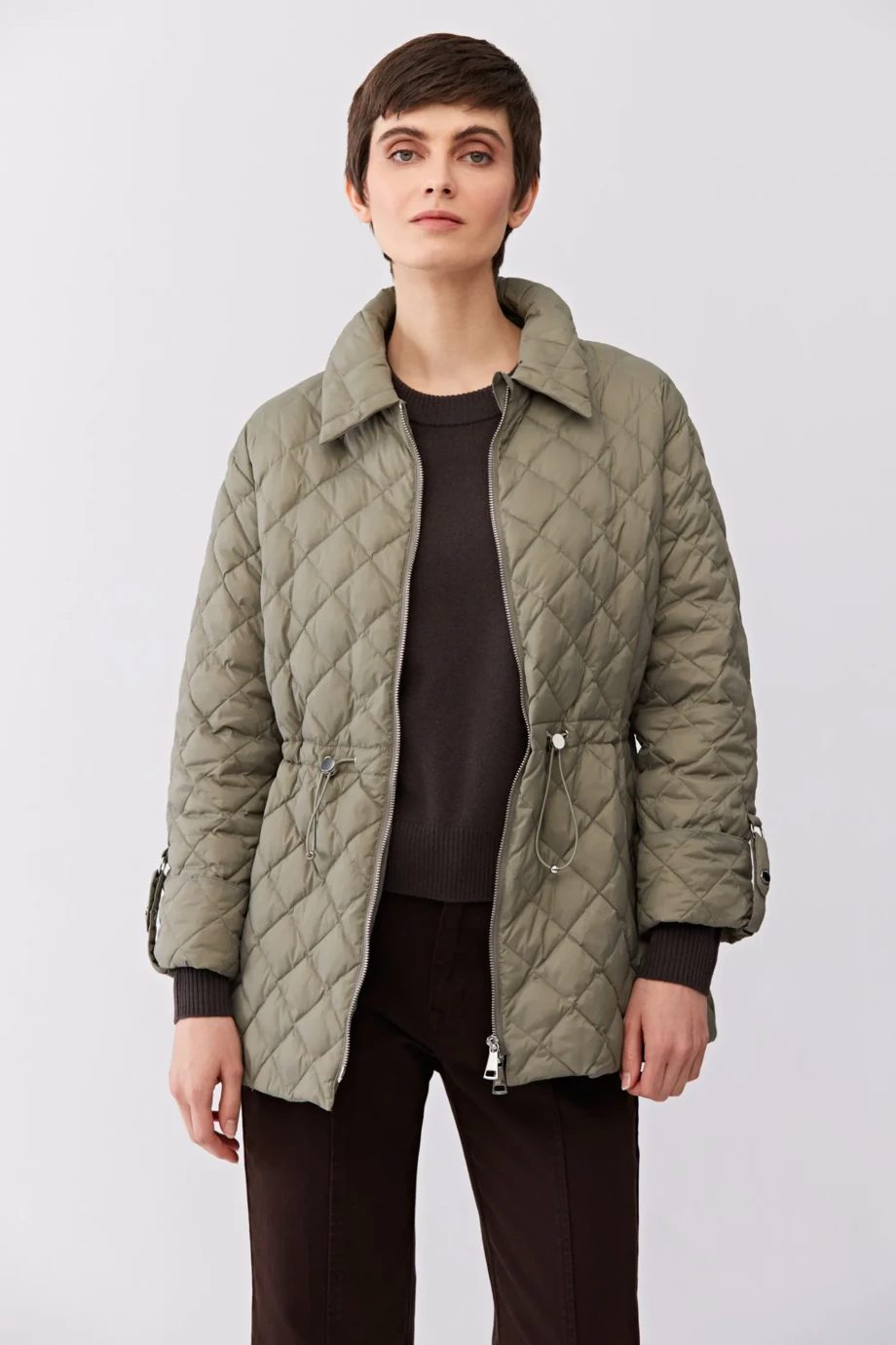Kurtka puchowa z kołnierzem. Zapięcie na suwak. Długi rękaw z możliwością podpięcia. Regulacja talii. Kieszenie. Kolor jasna zieleń.