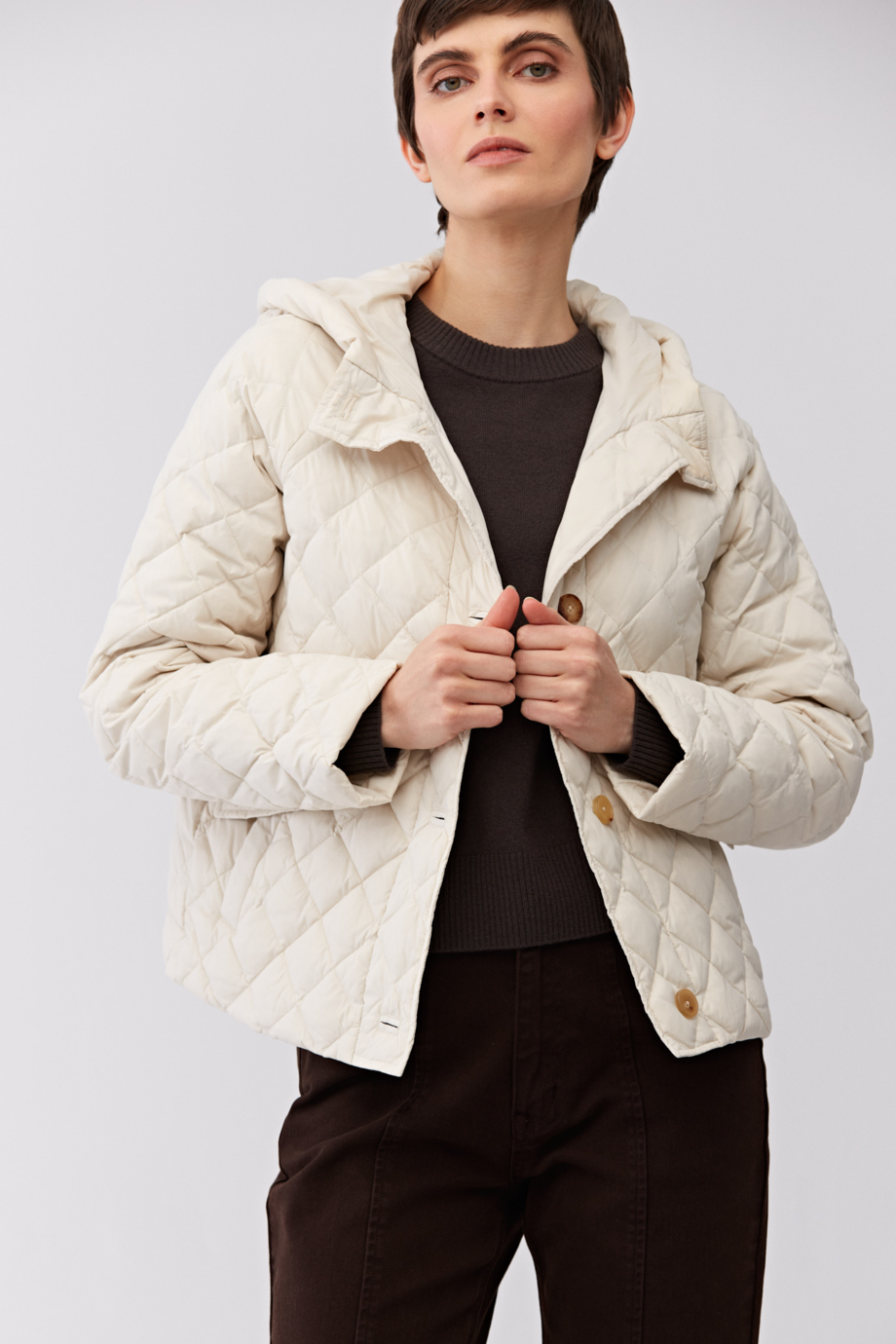 Beżowa puchowa kurtka z kapturem. Naturalne wypełnienie. Długi rękaw. Zapięcie na guziki. Kieszenie. Fason prosty, krótki. Model lekki i ciepły.