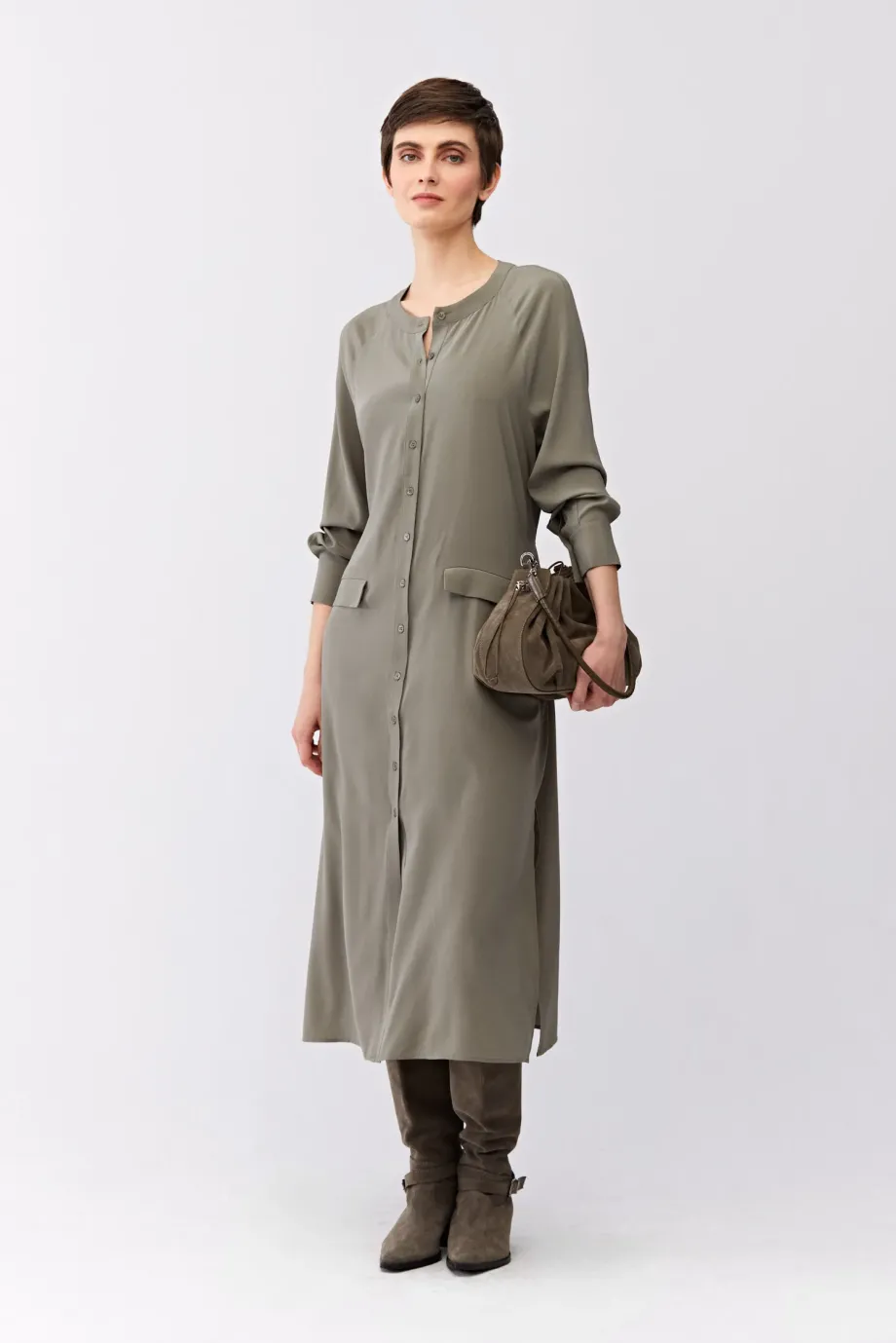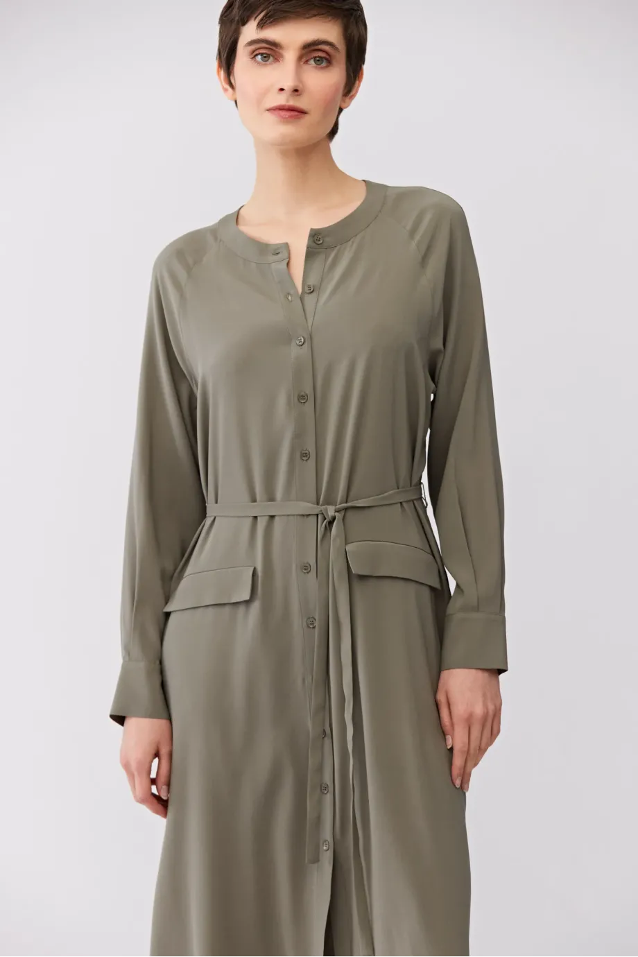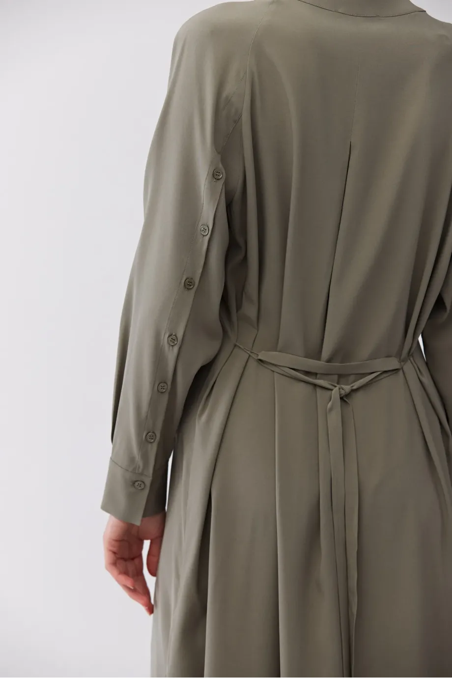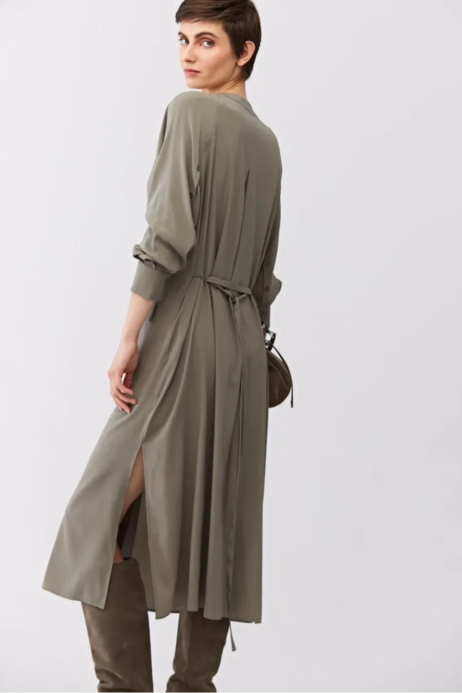 Zielona sukienka z jedwabiu. Prosta forma, z rozcięciami po bokach, długi rękaw. Pasek. Zapięcie na guziki. Długość midi.